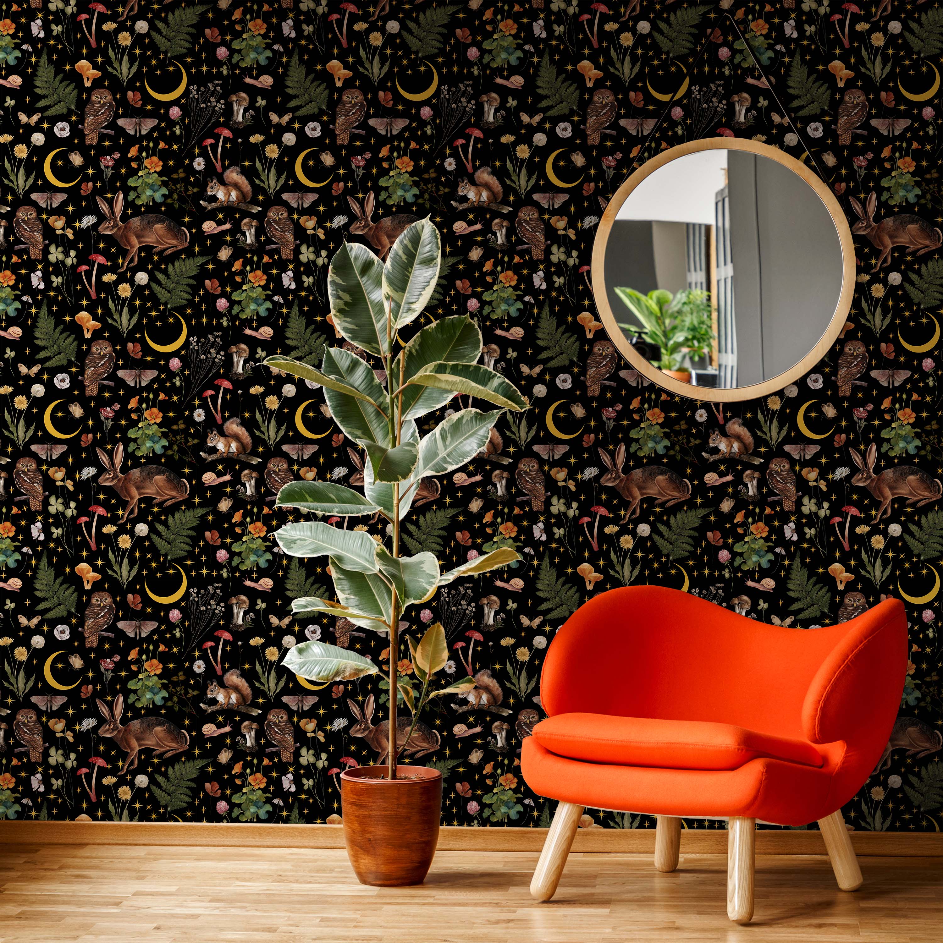 Enchanting wallpaper featuring an intricate nature-inspired design with woodland creatures, botanical elements, and celestial motifs set against a striking black backdrop. Perfect for creating sophisticated, immersive interiors with dramatic visual depth.