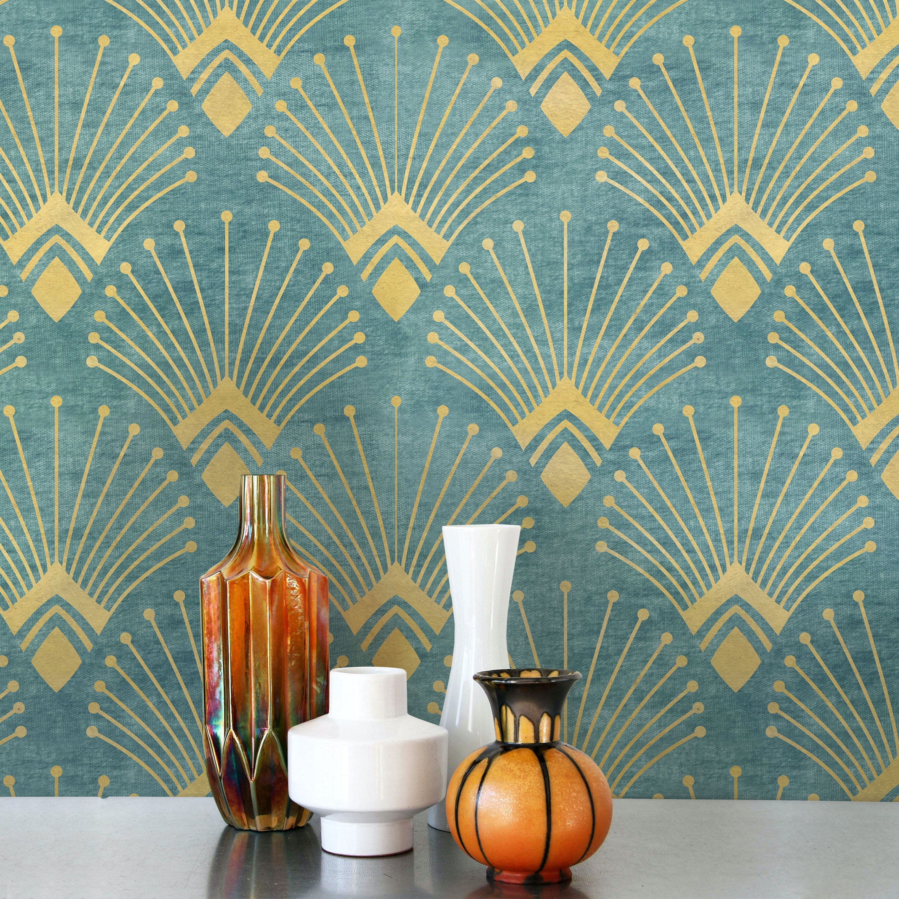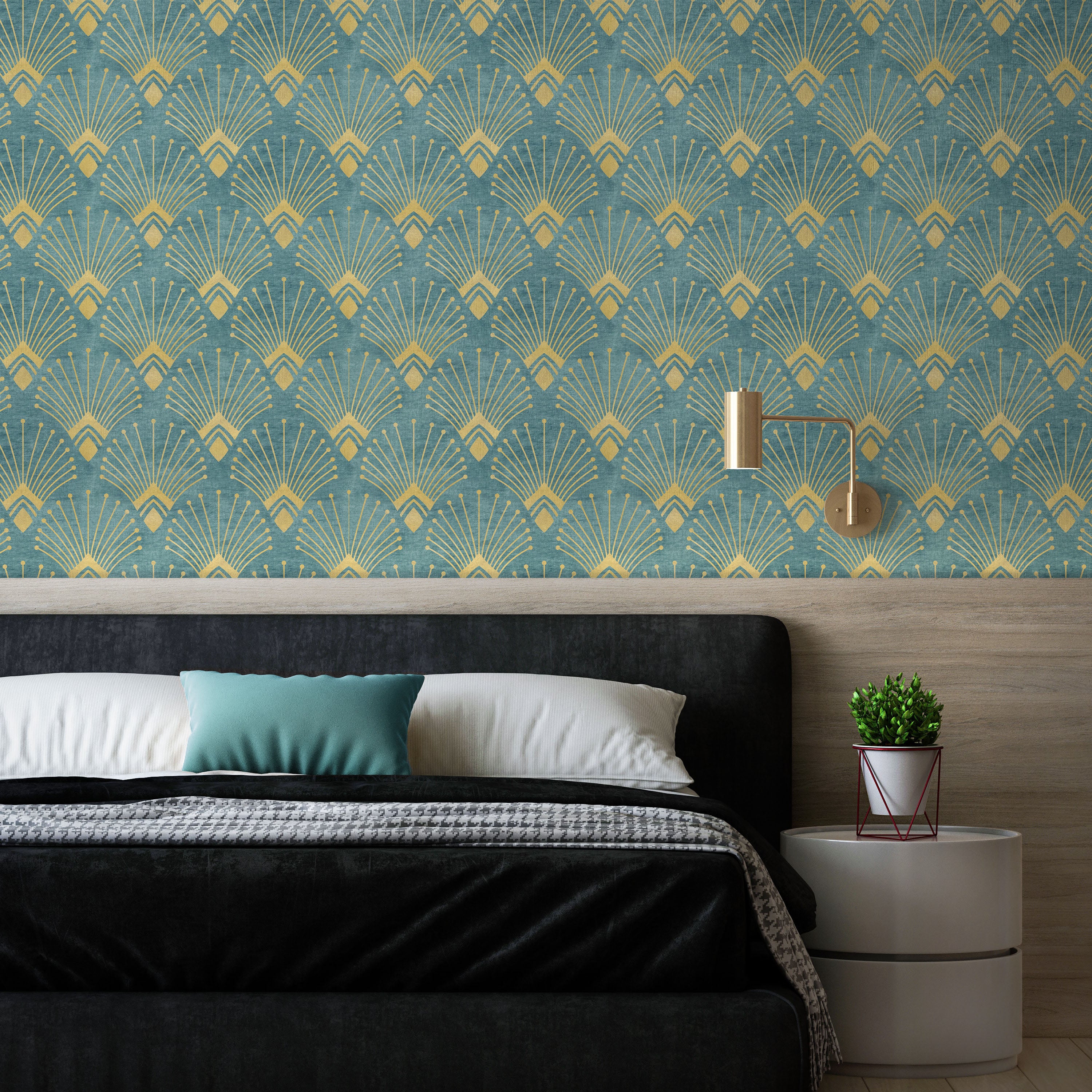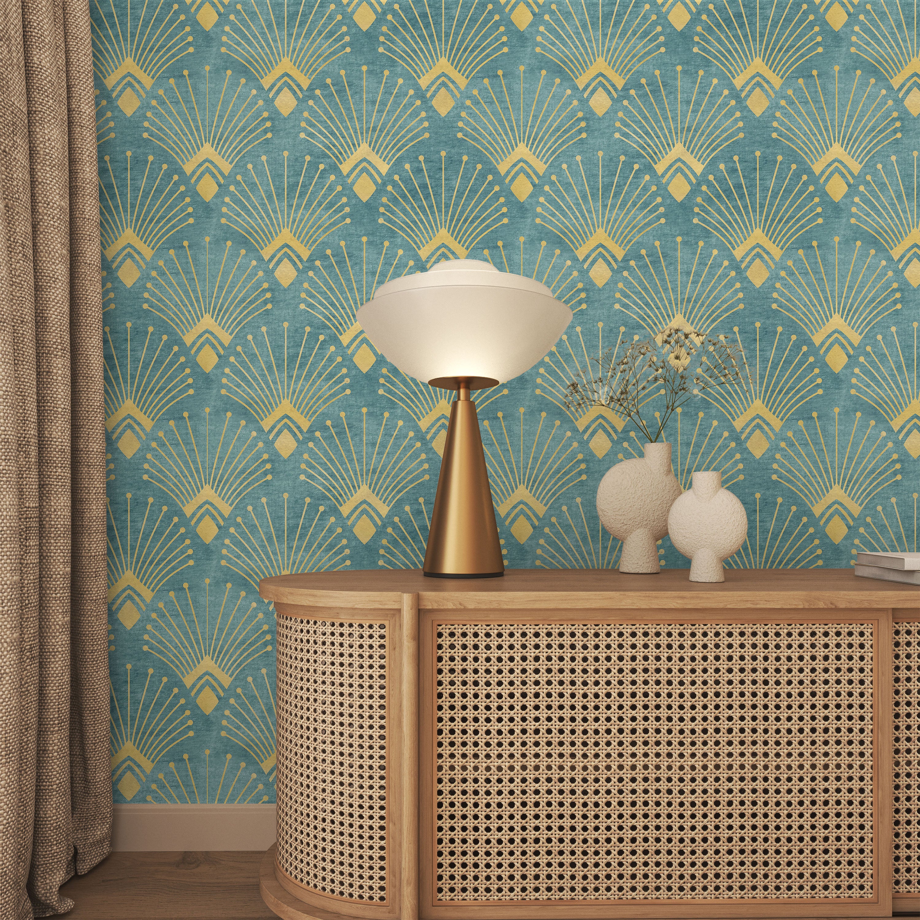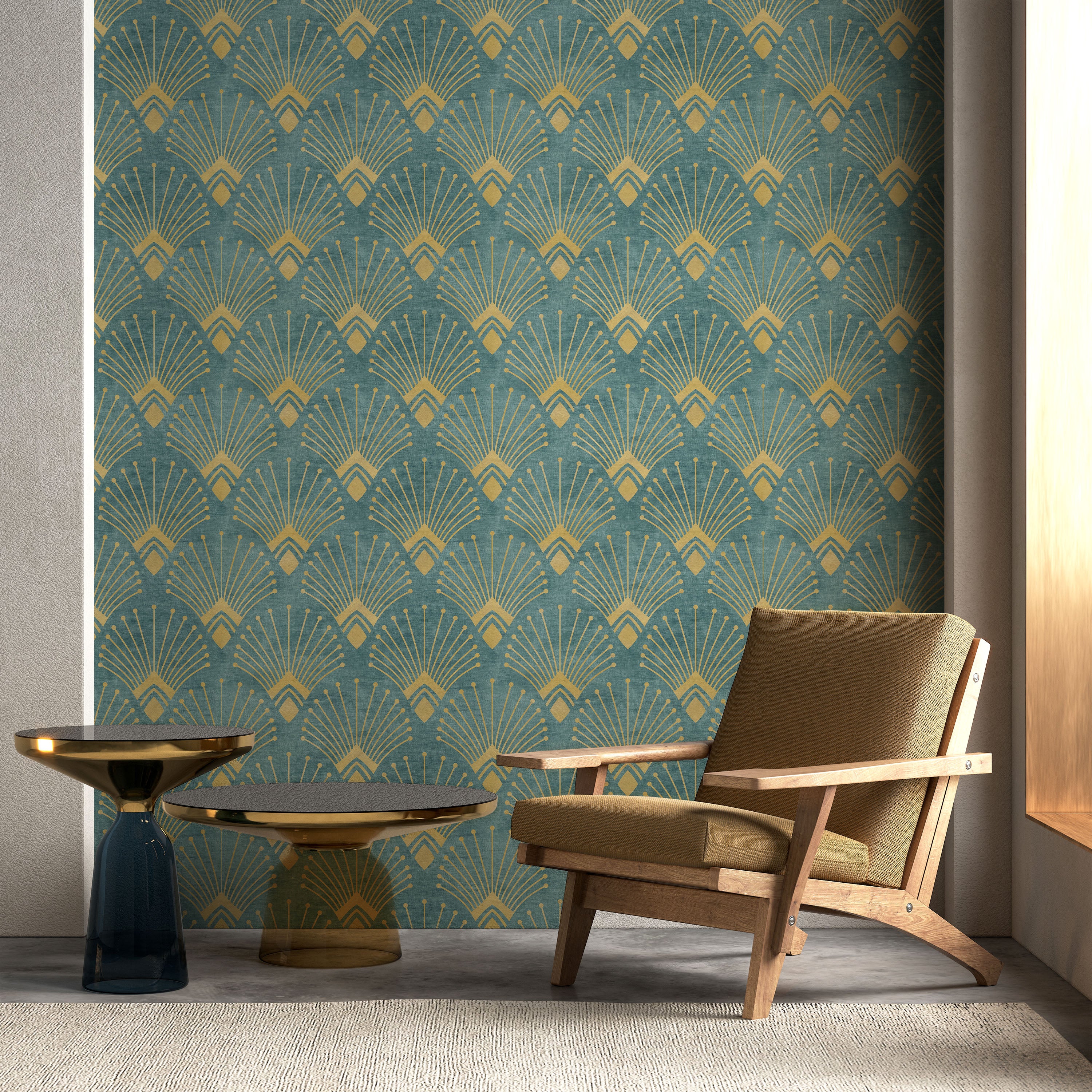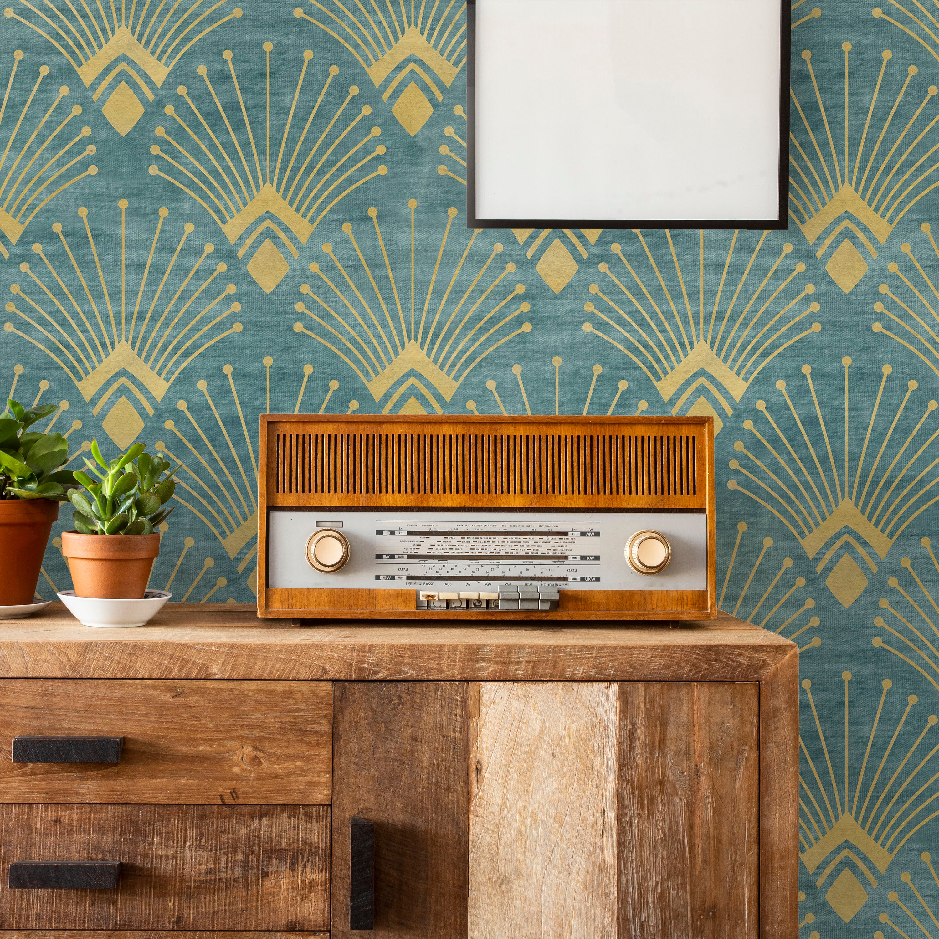 Sophisticated patterned fabric featuring striking gold geometric rays against a rich teal backdrop. This Art Deco-inspired design brings contemporary elegance and visual depth to any interior space, perfect for accent walls or upholstery projects.