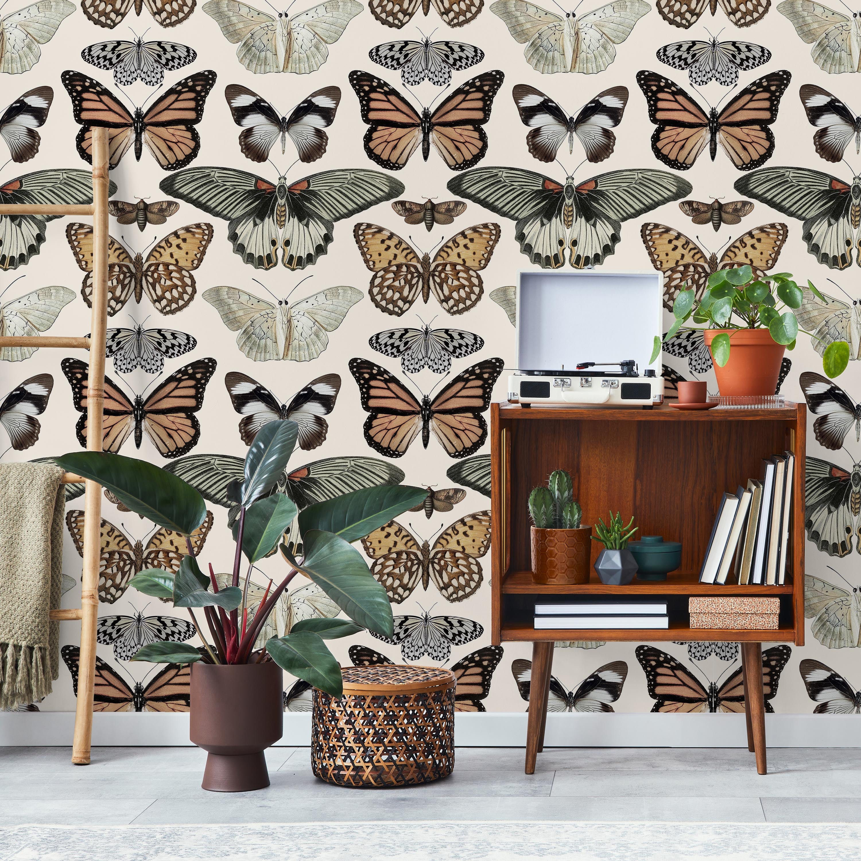 Timeless wallpaper featuring an elegant assortment of butterfly motifs rendered in soft, naturalistic detail against a serene light backdrop. Perfect for creating a sophisticated, nature-inspired aesthetic in any room while maintaining visual tranquility and refined style.