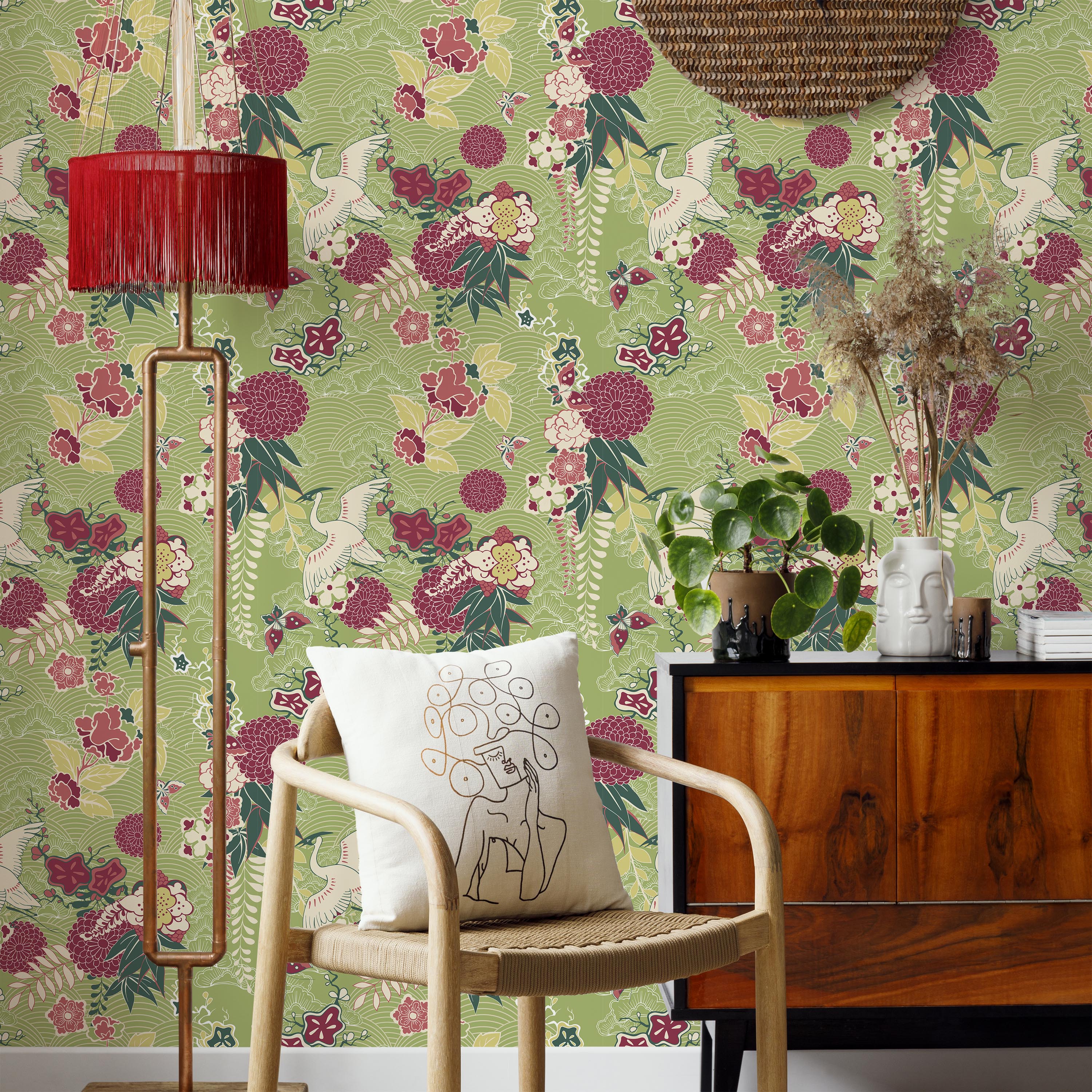 Transform your walls with this expertly crafted wallpaper showcasing delicate florals and birds against a rich green canvas. The harmonious composition creates visual depth while maintaining timeless appeal, making it an ideal choice for discerning interiors seeking nature-inspired sophistication.