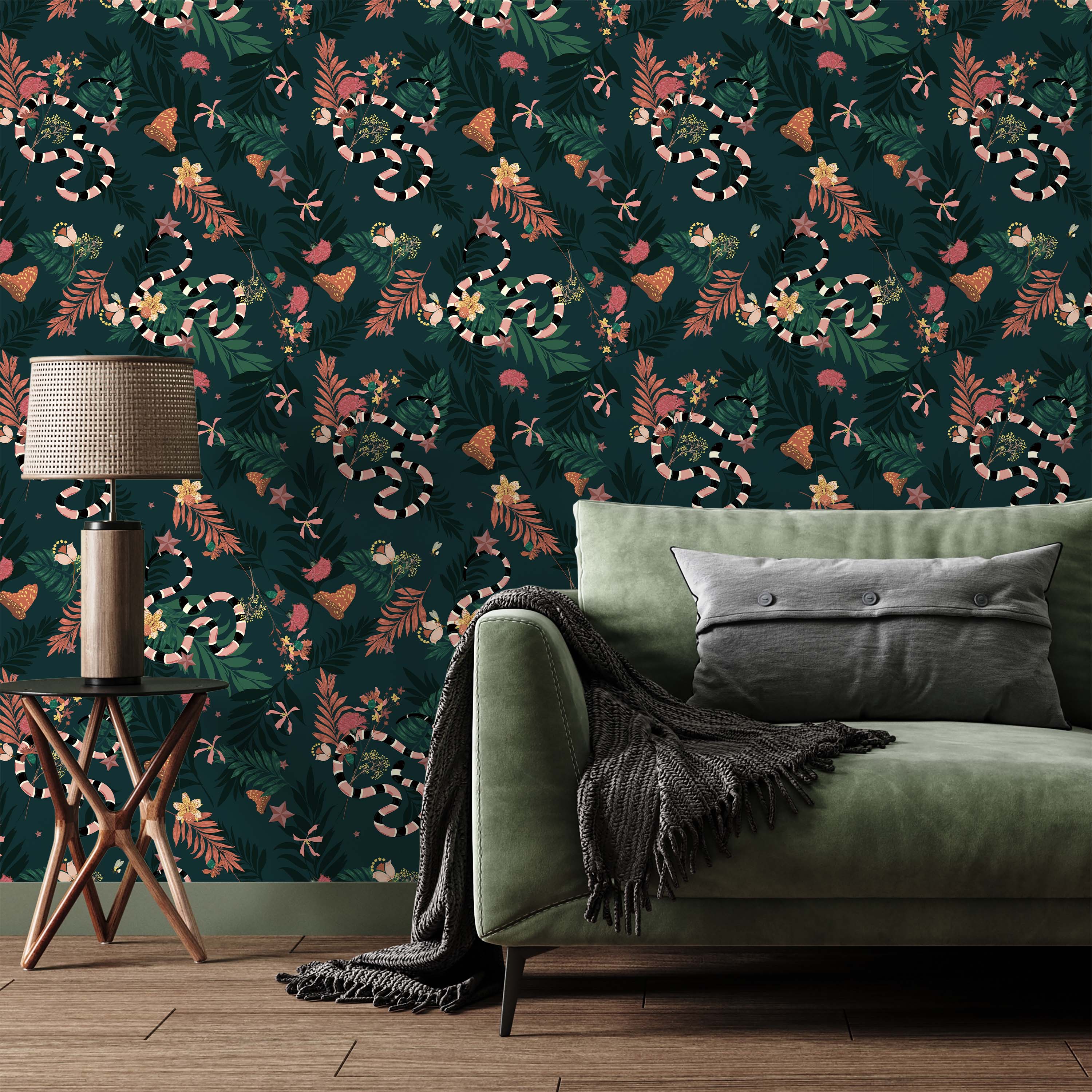 Immerse your space in lush botanical drama with this striking wallpaper featuring intricately detailed snakes, exotic flowers, and verdant foliage set against a rich dark green backdrop. Perfect for creating a sophisticated, nature-inspired sanctuary.