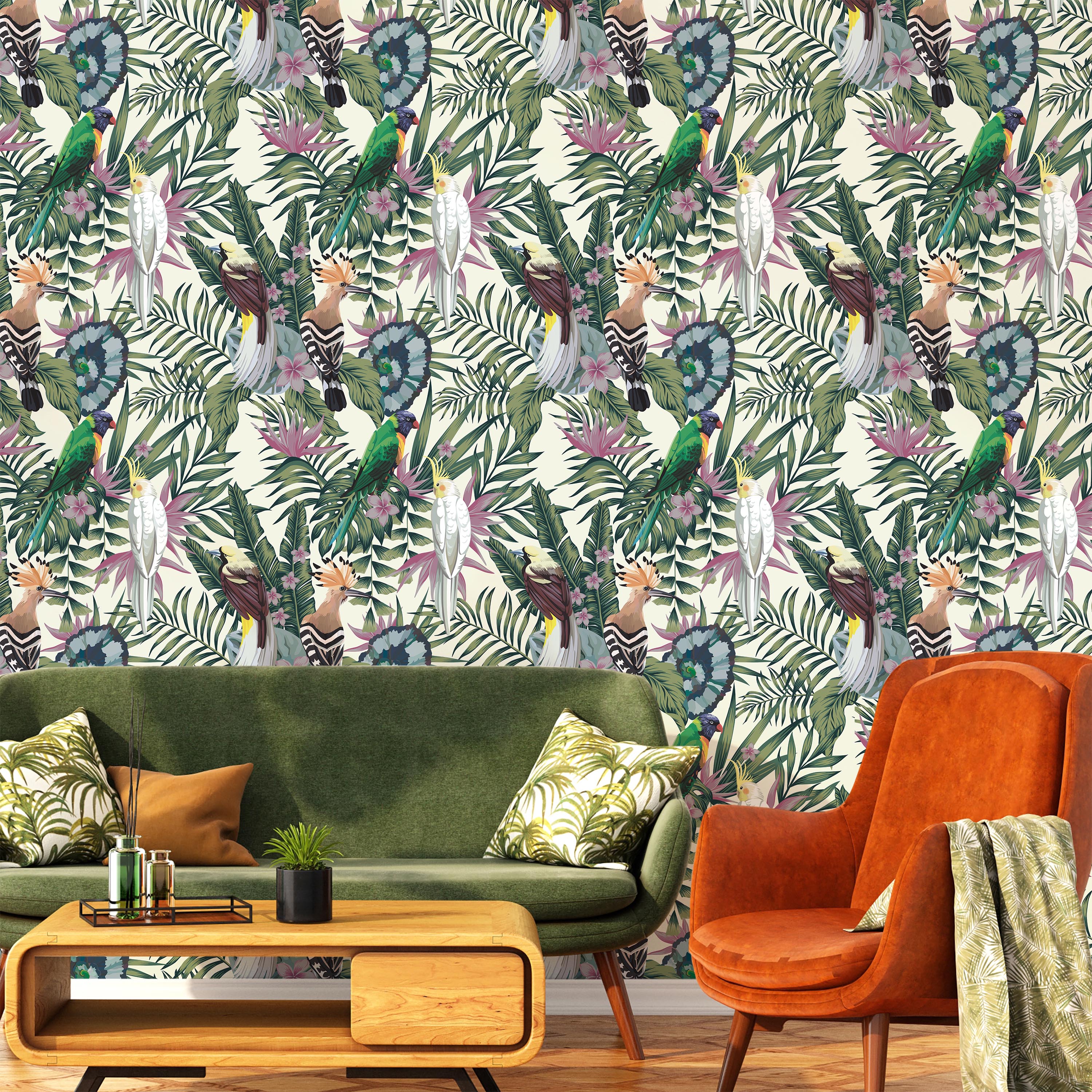 Vibrant tropical birds and foliage design on crisp white backdrop. This wallpaper brings botanical elegance to any room, featuring detailed plumage and lush leaf patterns that create visual depth without overwhelming the space. Perfect for adding sophisticated nature-inspired character to modern interiors.