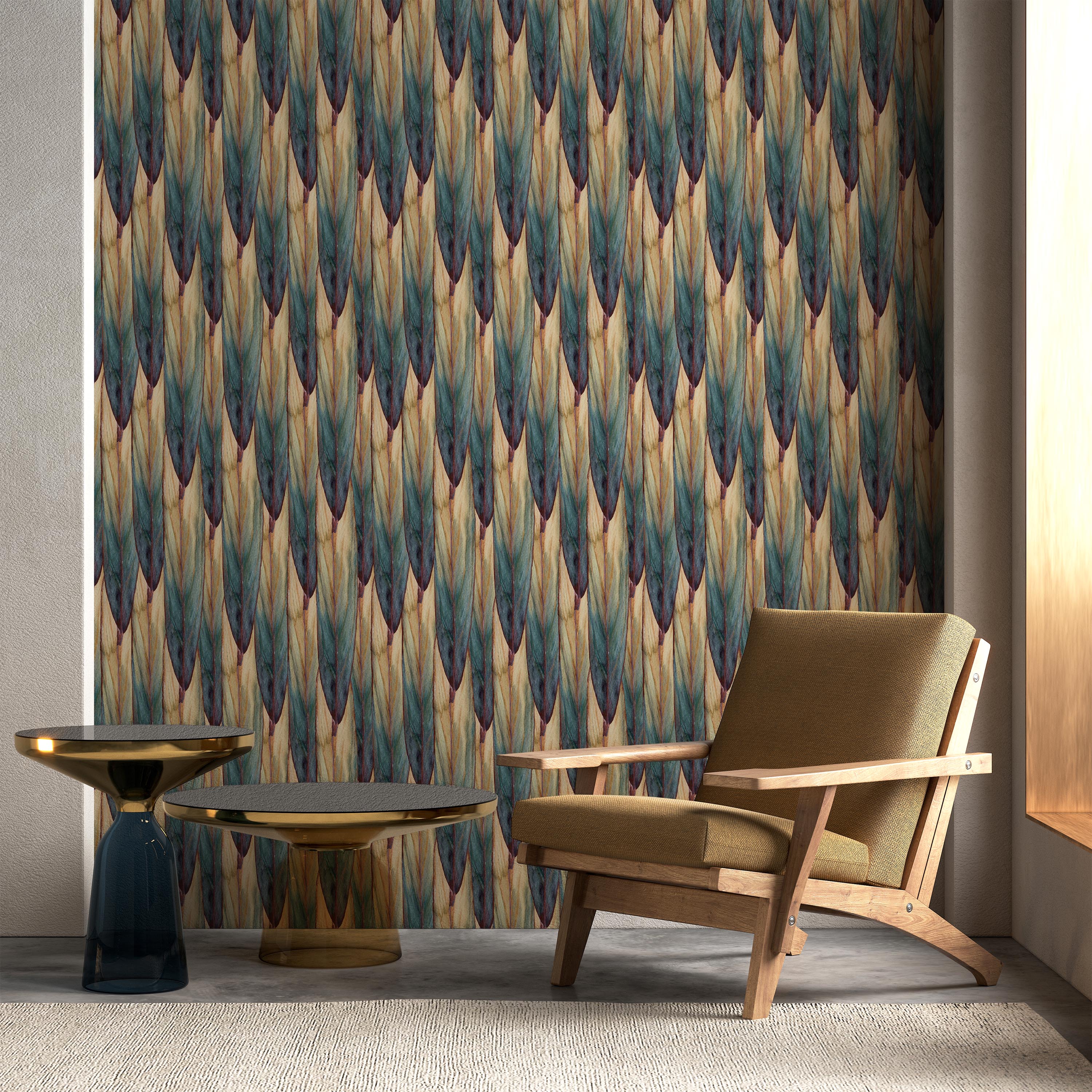 Sophisticated botanical wallpaper featuring an organic pattern of undulating leaves in verdant and earthy tones against a warm beige backdrop. Perfect for creating a refined, nature-inspired ambiance in any interior space.