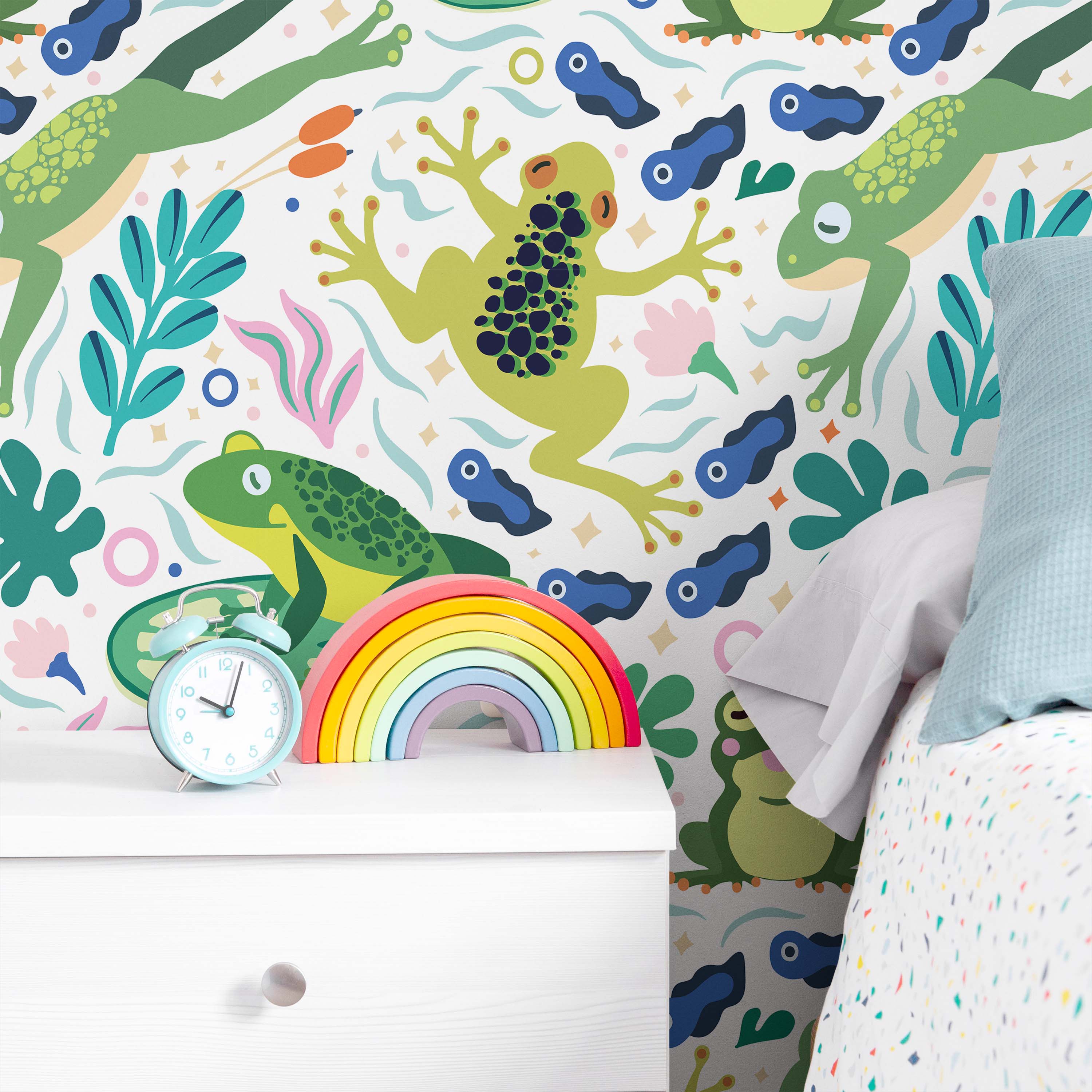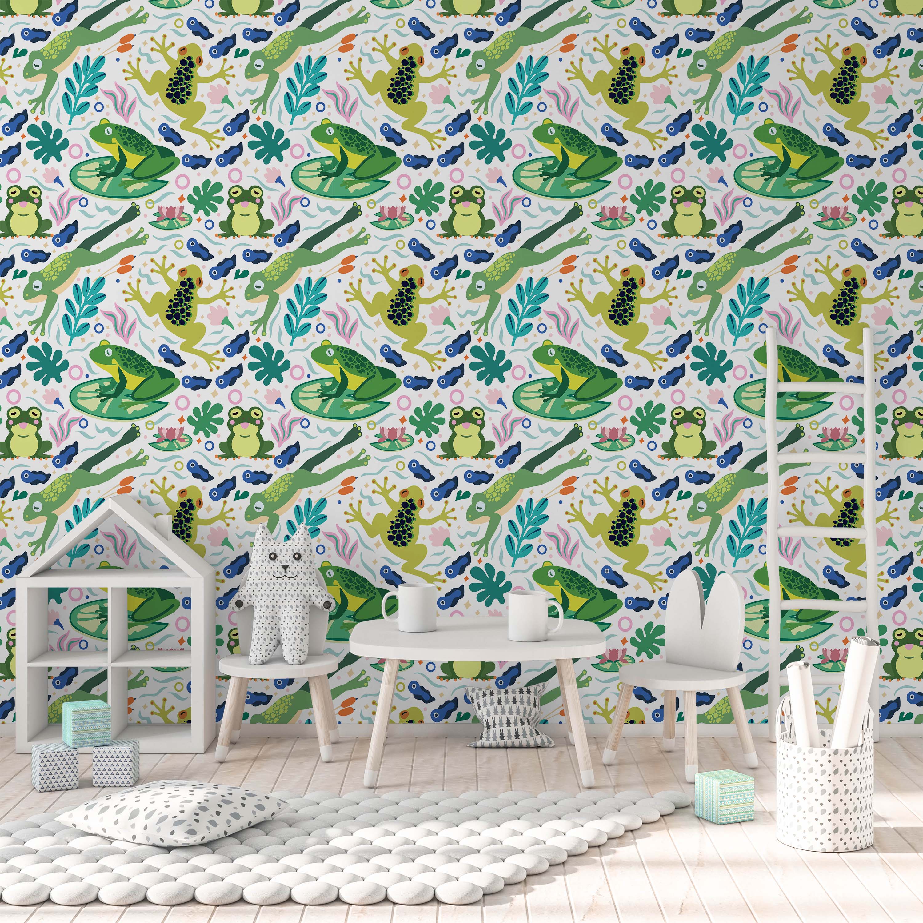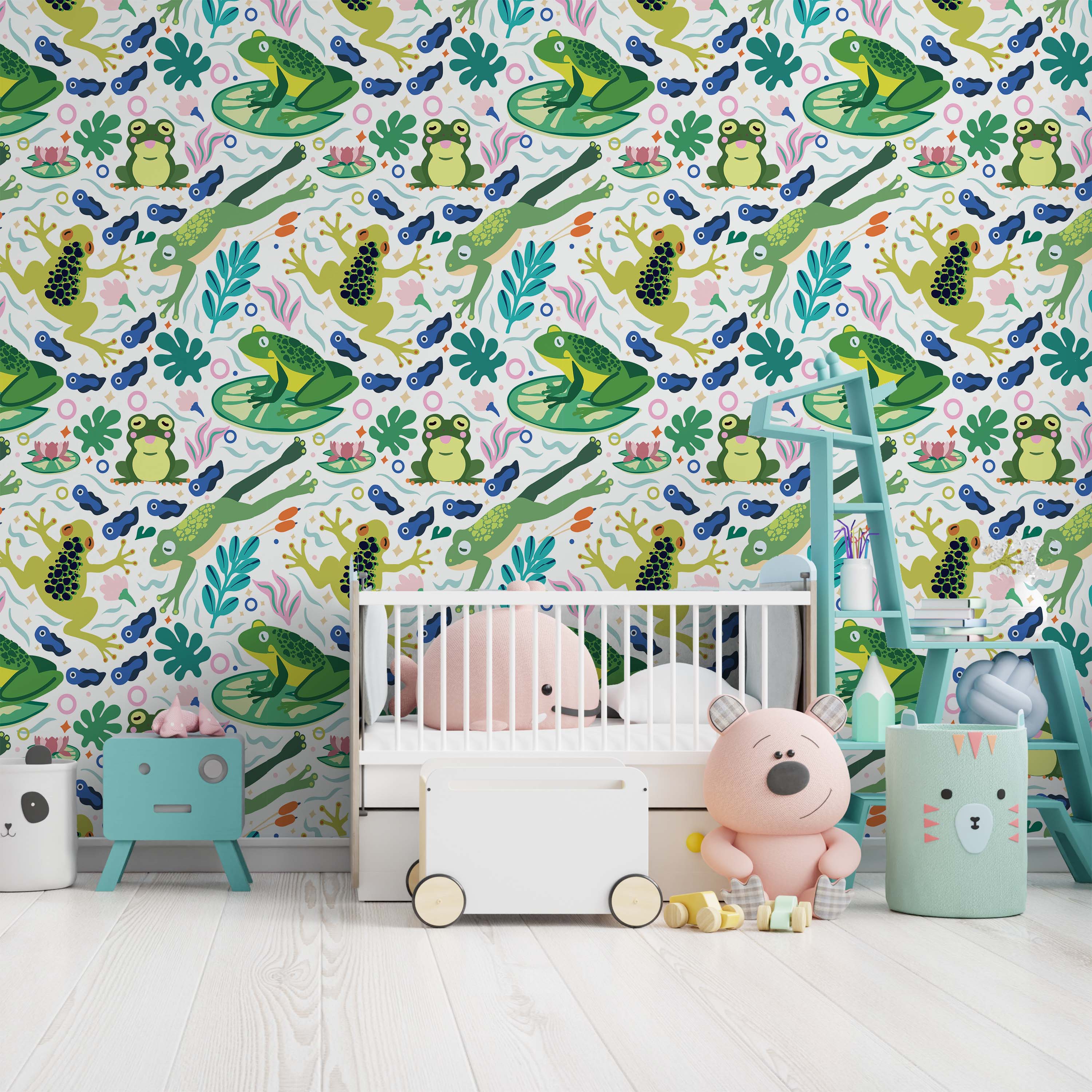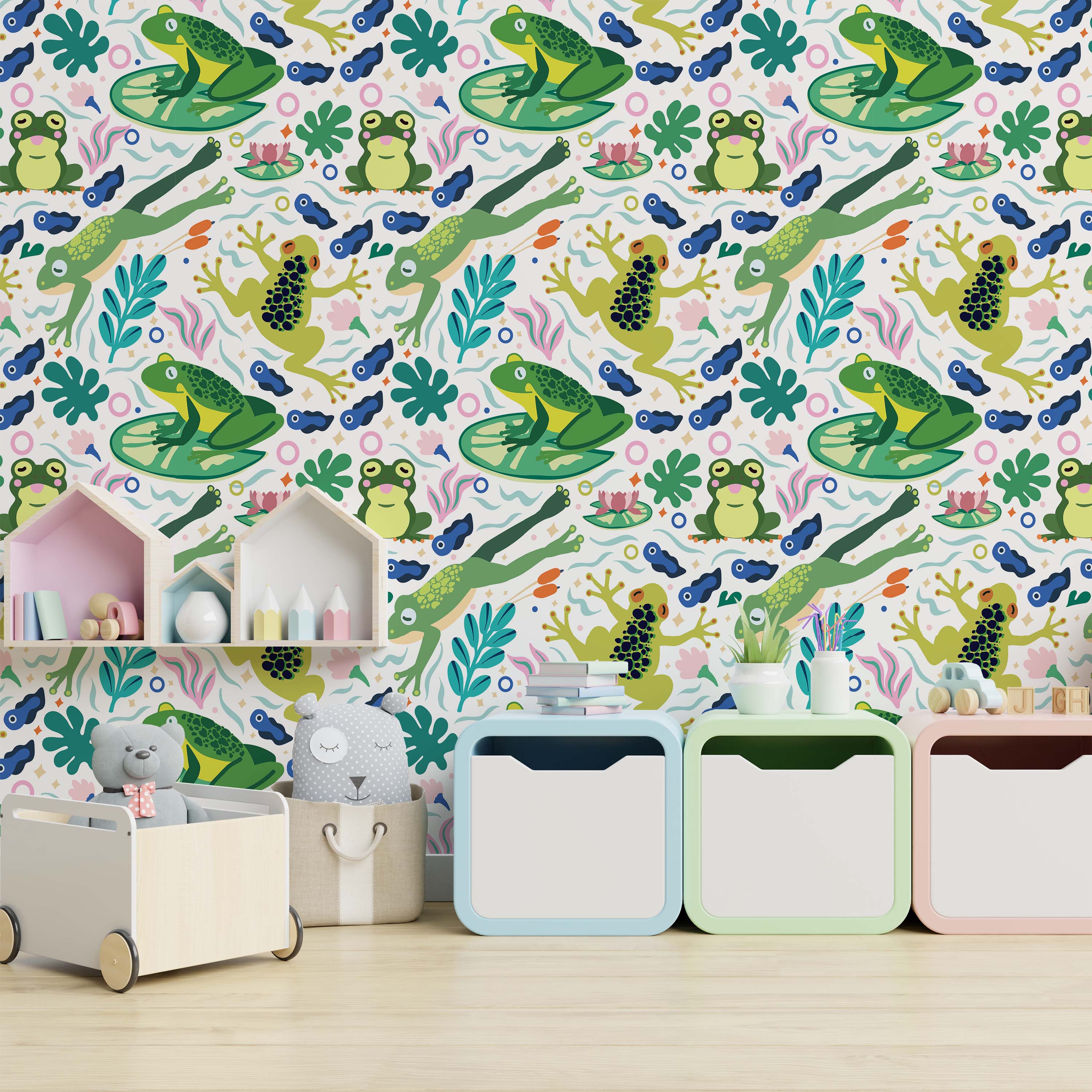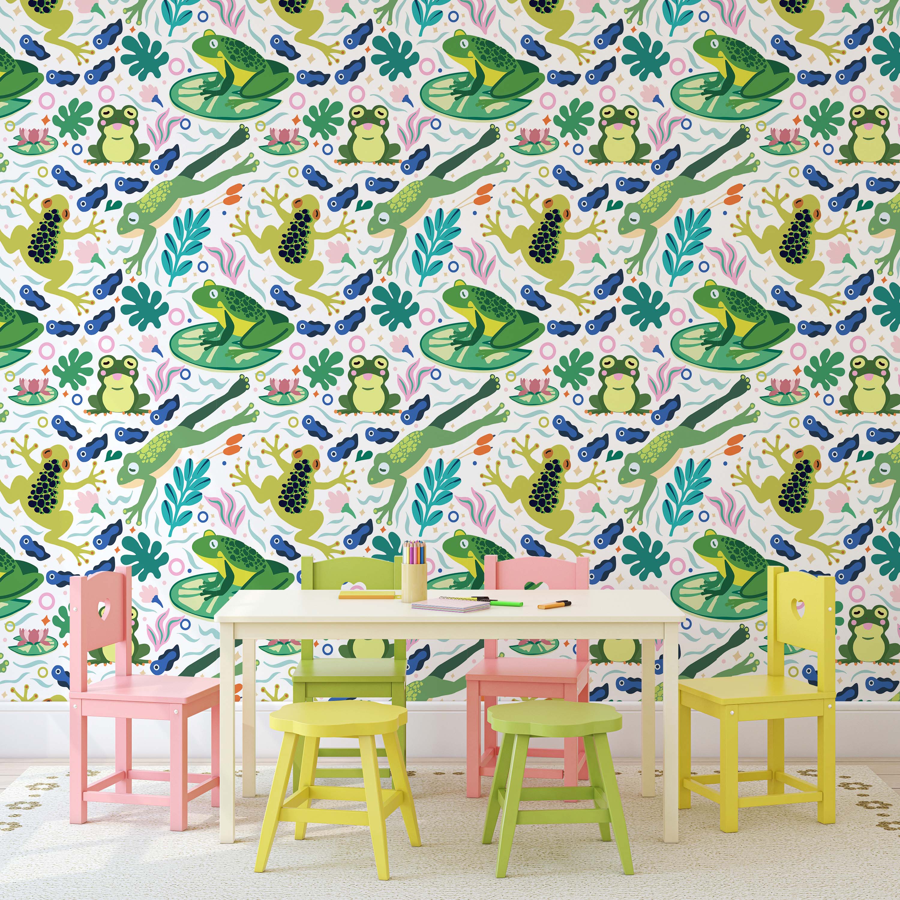 Vibrant frog and lily pad motif adorns this wallpaper, bringing playful aquatic charm to any room. The crisp white background ensures versatility, complementing both modern and traditional interiors while maintaining visual clarity and brightness throughout your space.