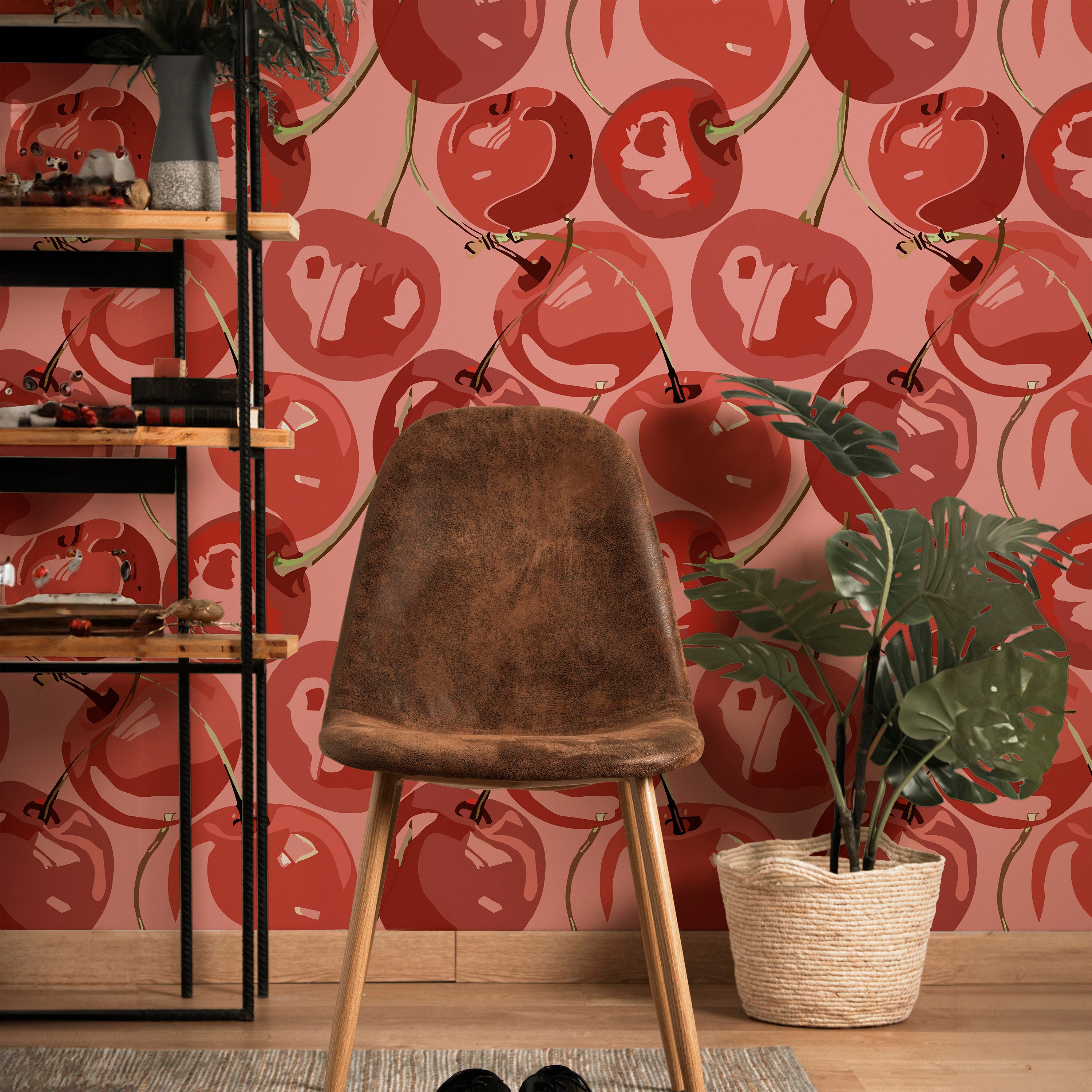 Vibrant red cherries dance across a soft pink backdrop in this striking wallpaper design. Perfect for adding botanical charm and contemporary flair to any room. The balanced composition creates visual interest without overwhelming the space.