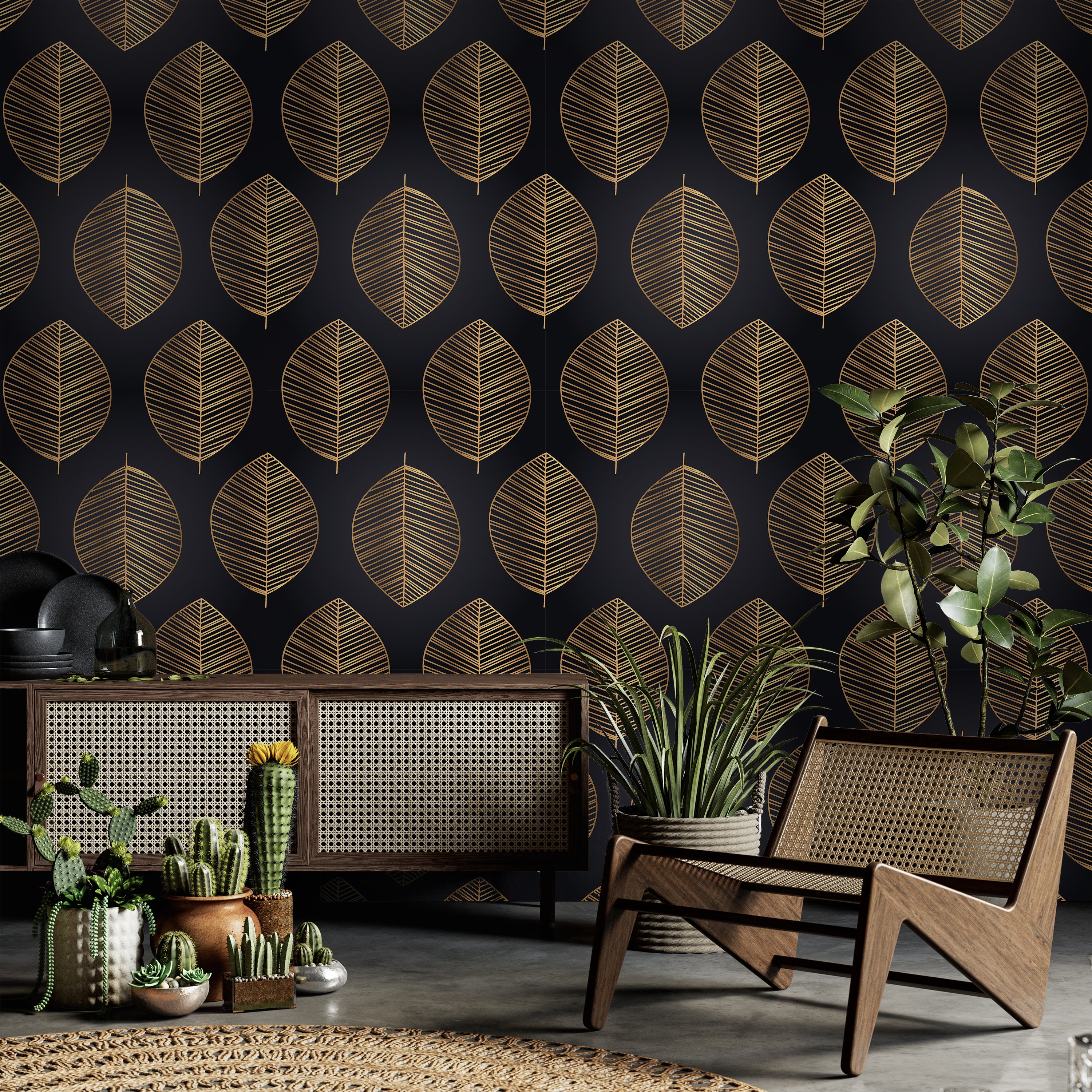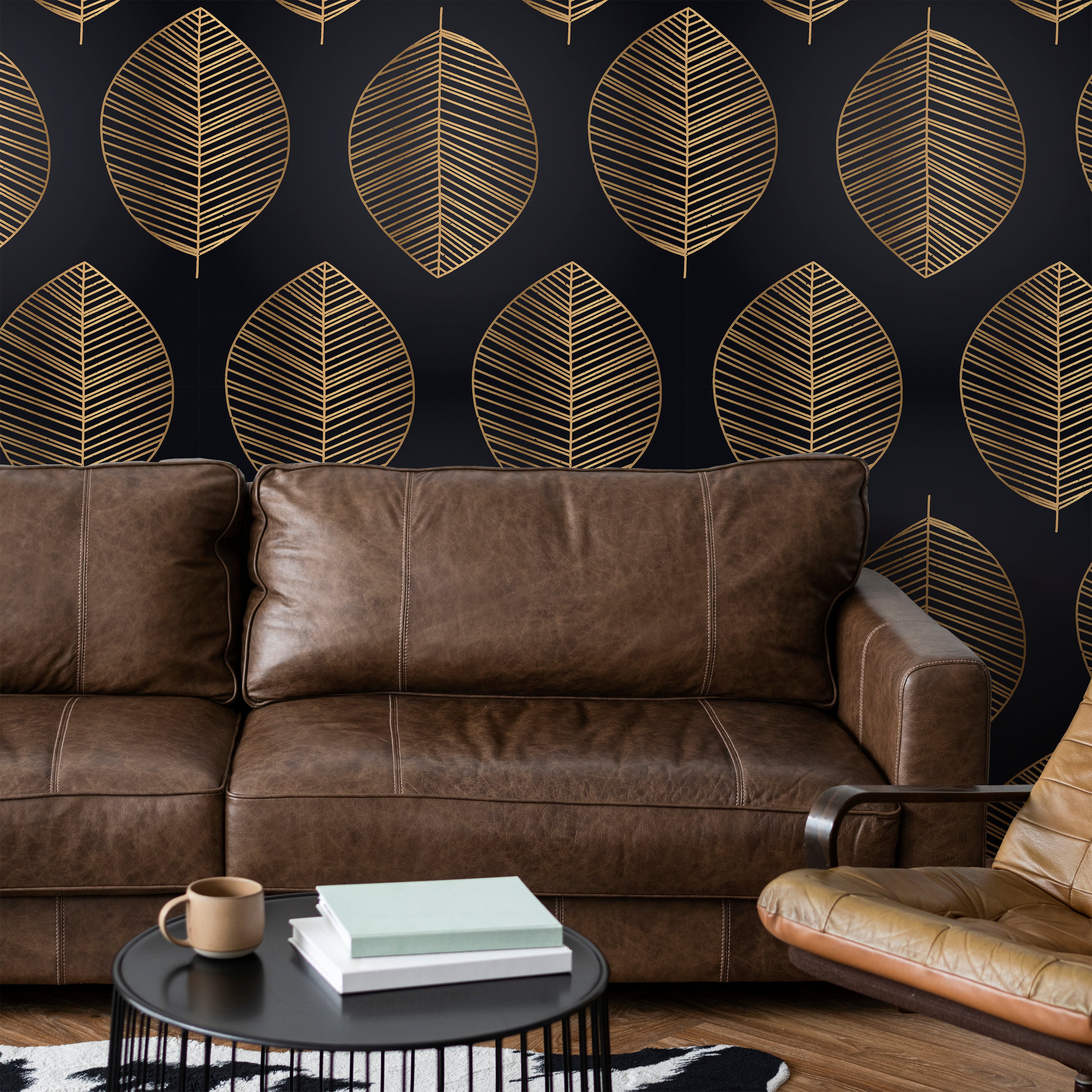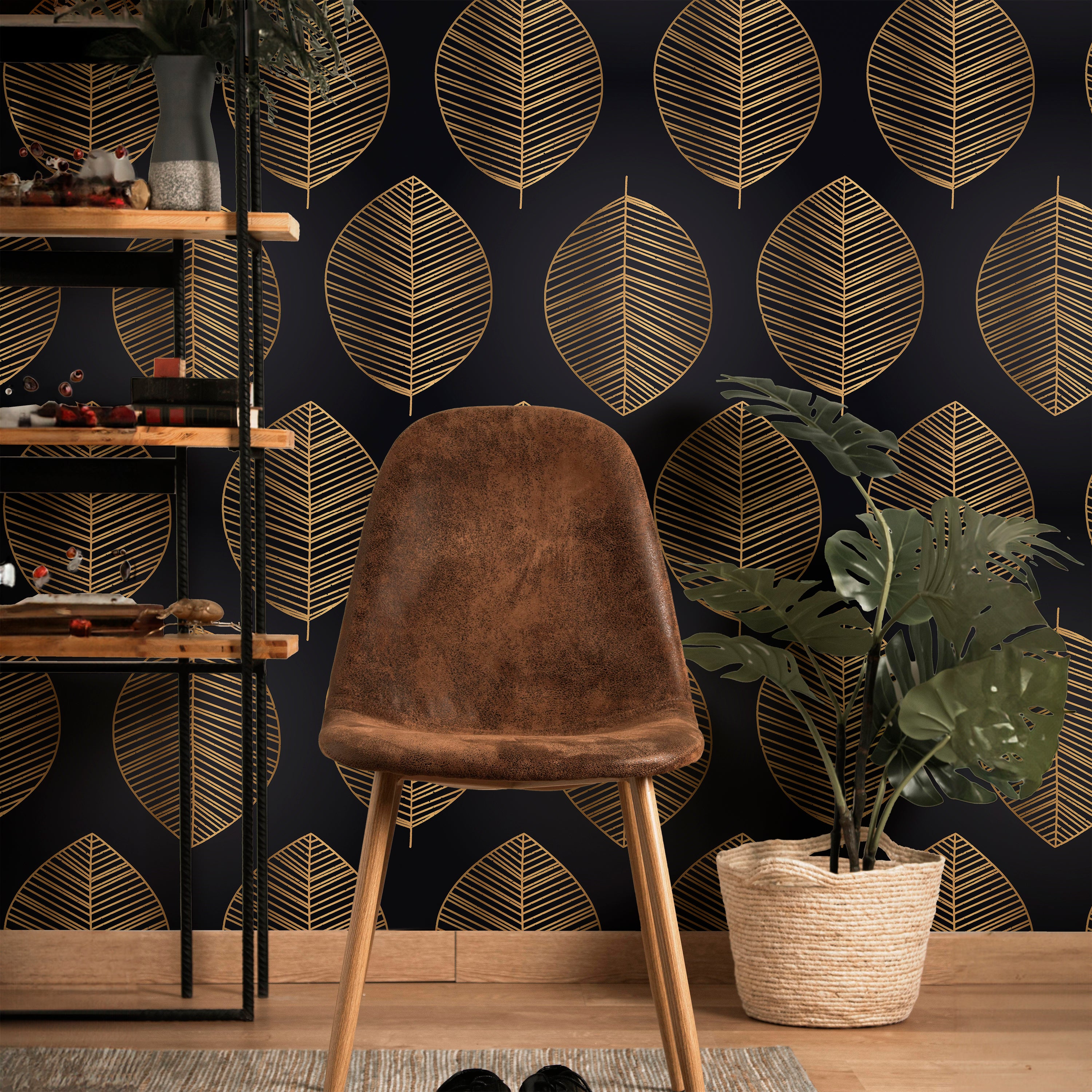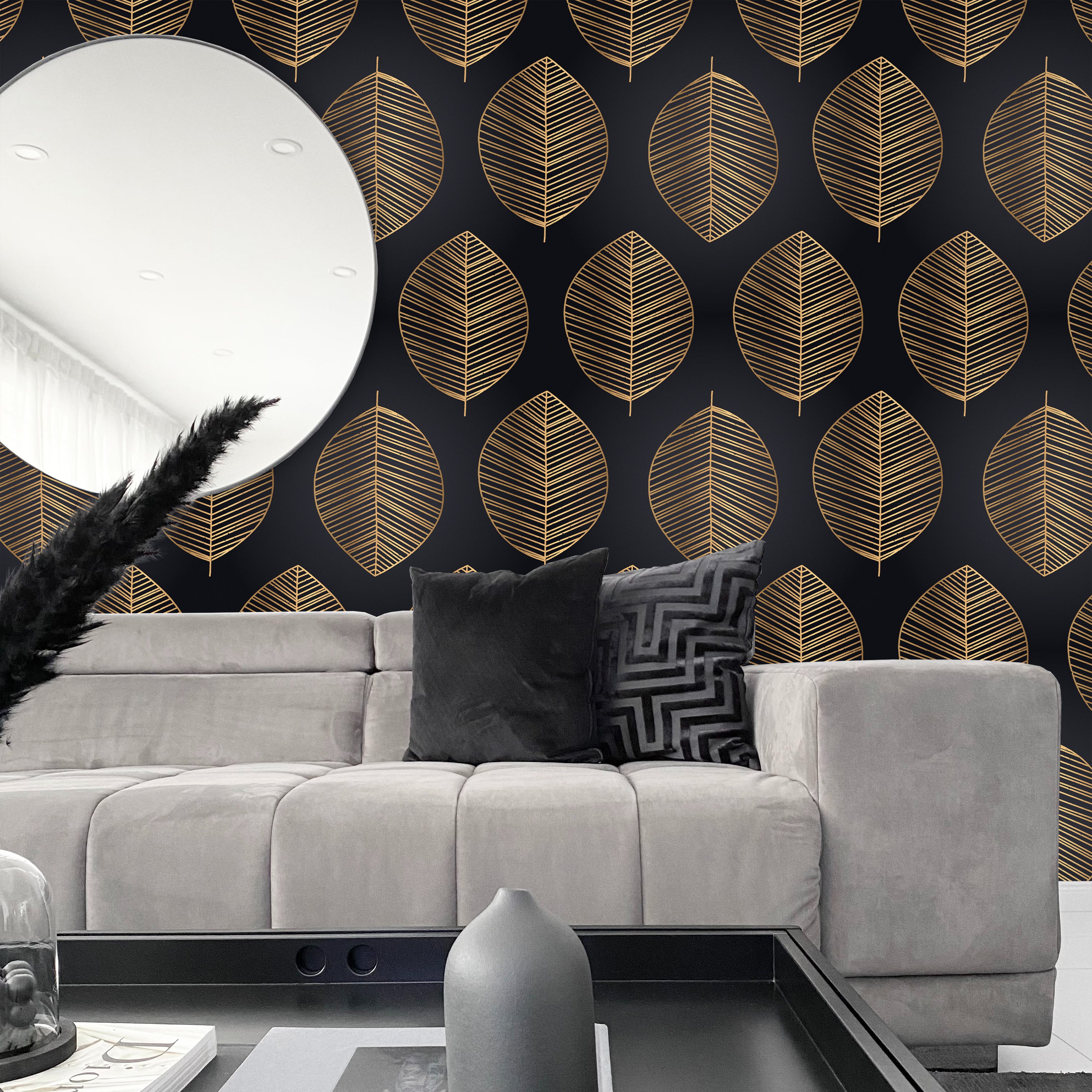 Sophisticated wallpaper featuring an intricate gold leaf pattern against a deep black backdrop. This striking design combines timeless elegance with contemporary style, perfect for creating a dramatic focal point in any room. Ideal for accent walls or complete transformations.