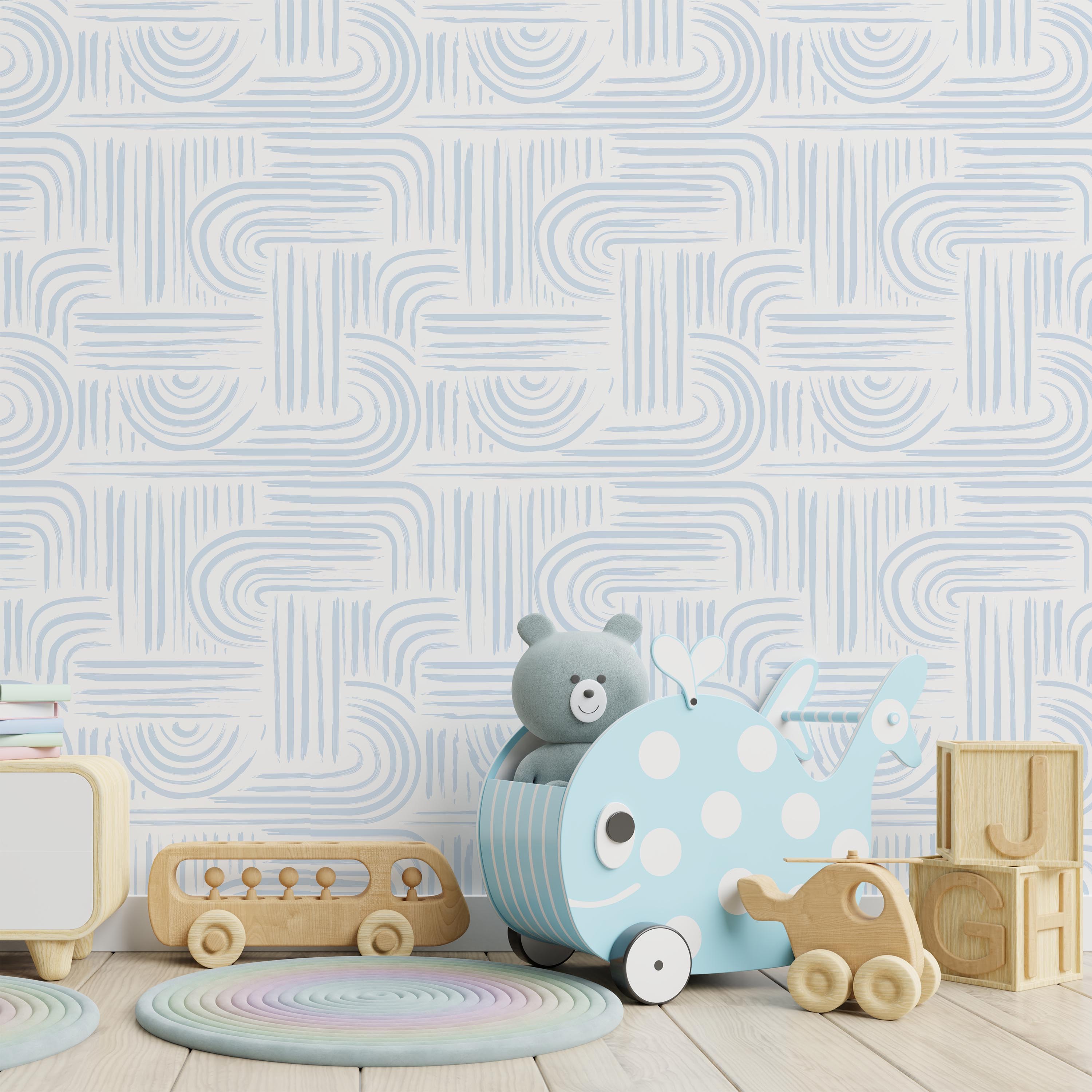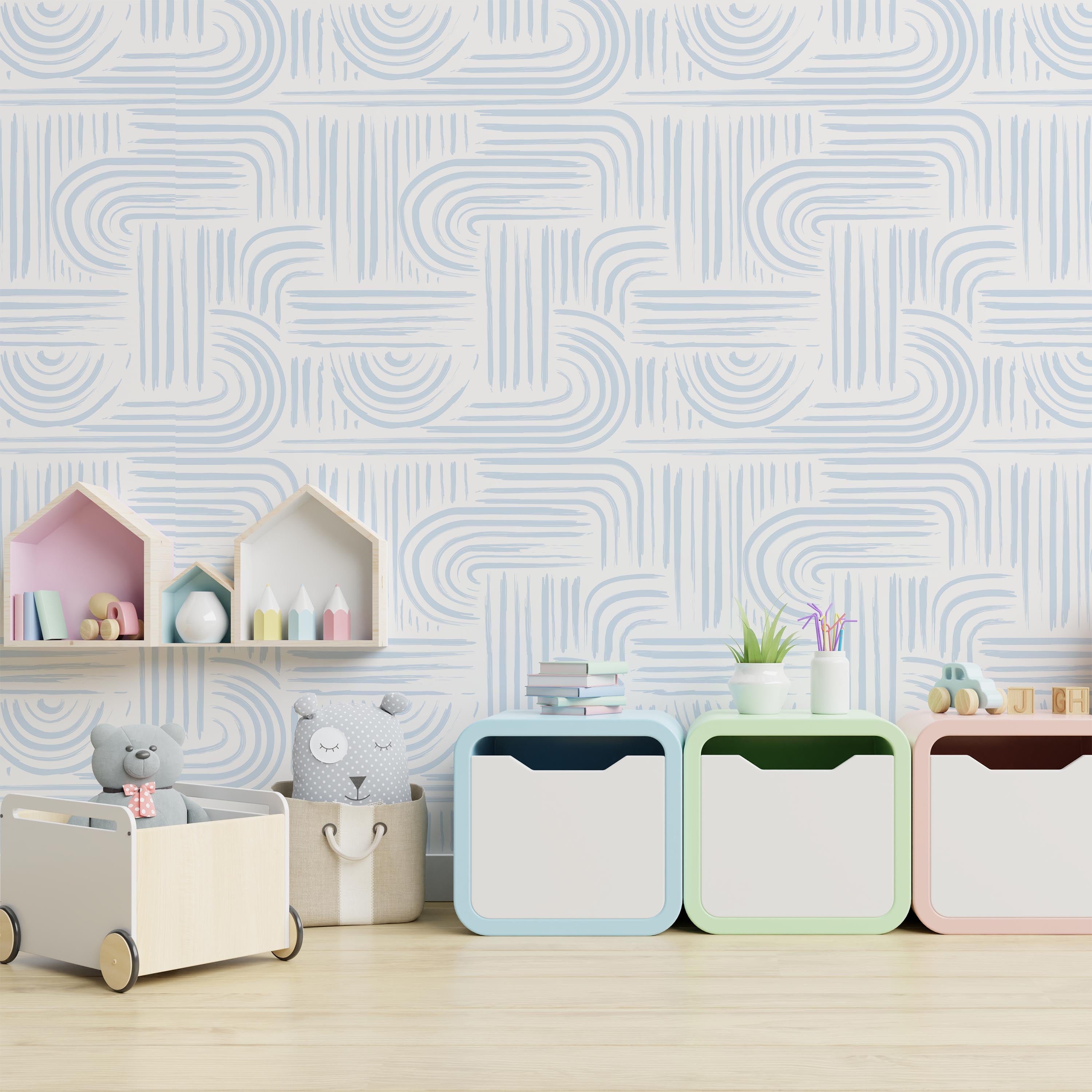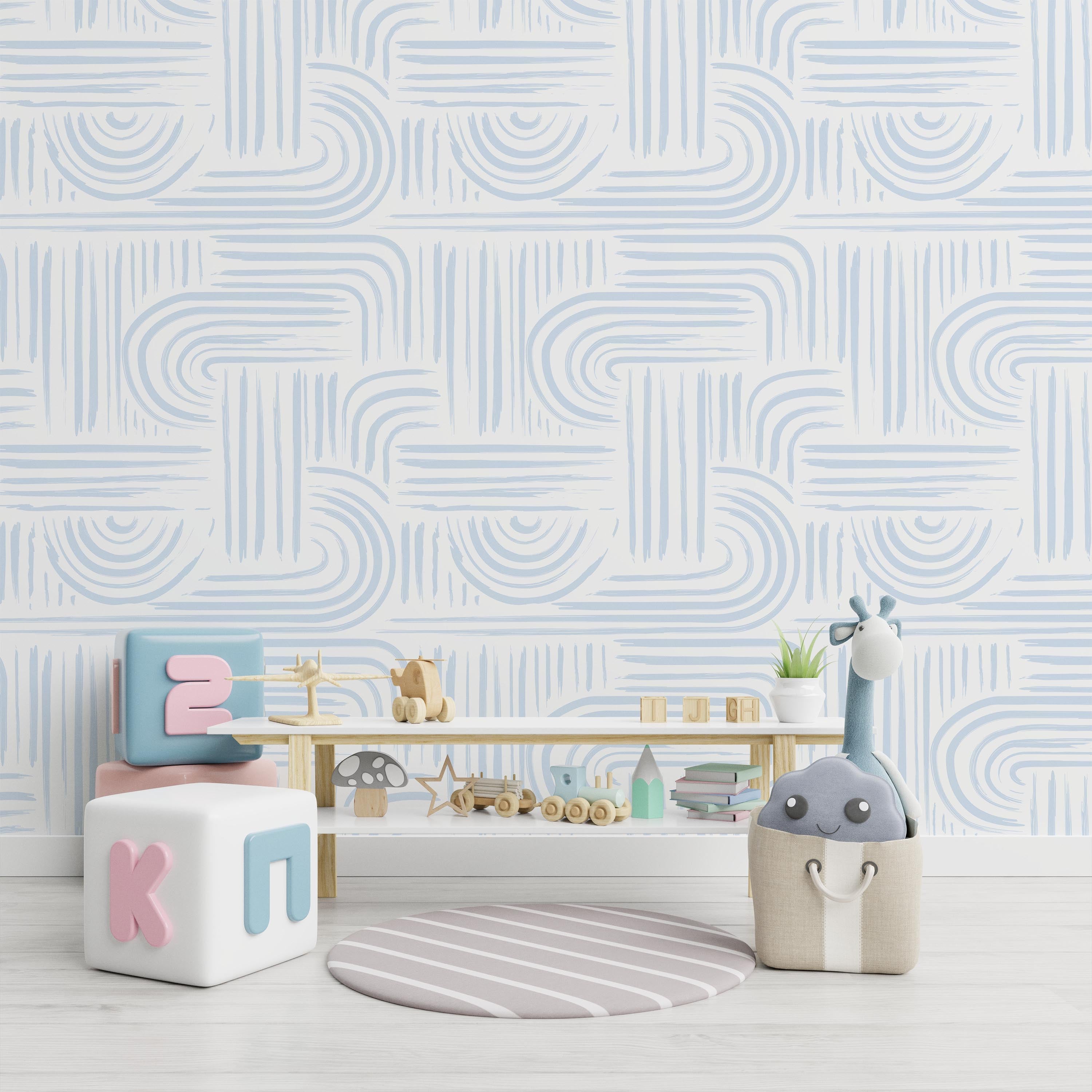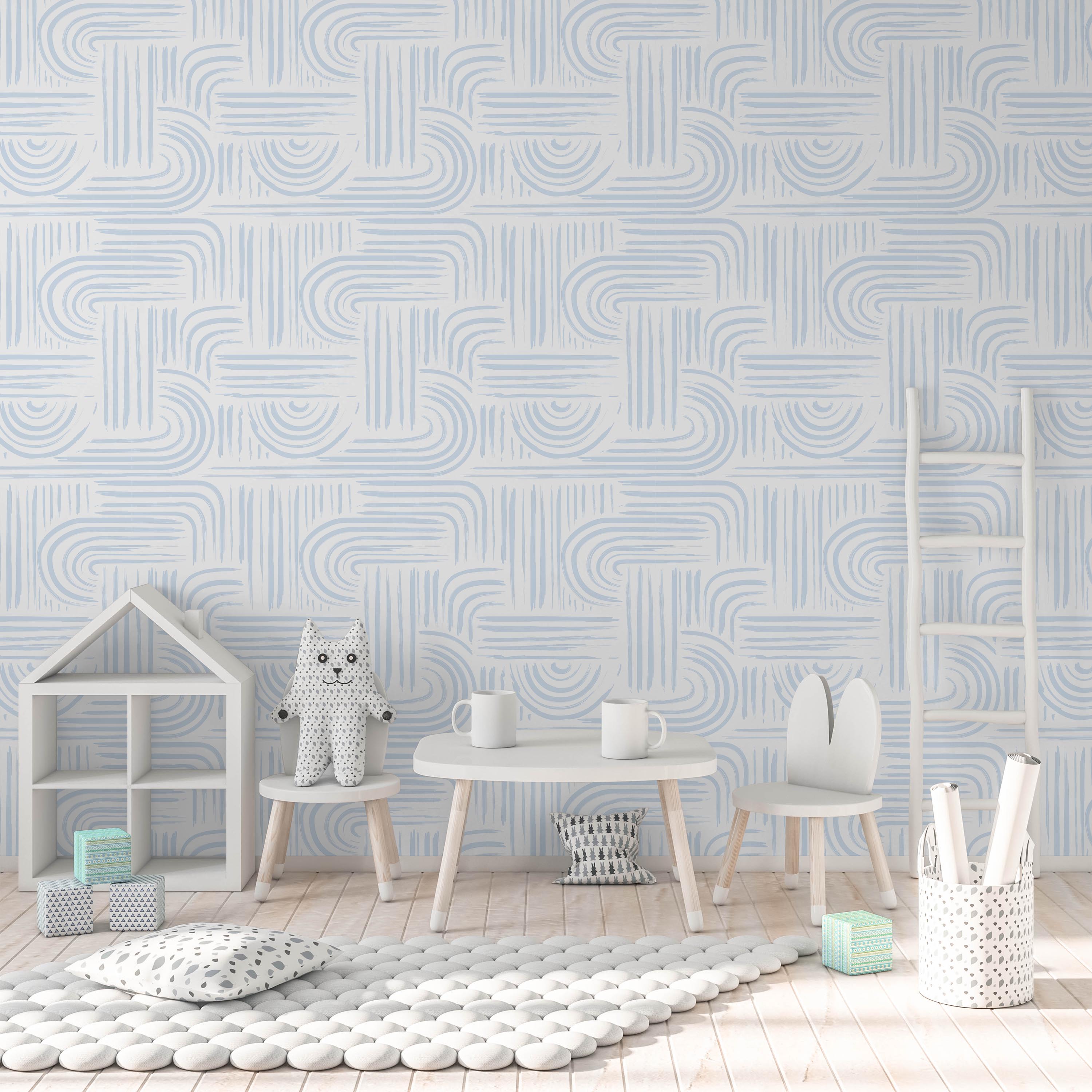 Blue Bloom Wallpaper features a sophisticated abstract pattern of flowing blue lines against a crisp white backdrop. This contemporary design brings visual interest and depth to any room while maintaining a clean, minimalist aesthetic. Perfect for modern interiors seeking understated elegance.