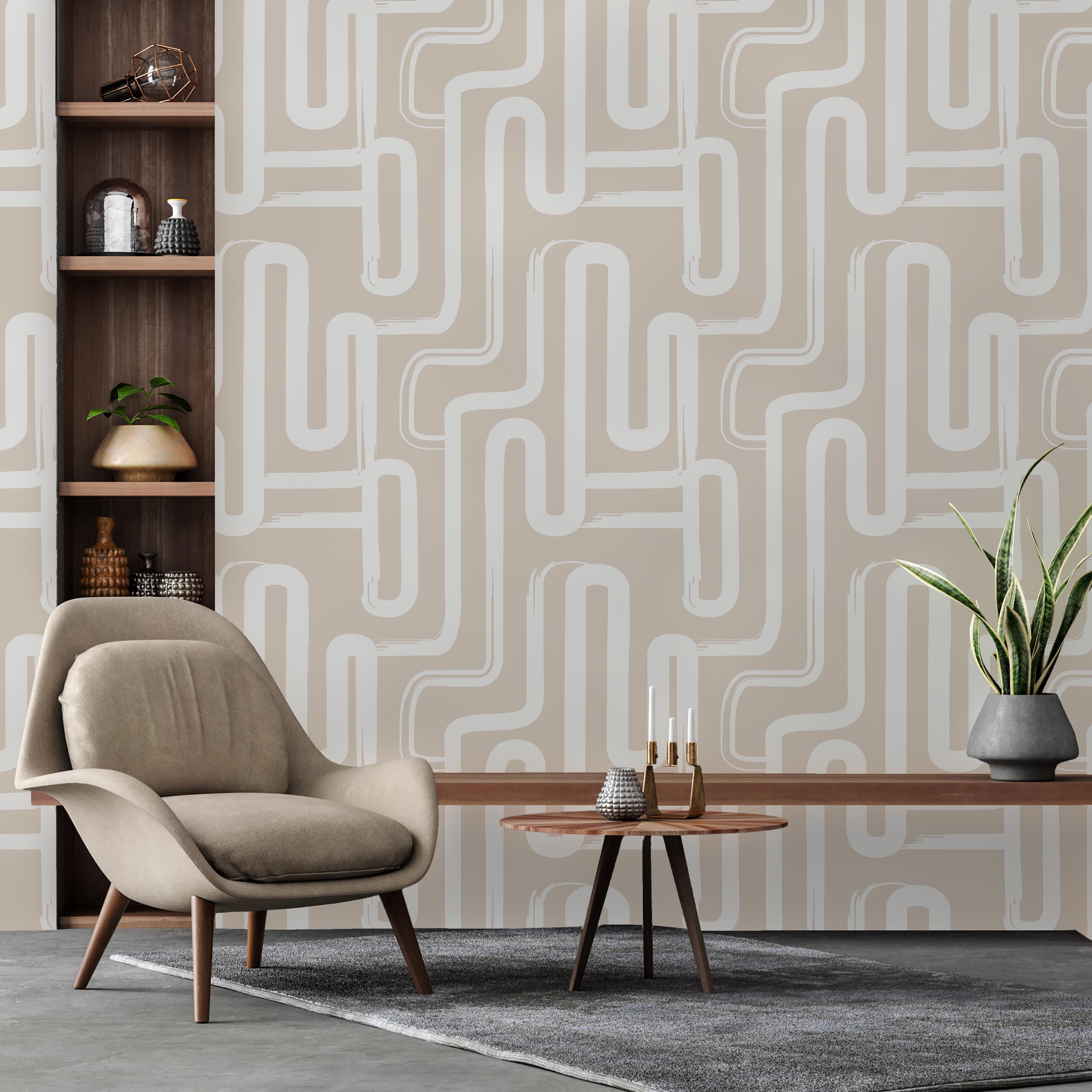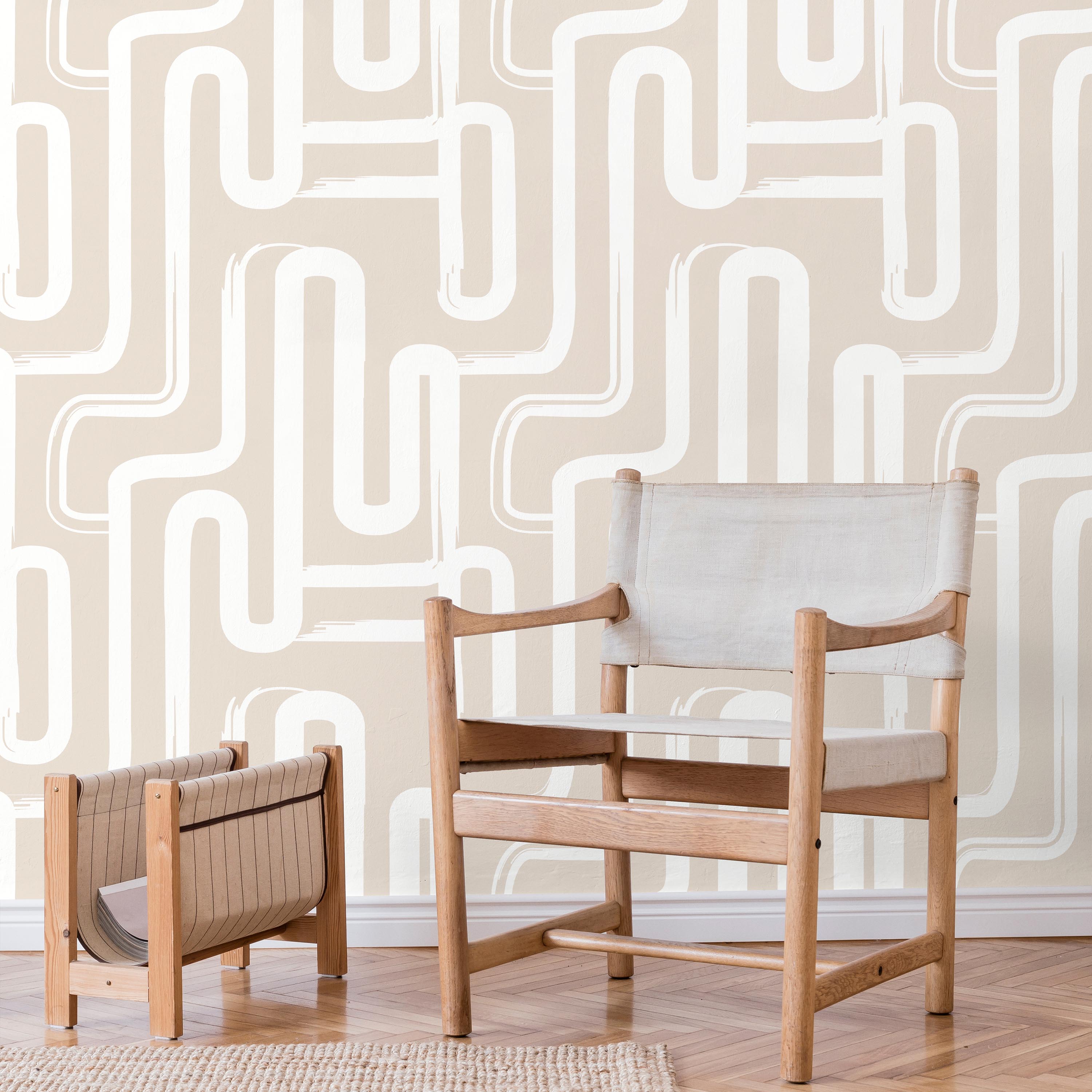 Contemporary wallcovering with graceful white linear elements dancing across a warm beige surface. The abstract pattern delivers sophisticated visual depth, enhancing modern interiors with understated refinement and timeless appeal.