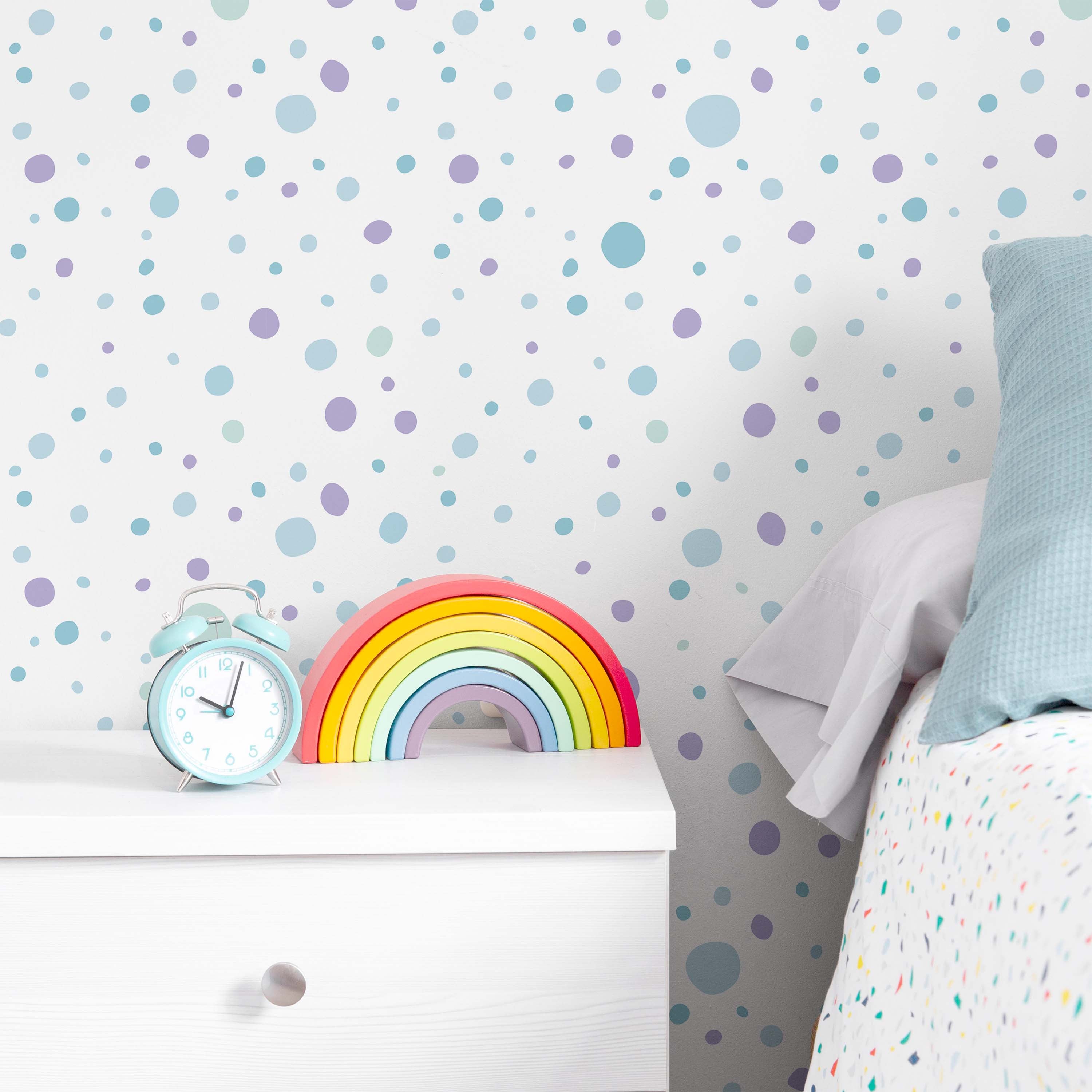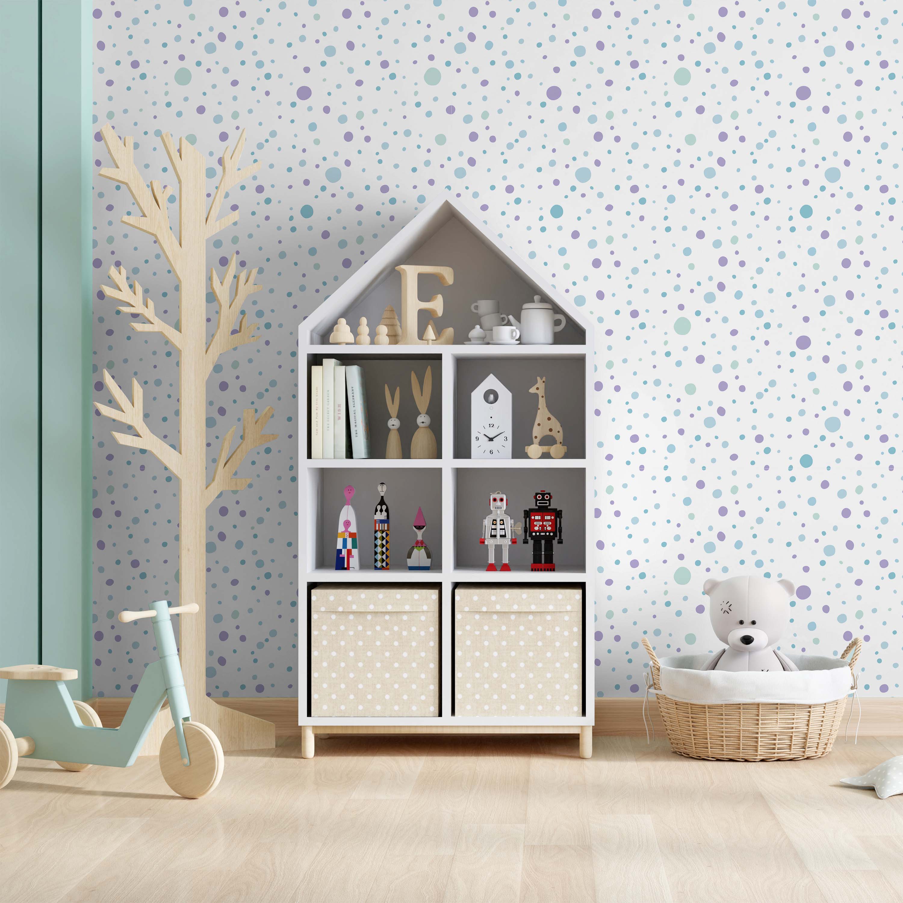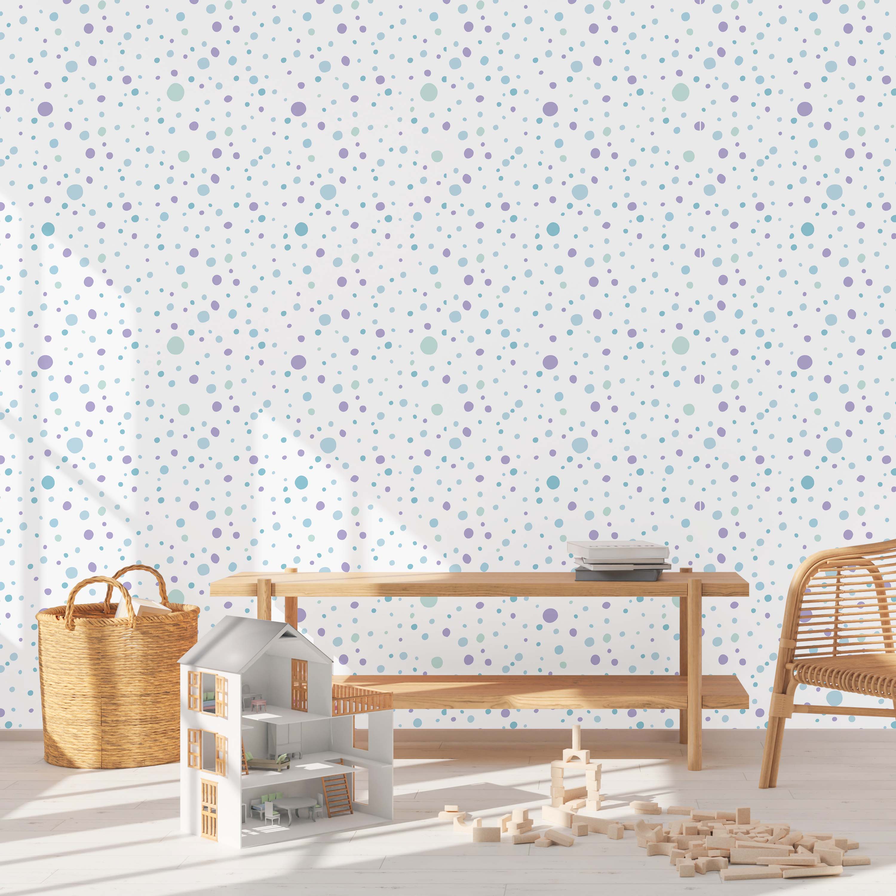 Sophisticated wallpaper featuring a dynamic arrangement of blue and purple polka dots against a crisp white backdrop. This versatile pattern adds visual interest and contemporary charm to any room while maintaining an elegant, understated aesthetic.