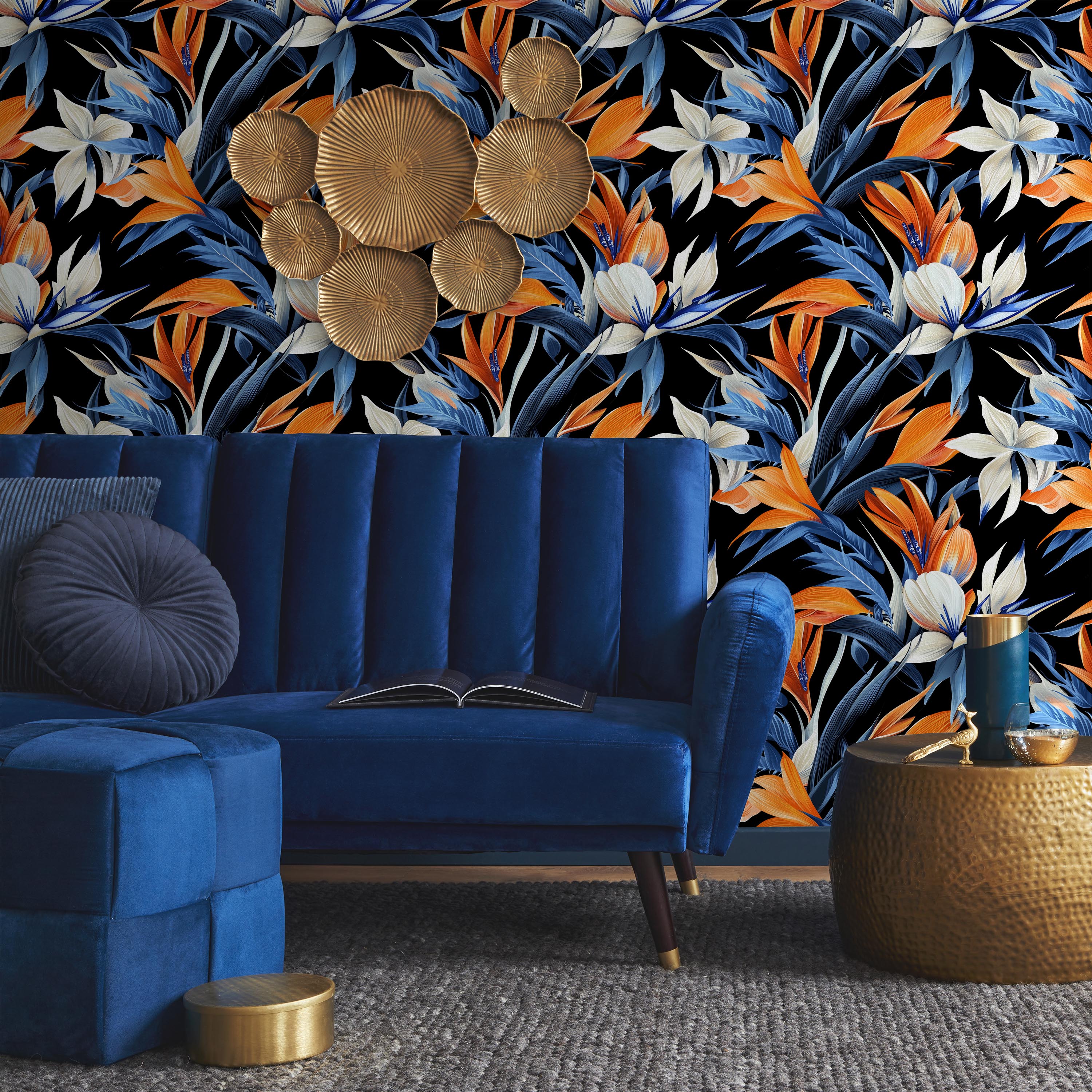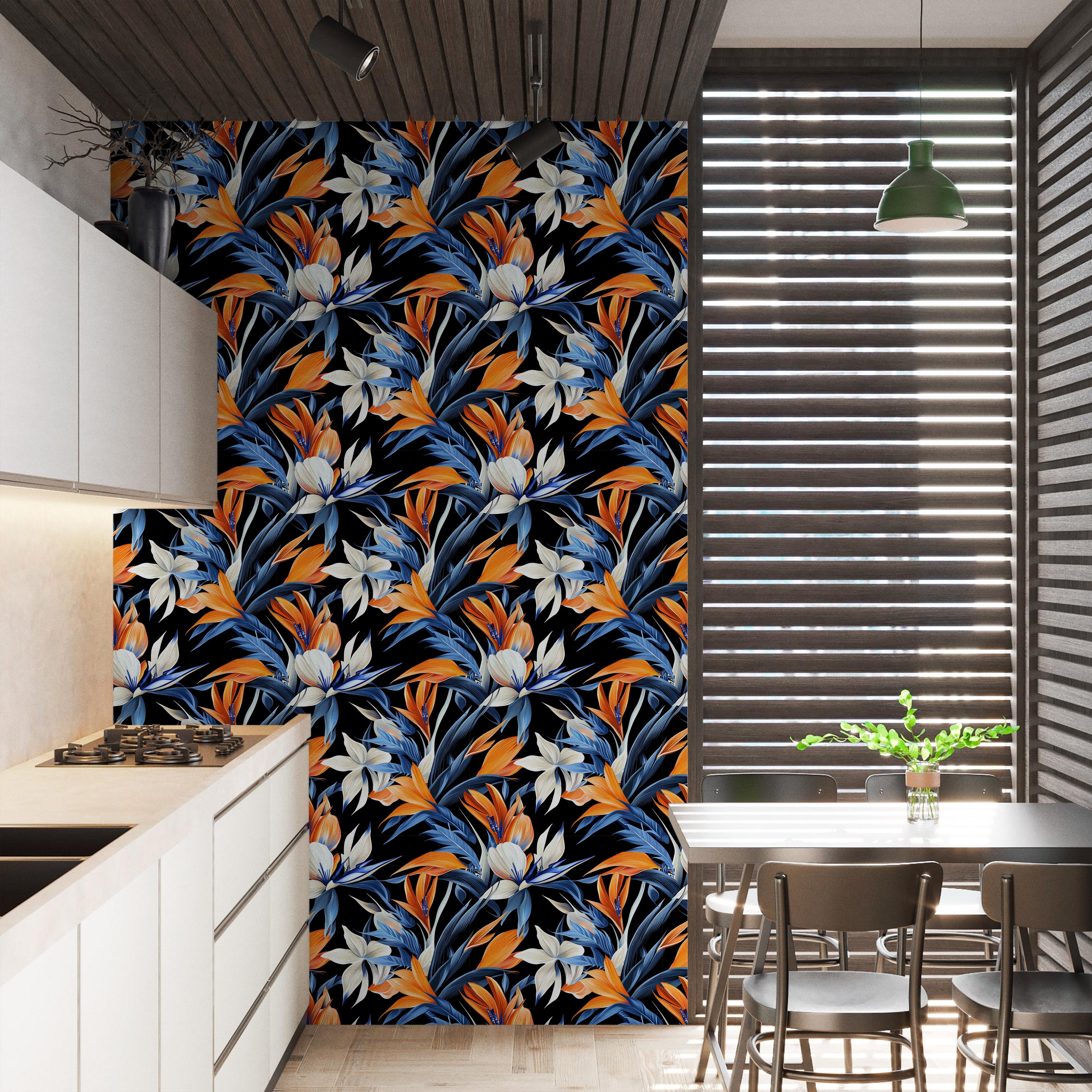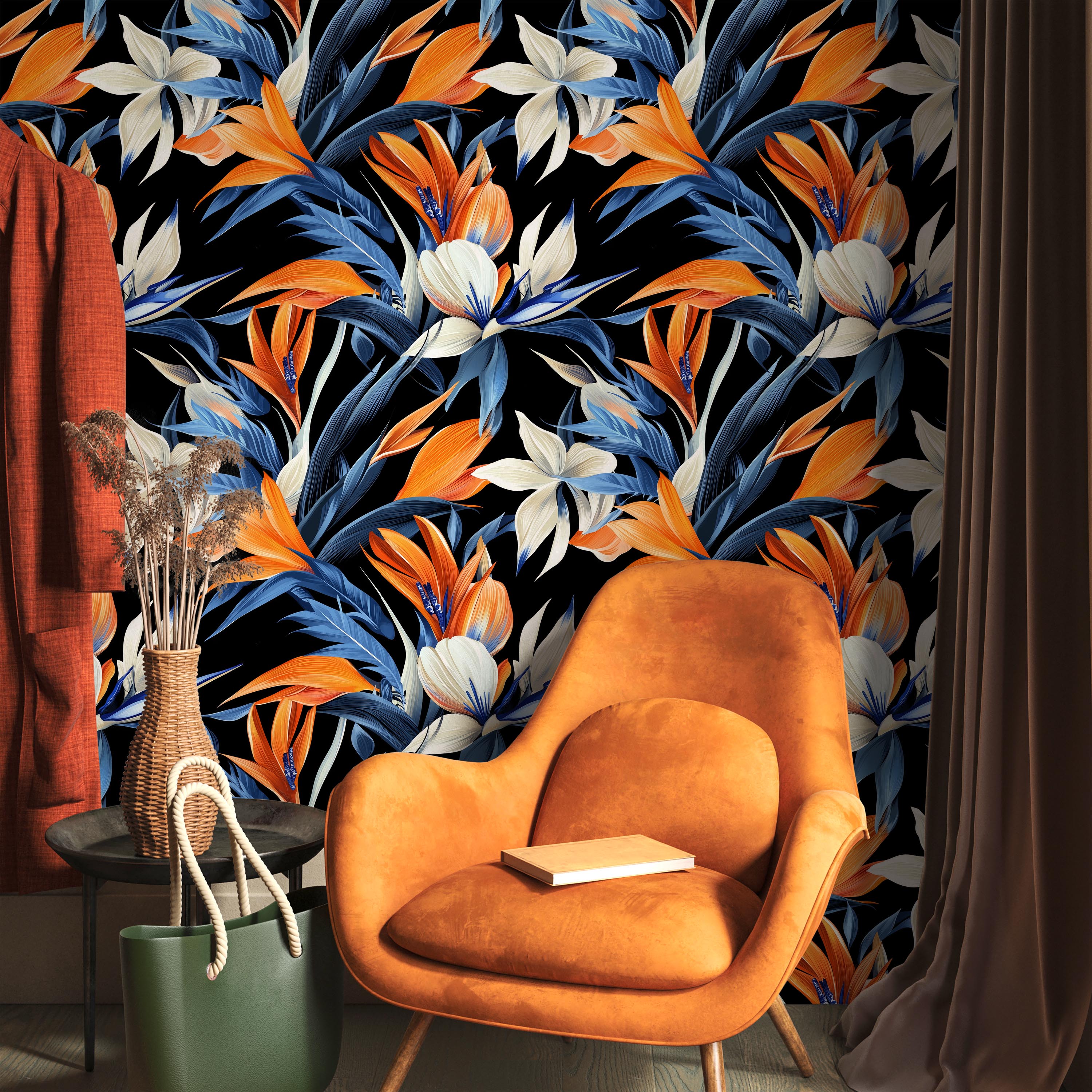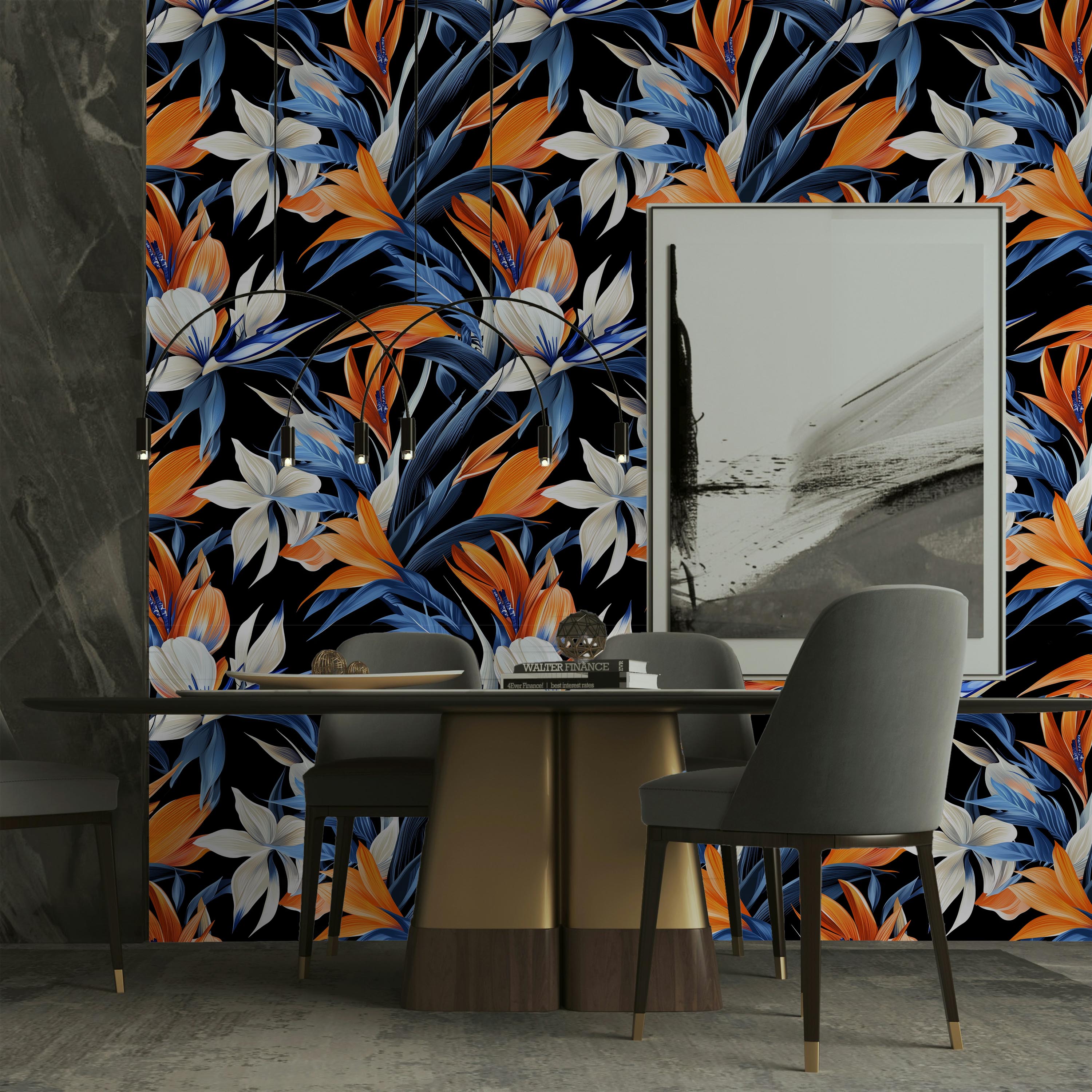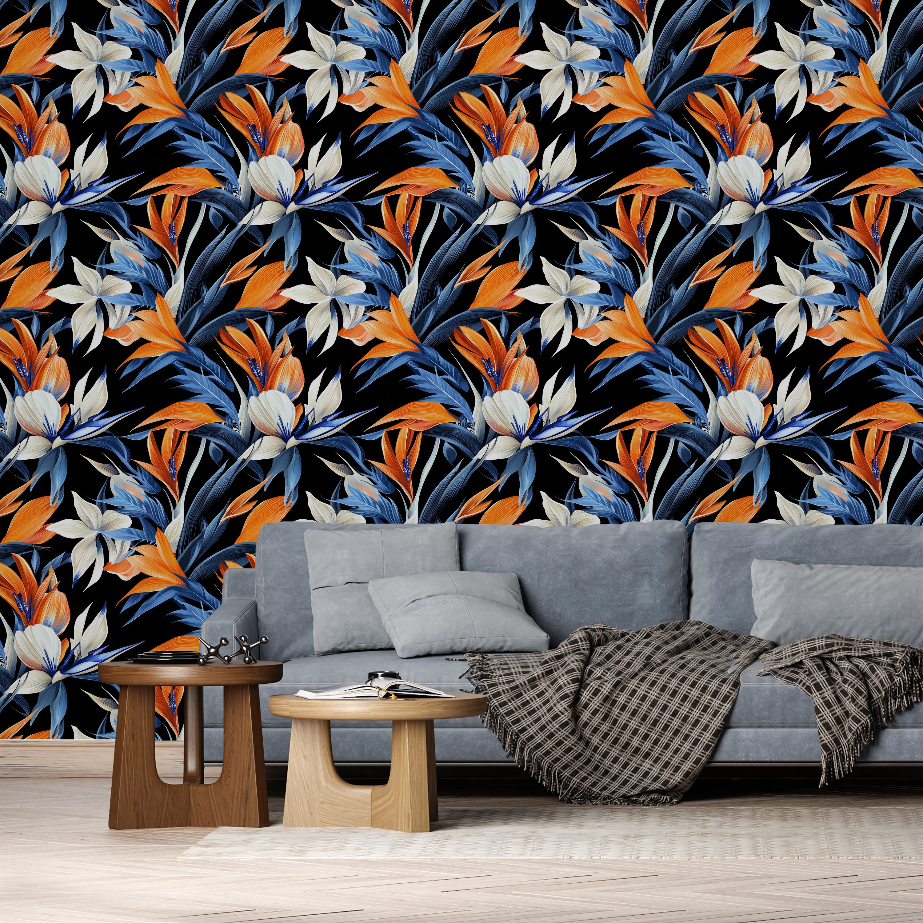 Striking botanical wallpaper featuring vibrant strelitzia blooms in orange, blue, and white against a sophisticated black backdrop. Perfect for creating dramatic accent walls with contemporary flair.