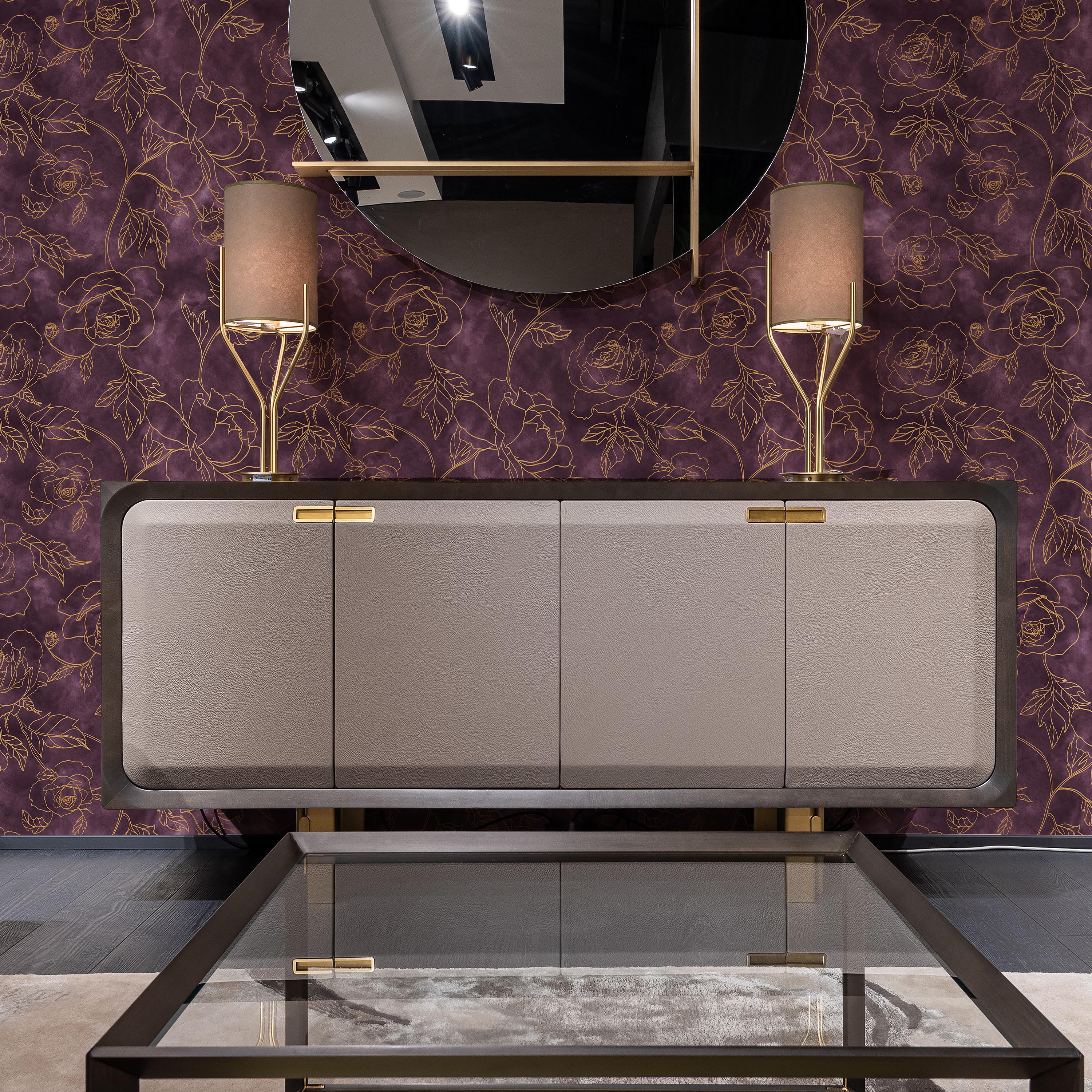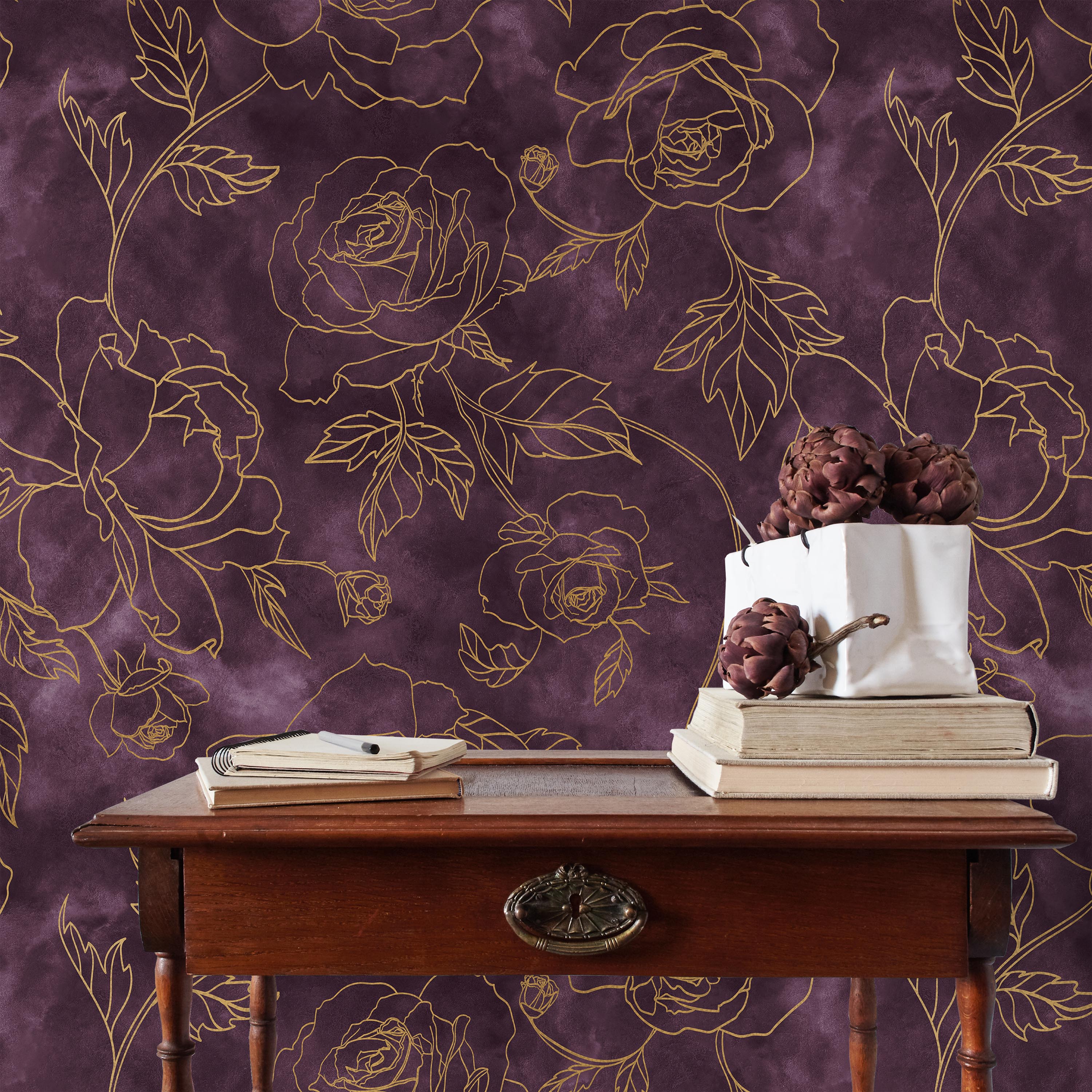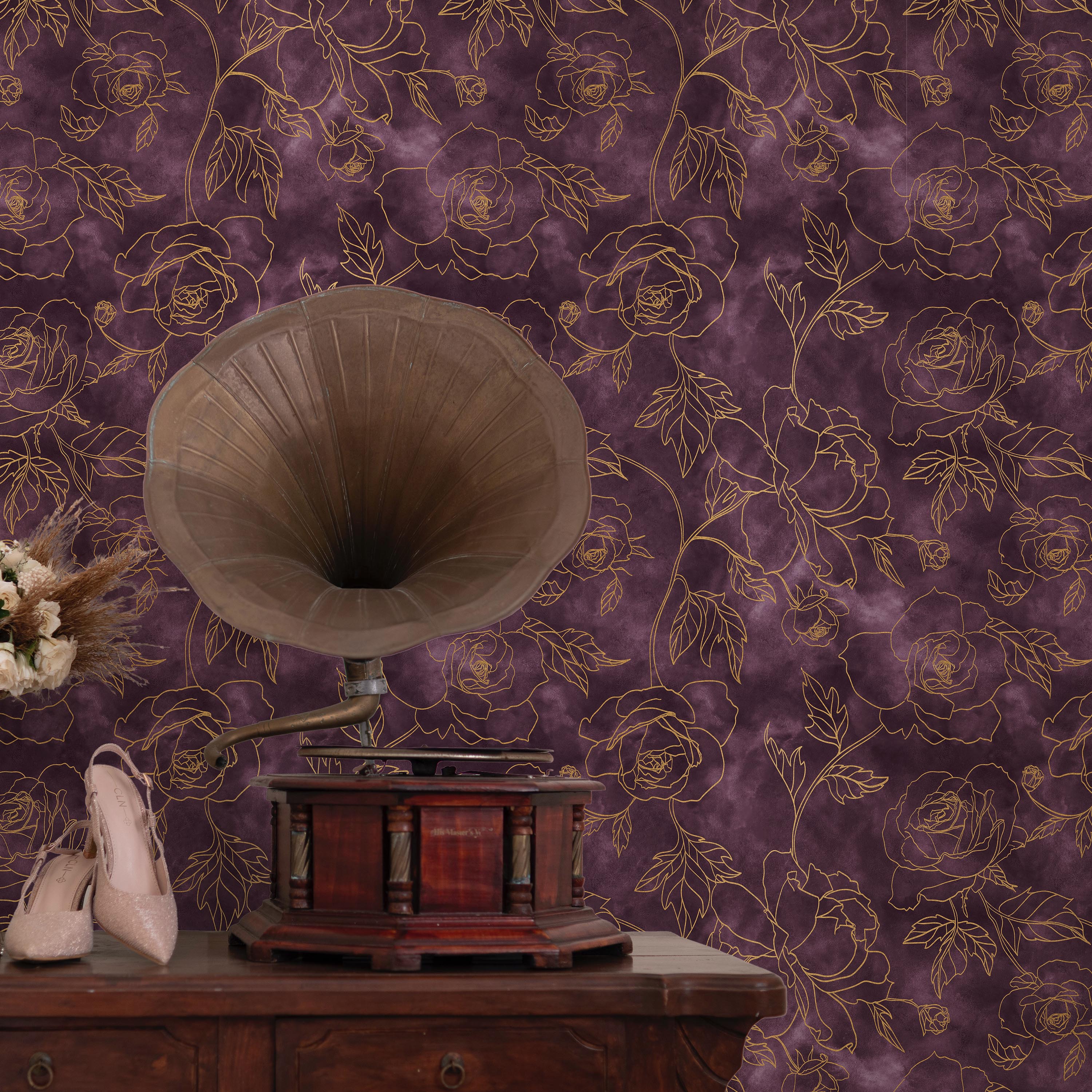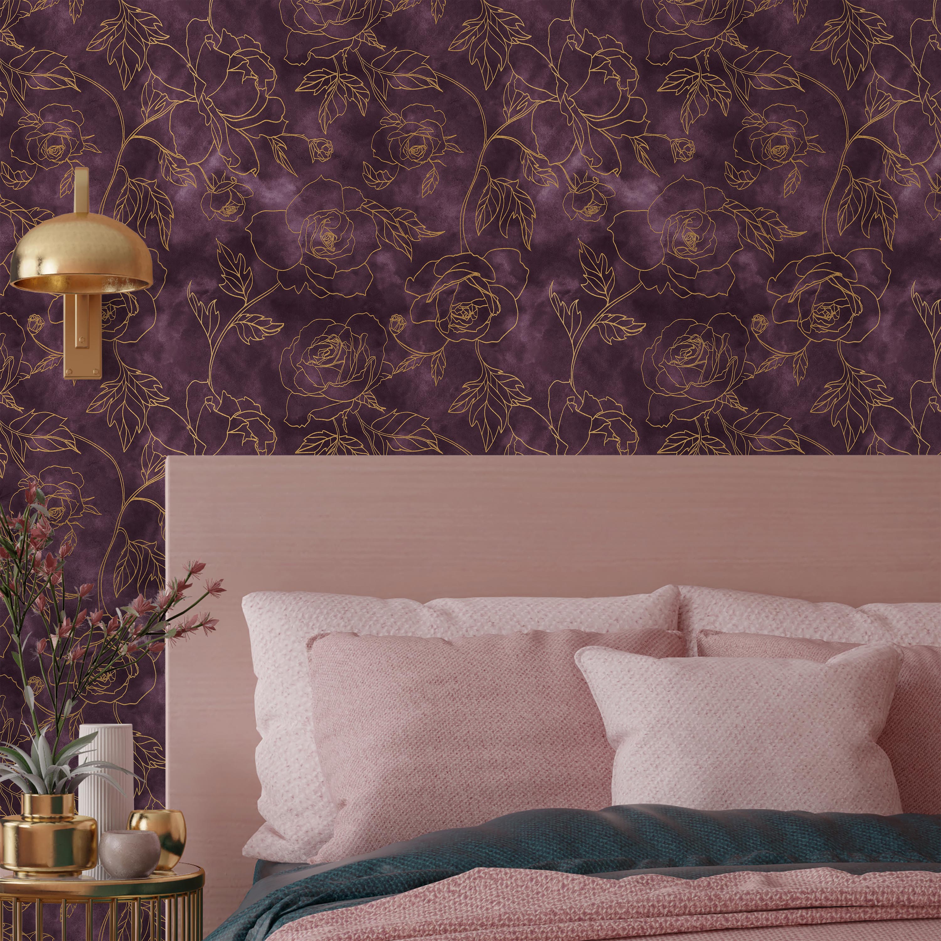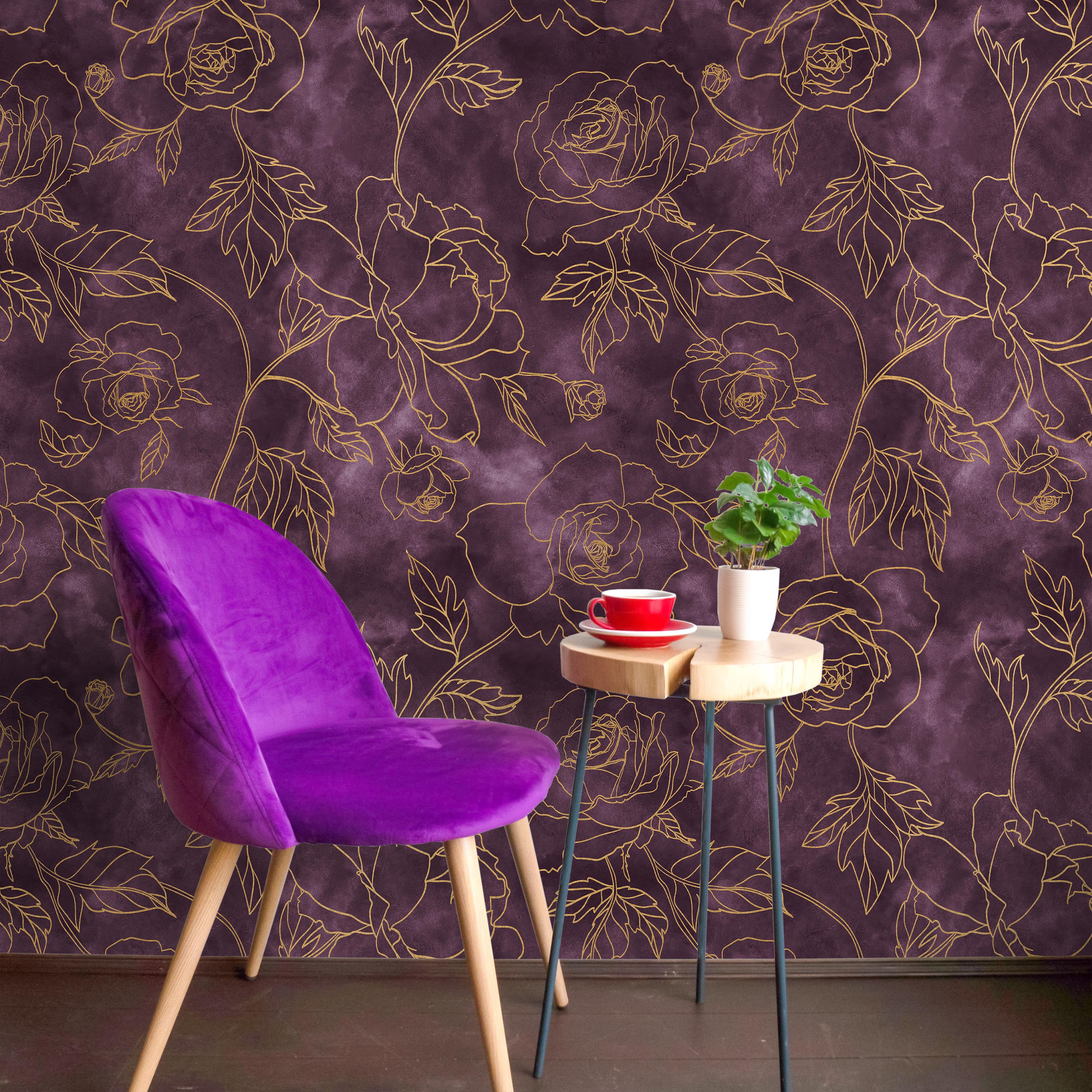 Elevate your interiors with this refined wallpaper showcasing intricate gold floral motifs set against a textured purple surface. The sophisticated botanical design delivers timeless elegance and visual depth, ideal for discerning spaces seeking understated luxury.