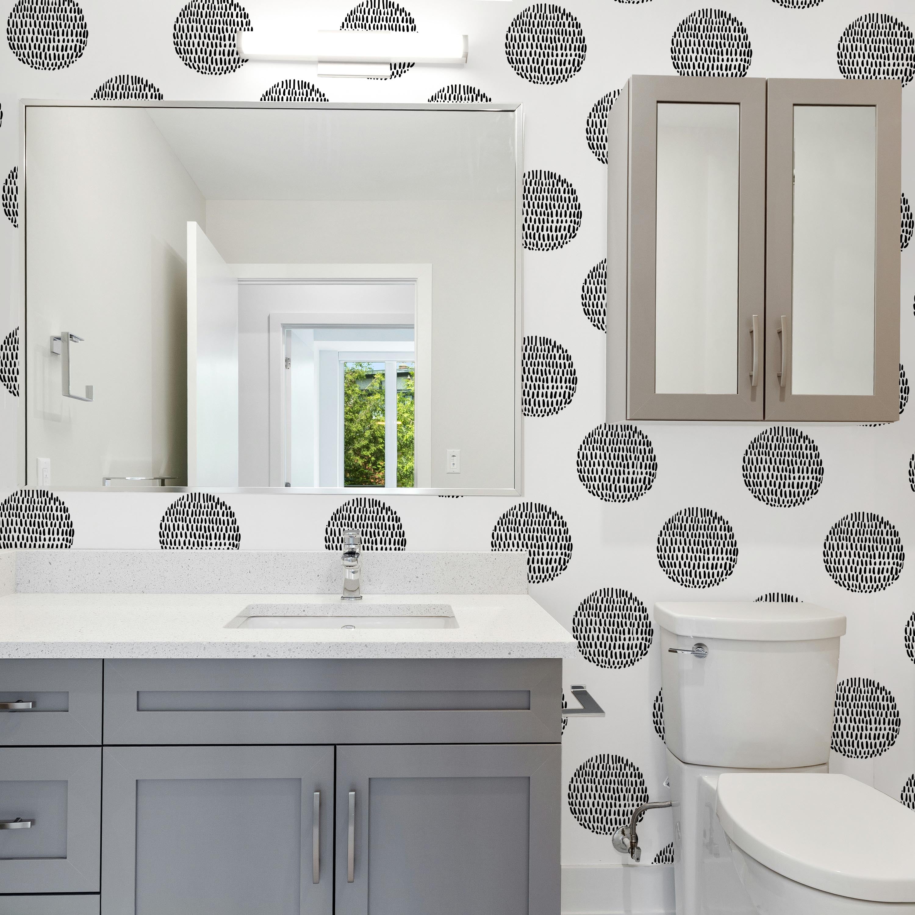 Sophisticated geometric wallpaper featuring organic black circles with fluid, undulating edges against a crisp white backdrop. This contemporary pattern delivers visual interest through its balance of structured form and natural movement, ideal for modern interiors seeking understated elegance.