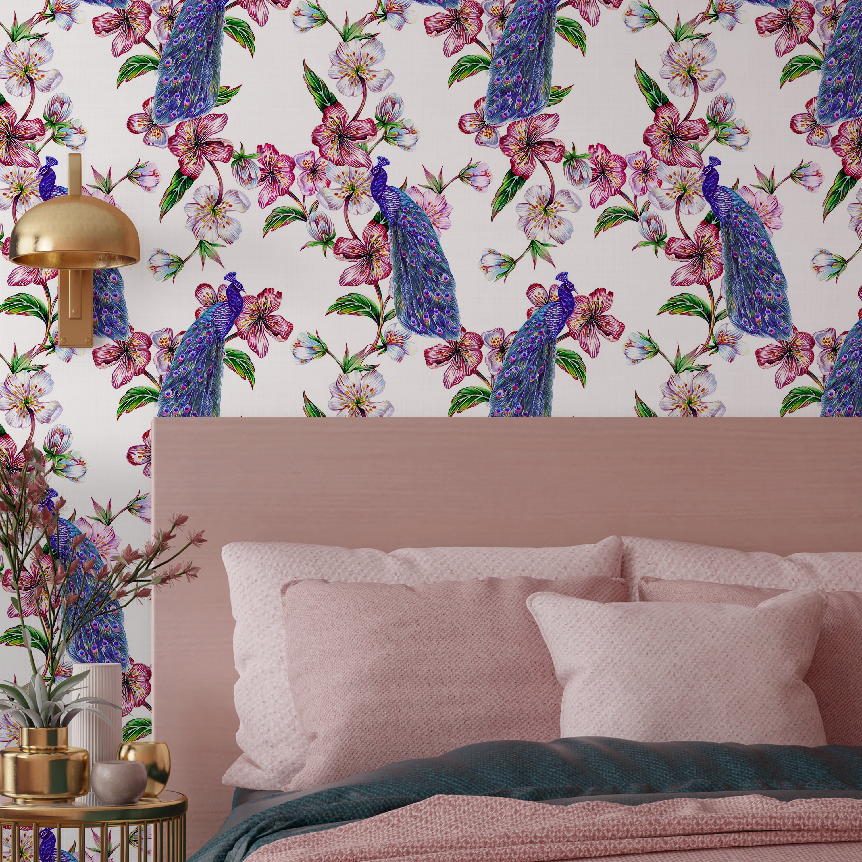 Elegant wallpaper featuring intricate peacocks and blooming florals set against a pristine white backdrop. This timeless design combines ornamental bird motifs with botanical elements, creating a sophisticated aesthetic ideal for traditional and transitional interiors seeking refined visual interest.
