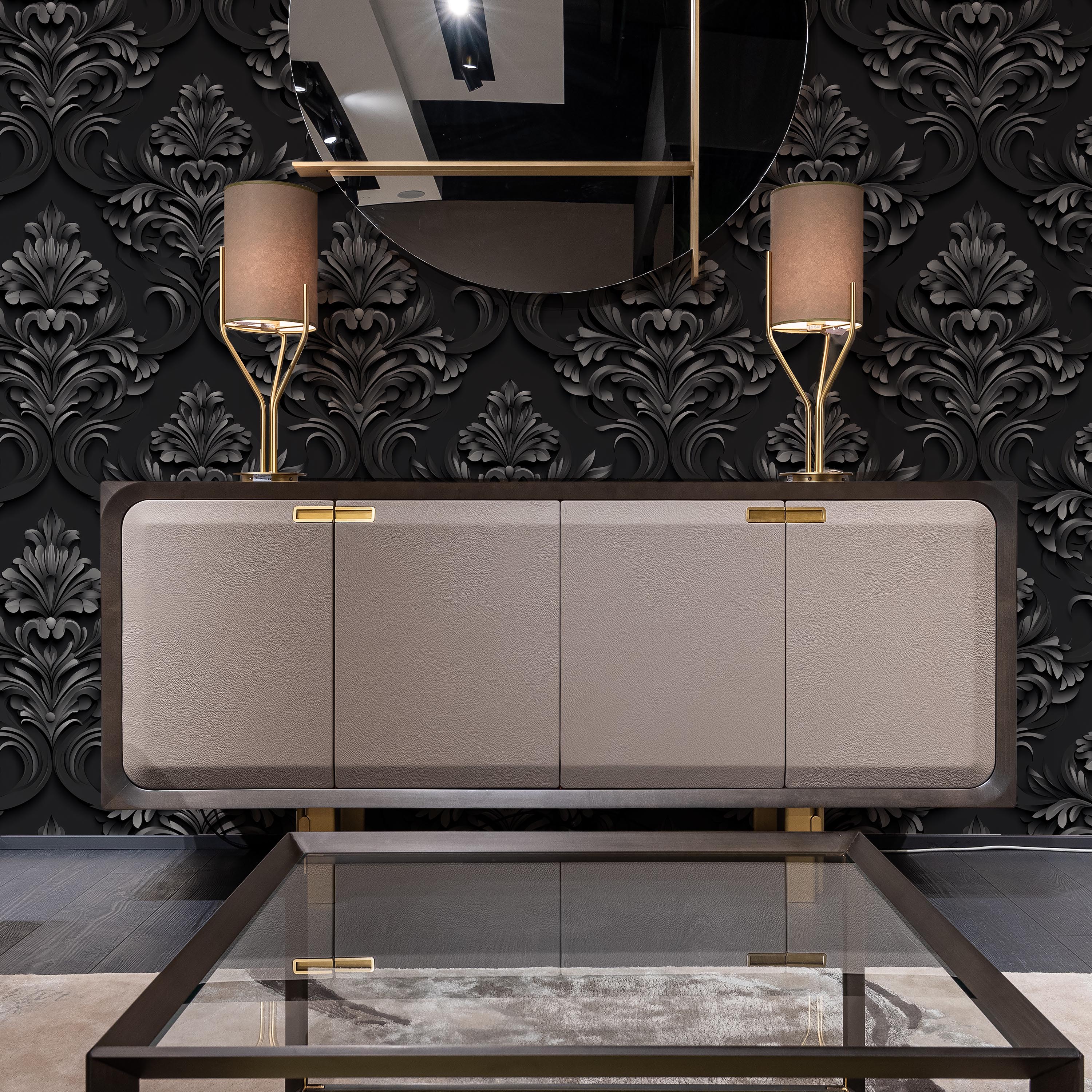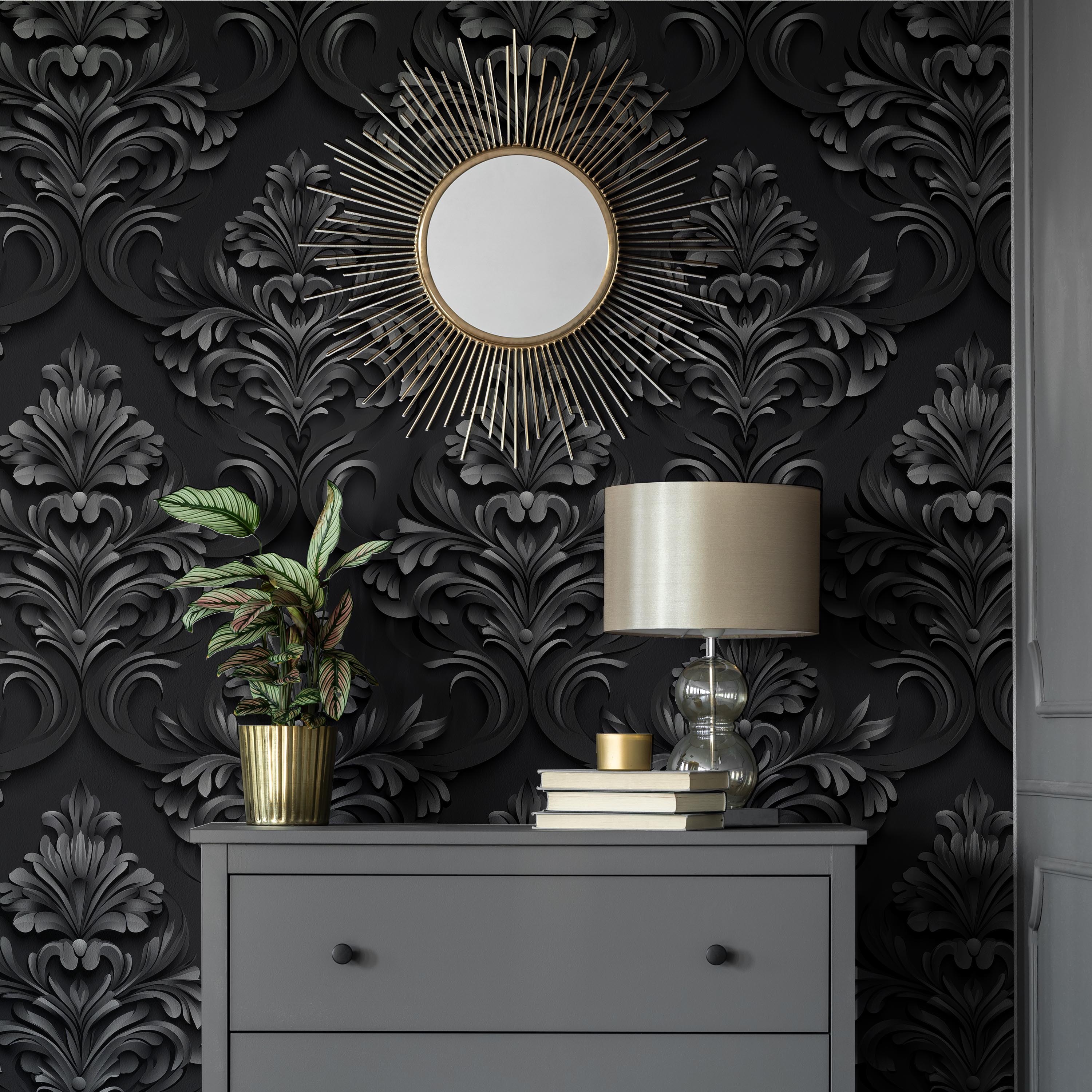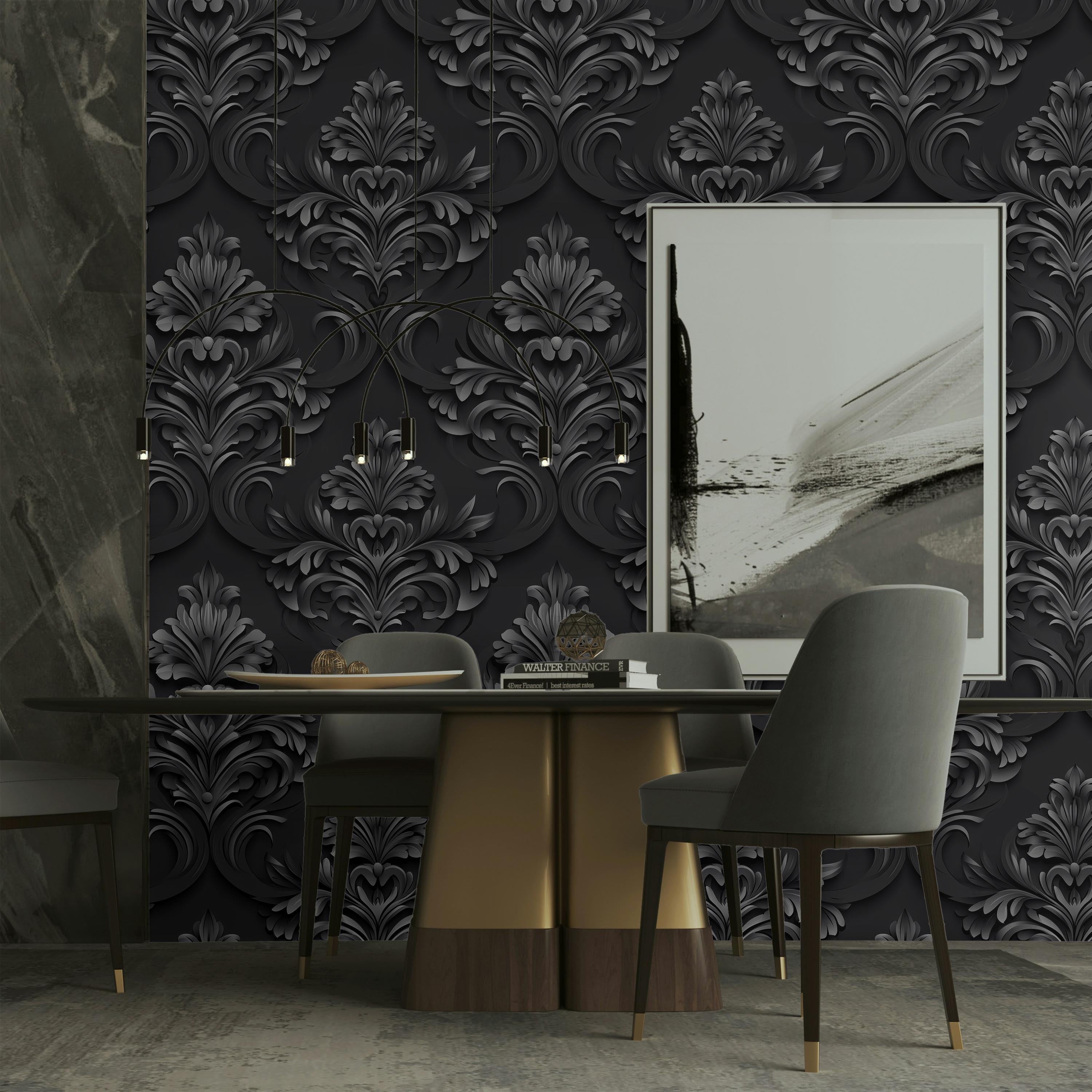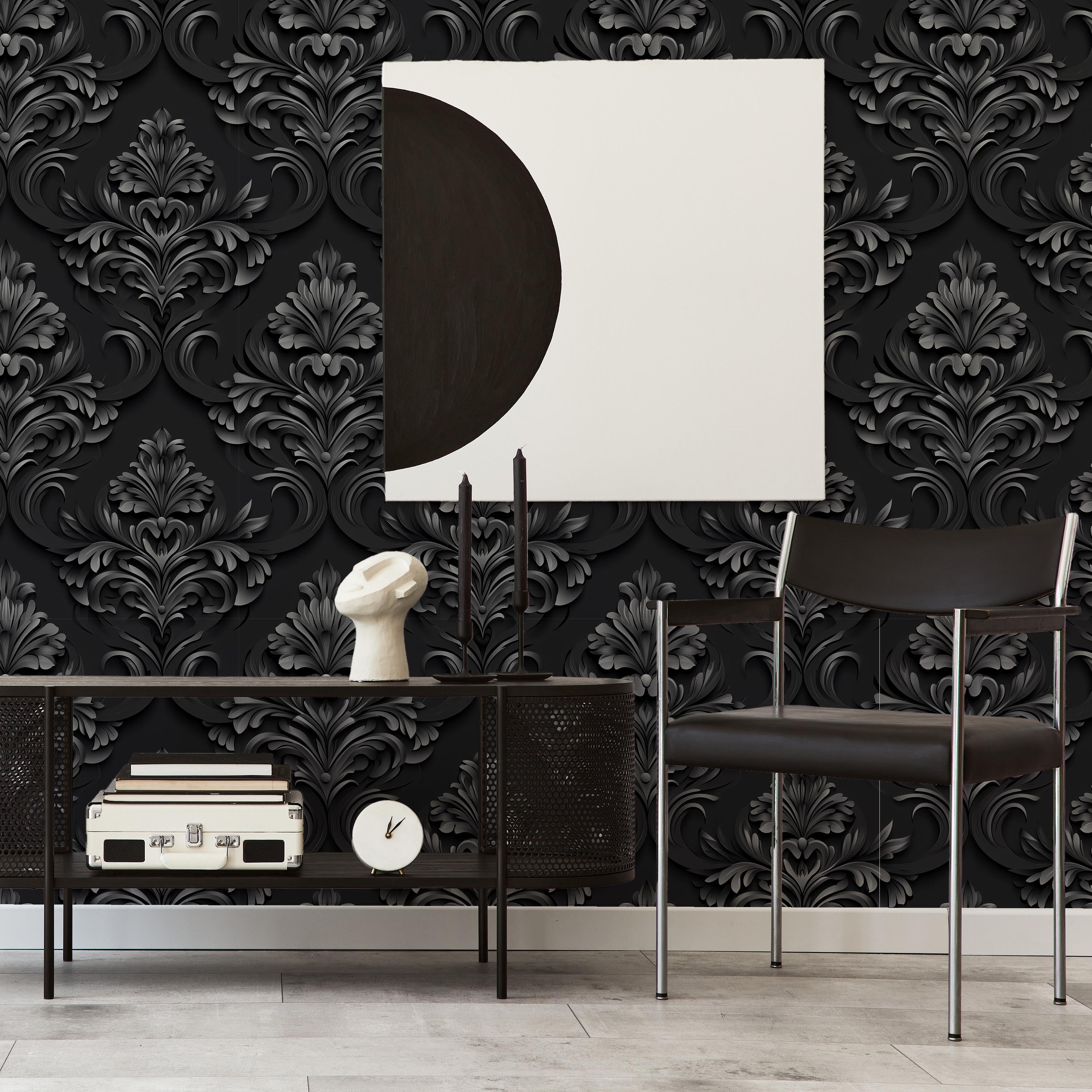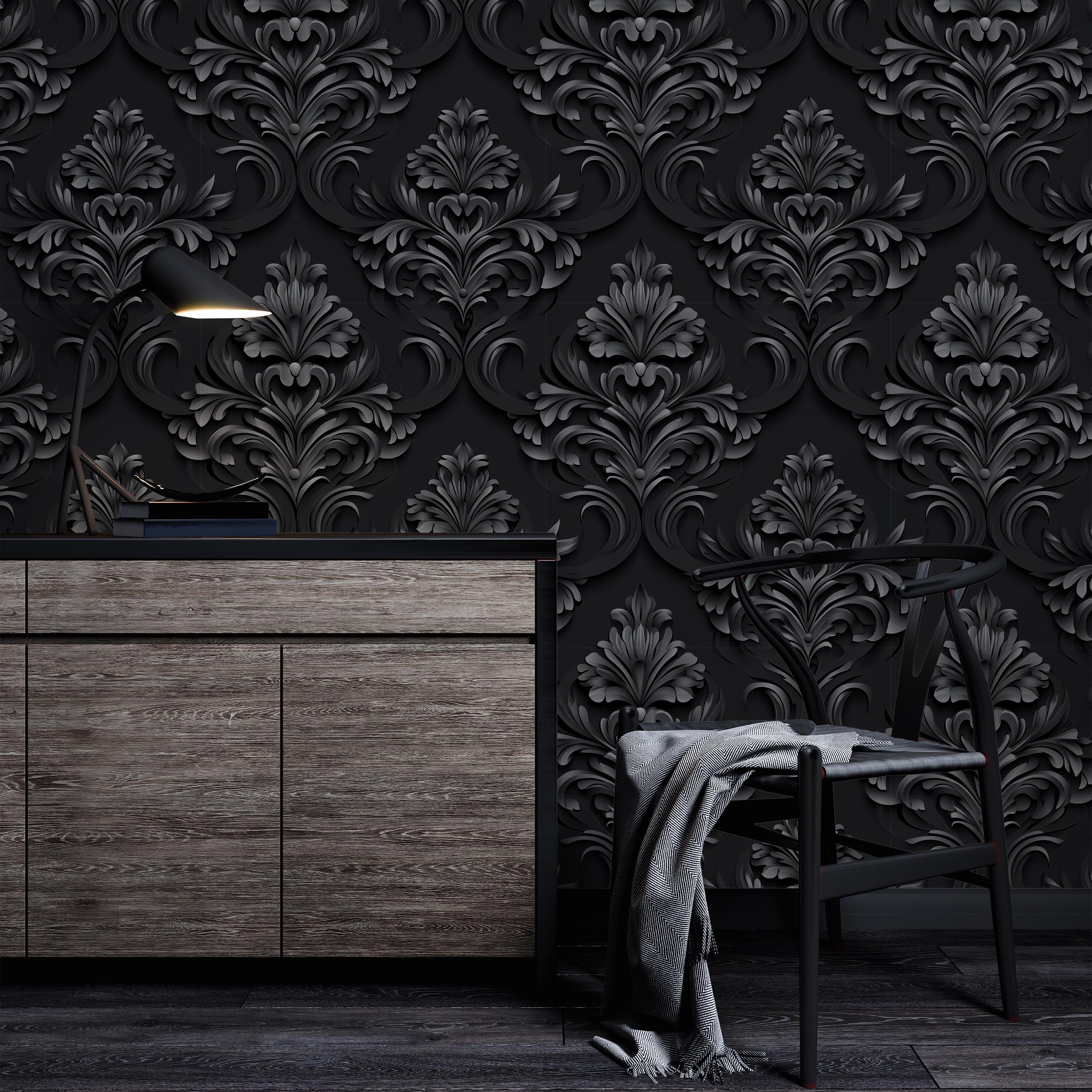 Sophisticated digital interpretation of classical Baroque ornamentation rendered in dark gray against a deep black ground. Ideal for creating dramatic, refined interiors with historical aesthetic appeal and contemporary visual depth.