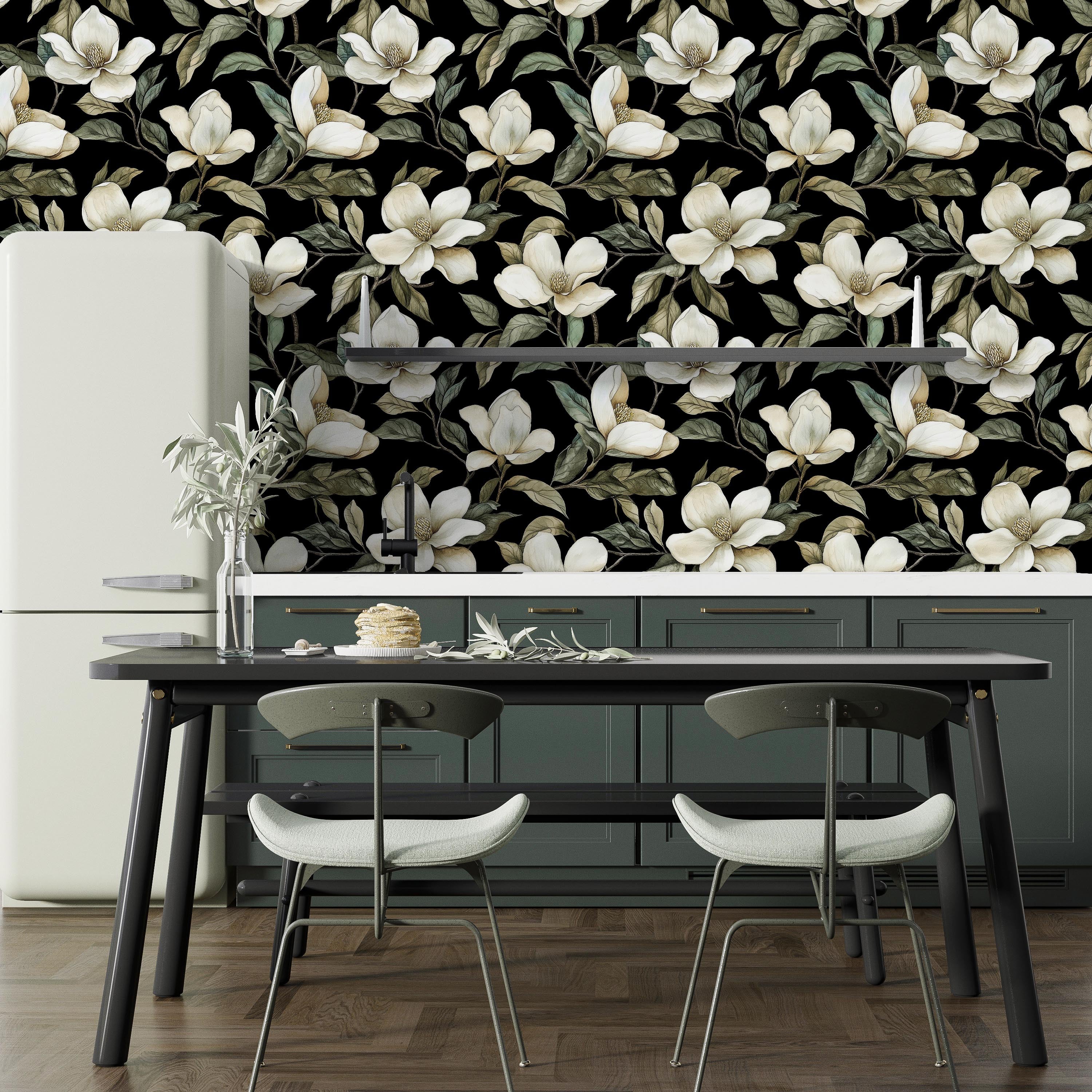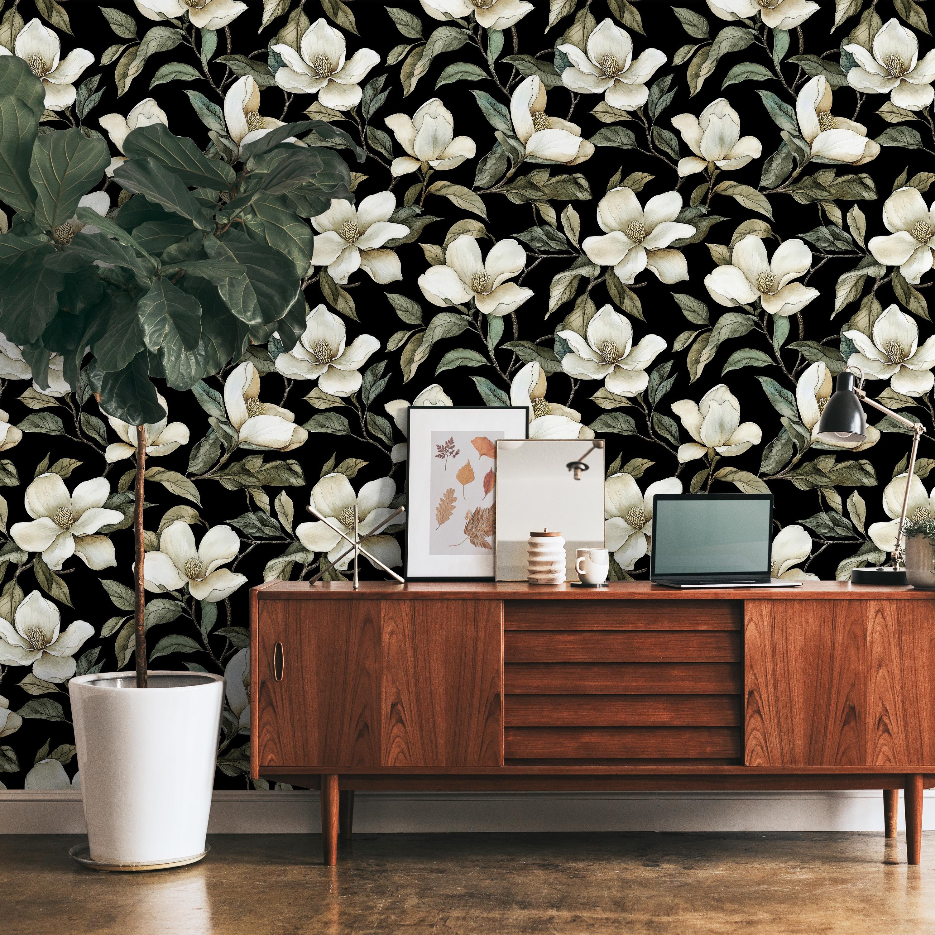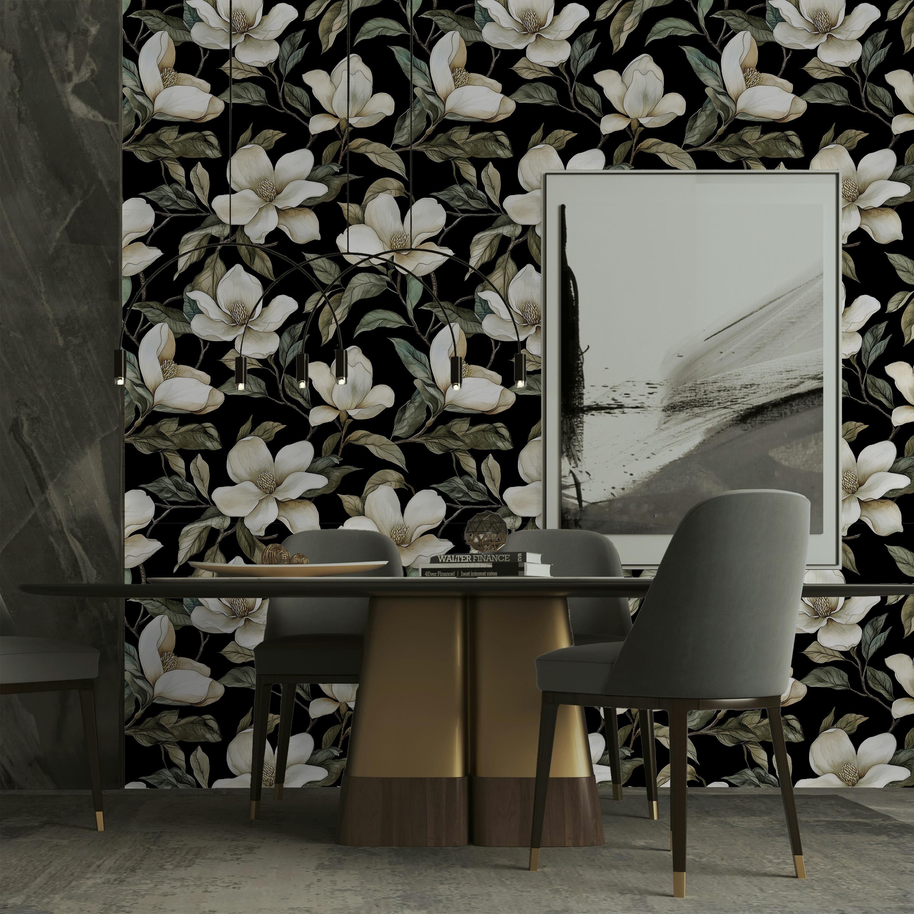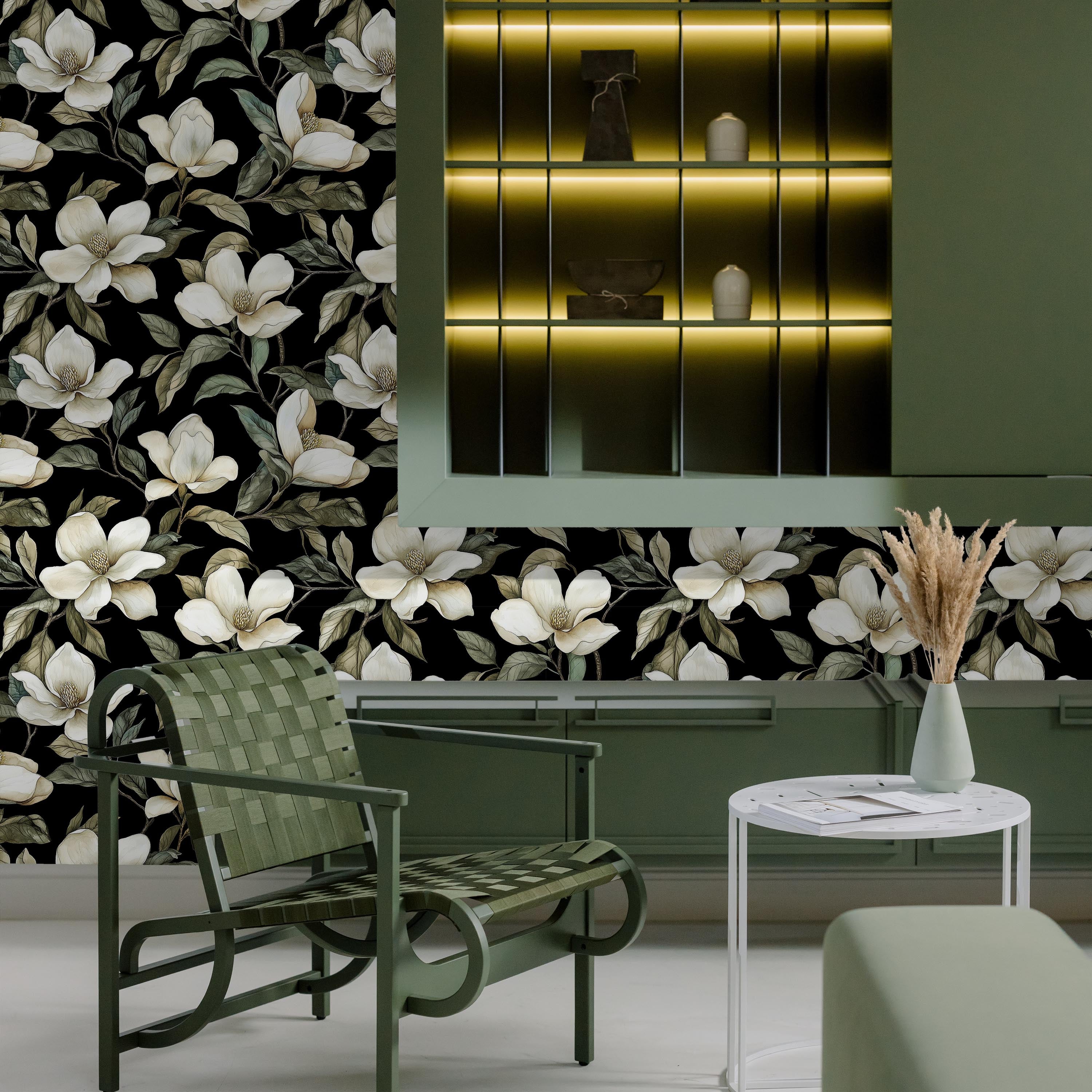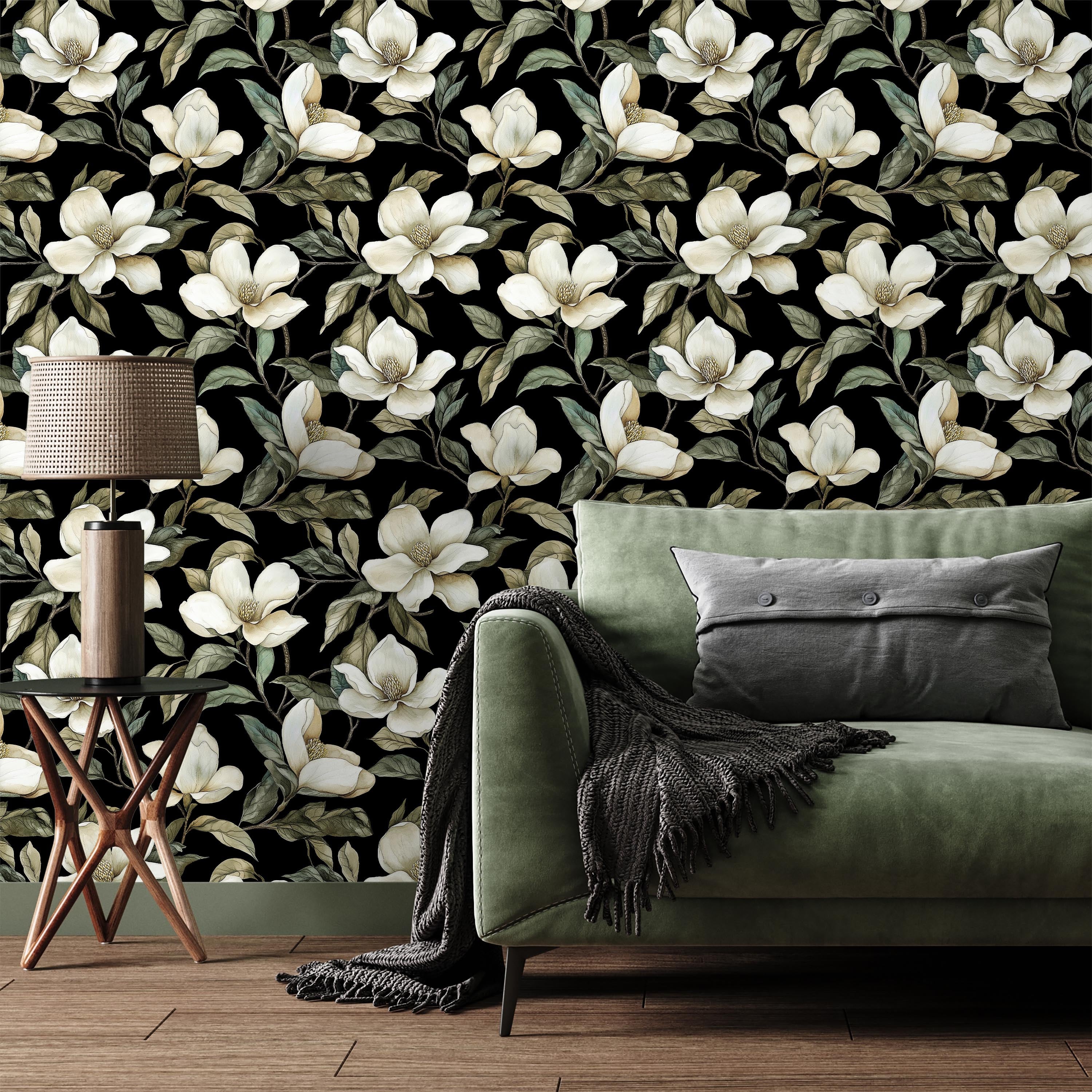 Elegant botanical design featuring delicate white magnolia blossoms and verdant foliage set against a sophisticated black backdrop. This timeless pattern brings refined natural beauty to any interior space with striking contrast and understated luxury.