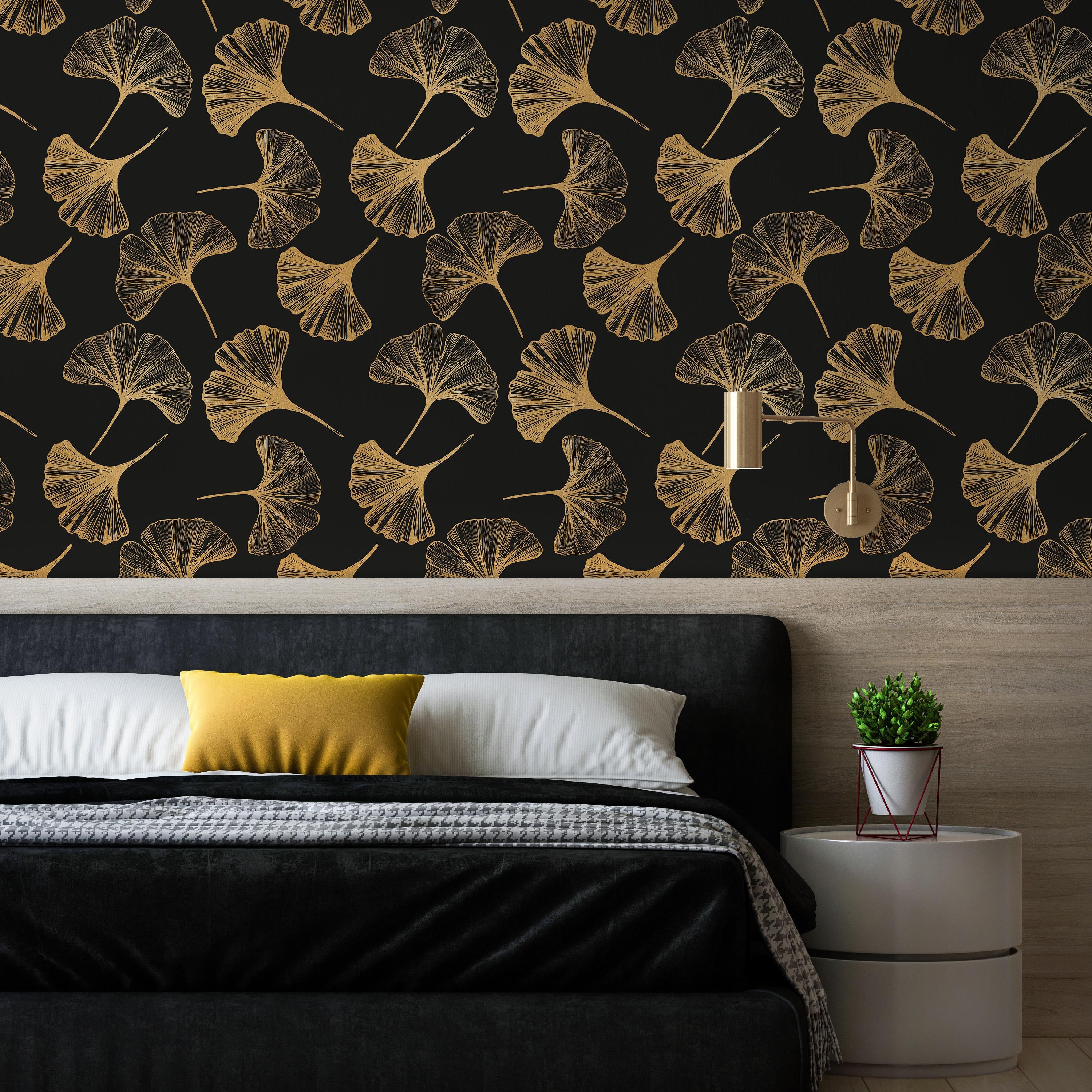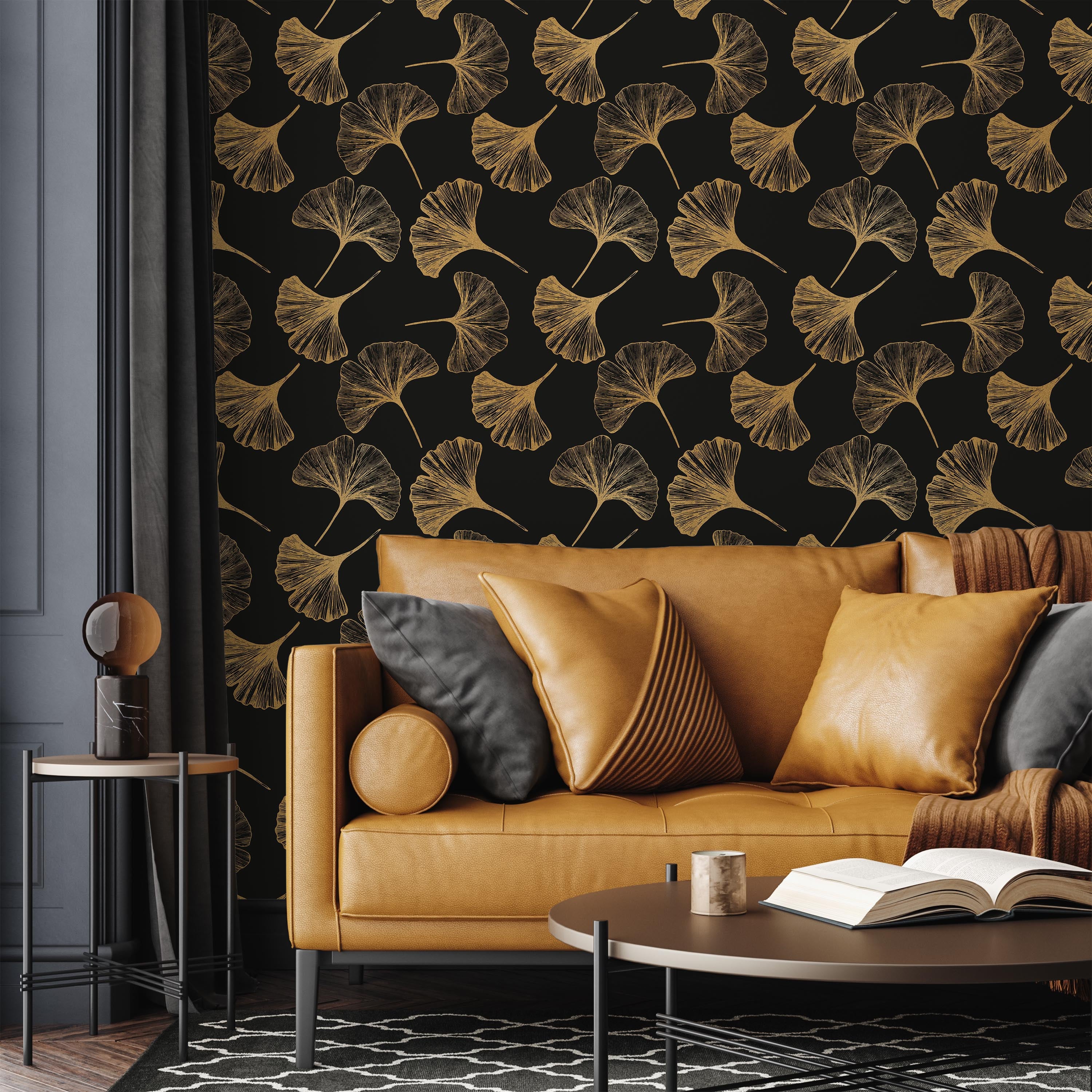 Elegant ginkgo leaf motif rendered in lustrous gold against a sophisticated black backdrop. This timeless botanical pattern brings refined luxury to any interior space, offering a striking balance between contemporary design and classic elegance.