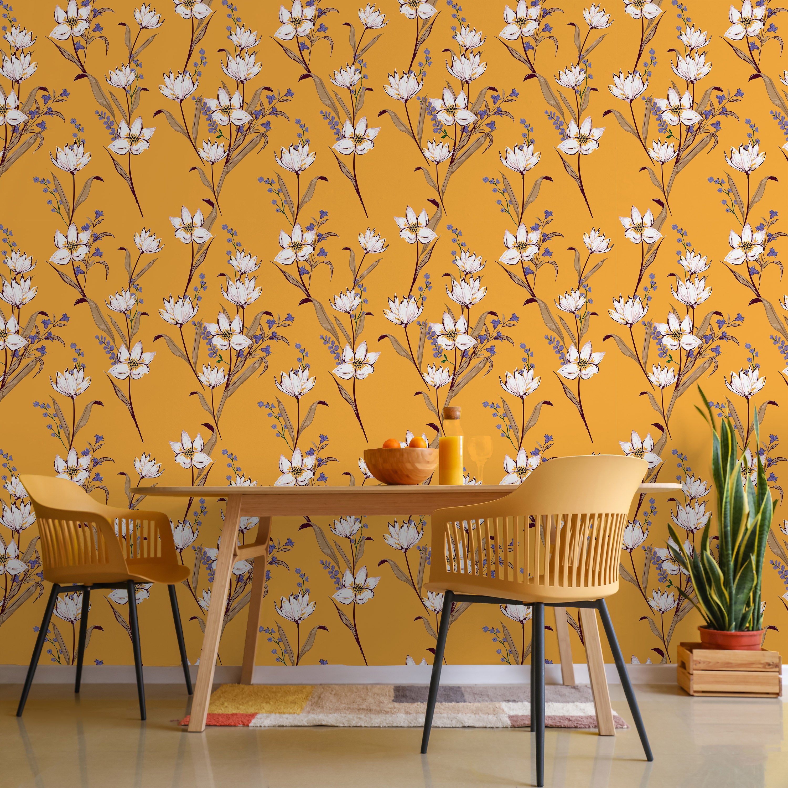 Elegant wallpaper featuring delicate white magnolia blossoms and rich brown foliage set against a warm yellow backdrop. This sophisticated floral design brings botanical charm and timeless elegance to any interior space.