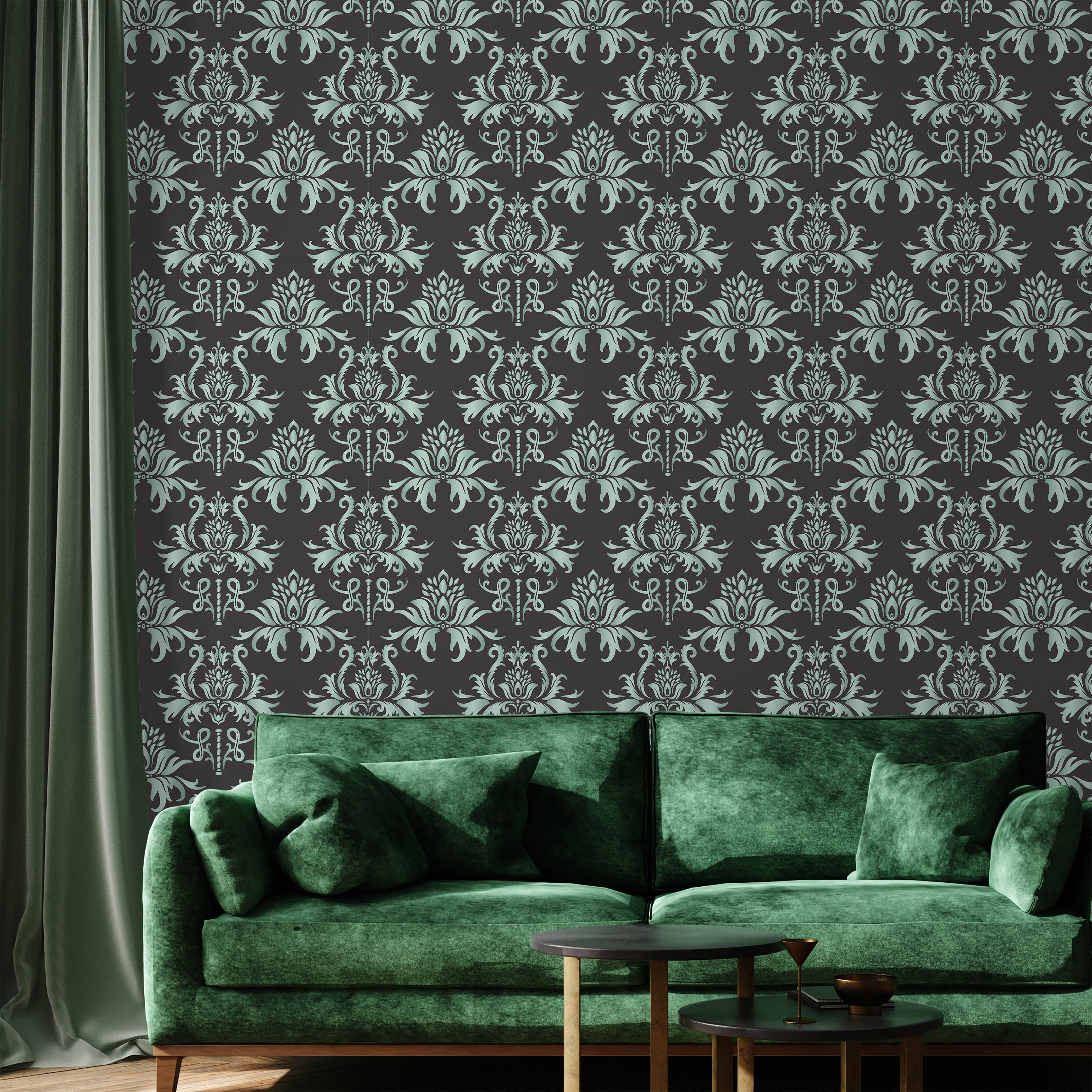 Sophisticated teal floral damask design set against a rich dark backdrop. This classic pattern brings timeless elegance and refined aesthetic appeal to any interior space, perfect for creating a statement wall or adding vintage-inspired character to your décor.