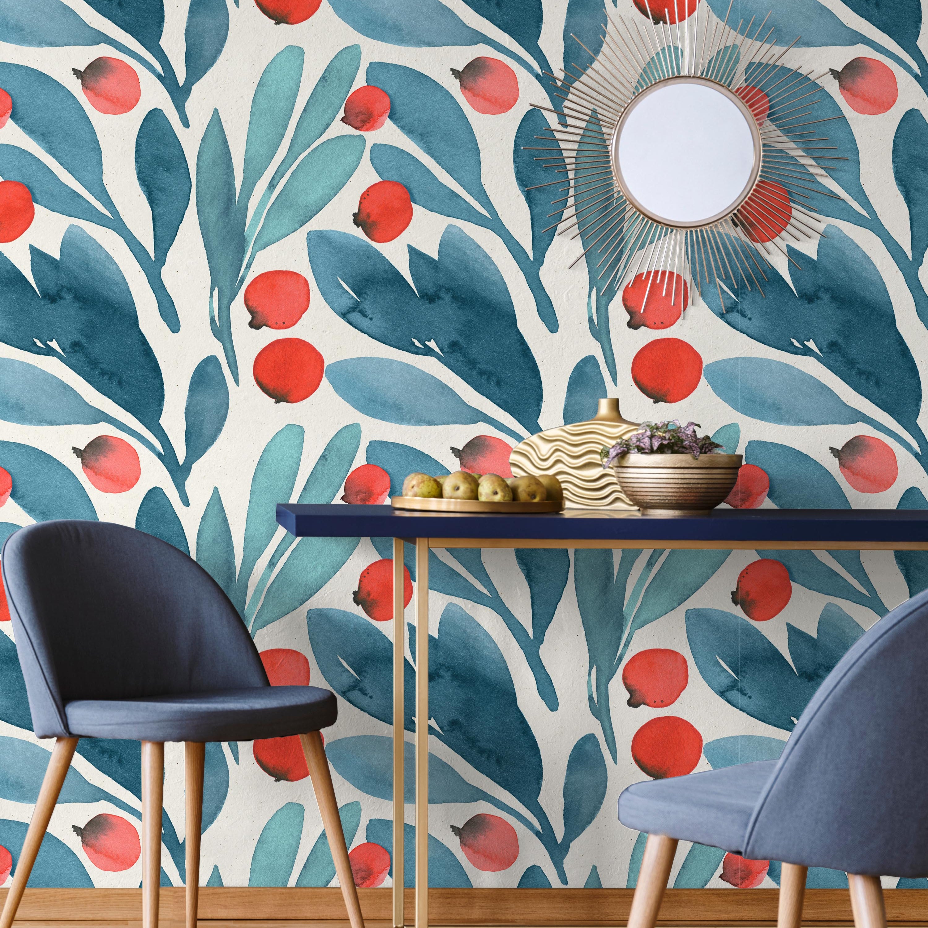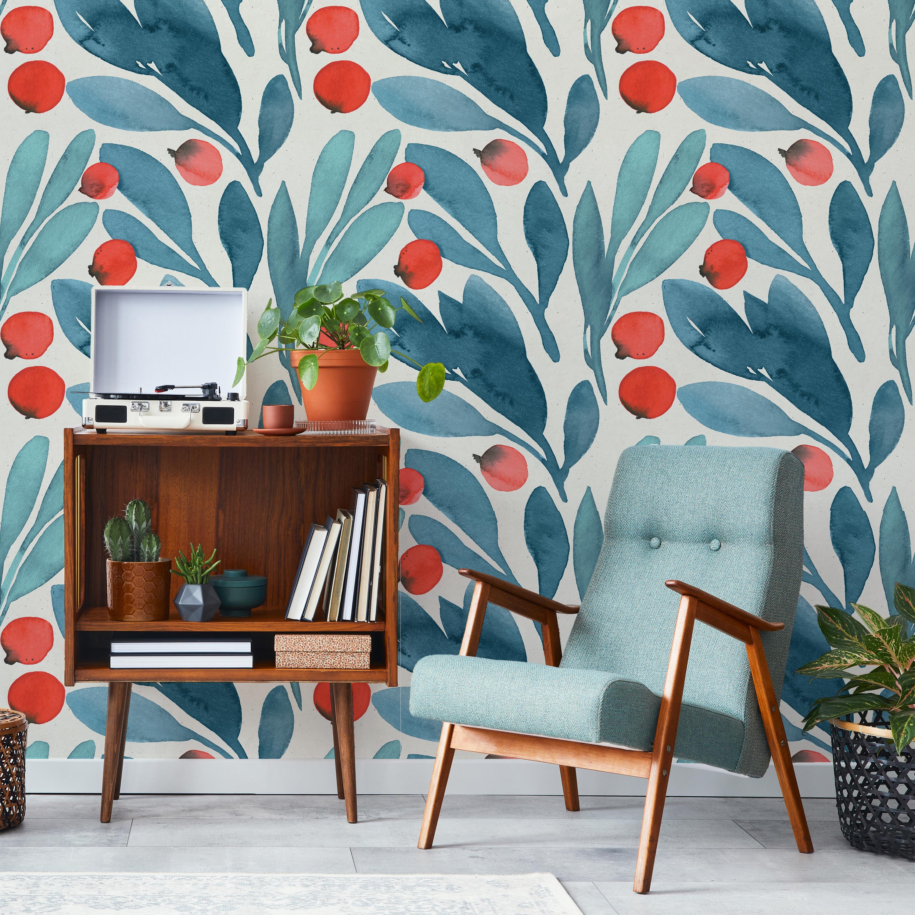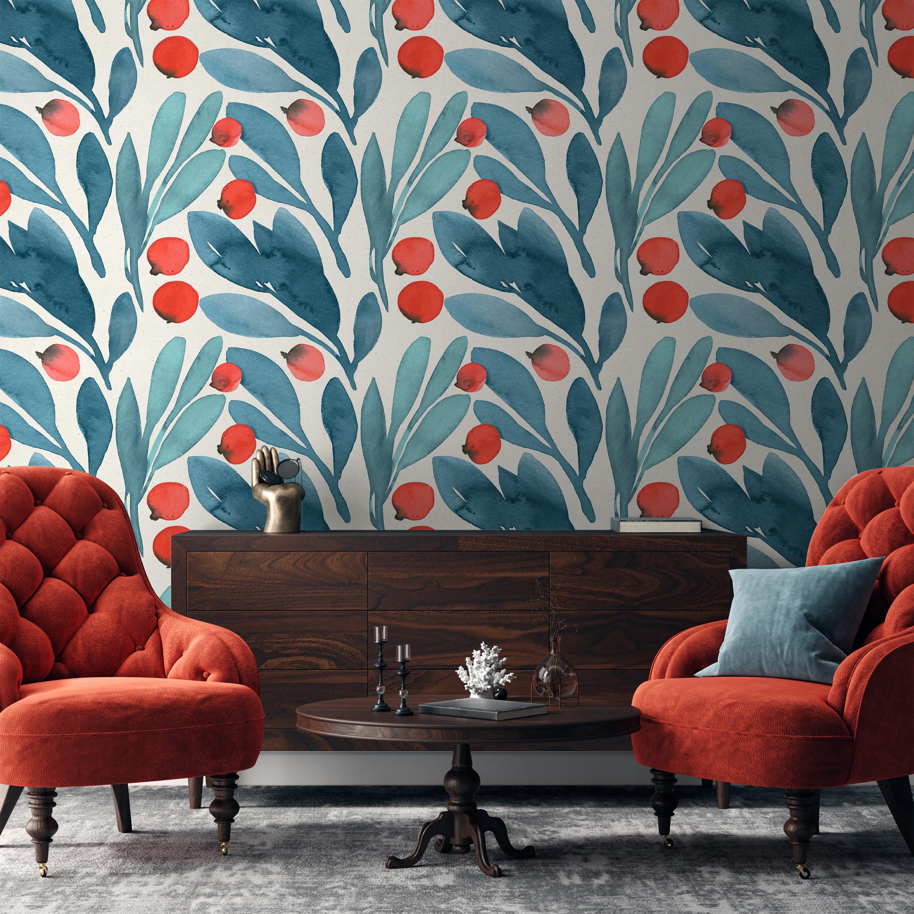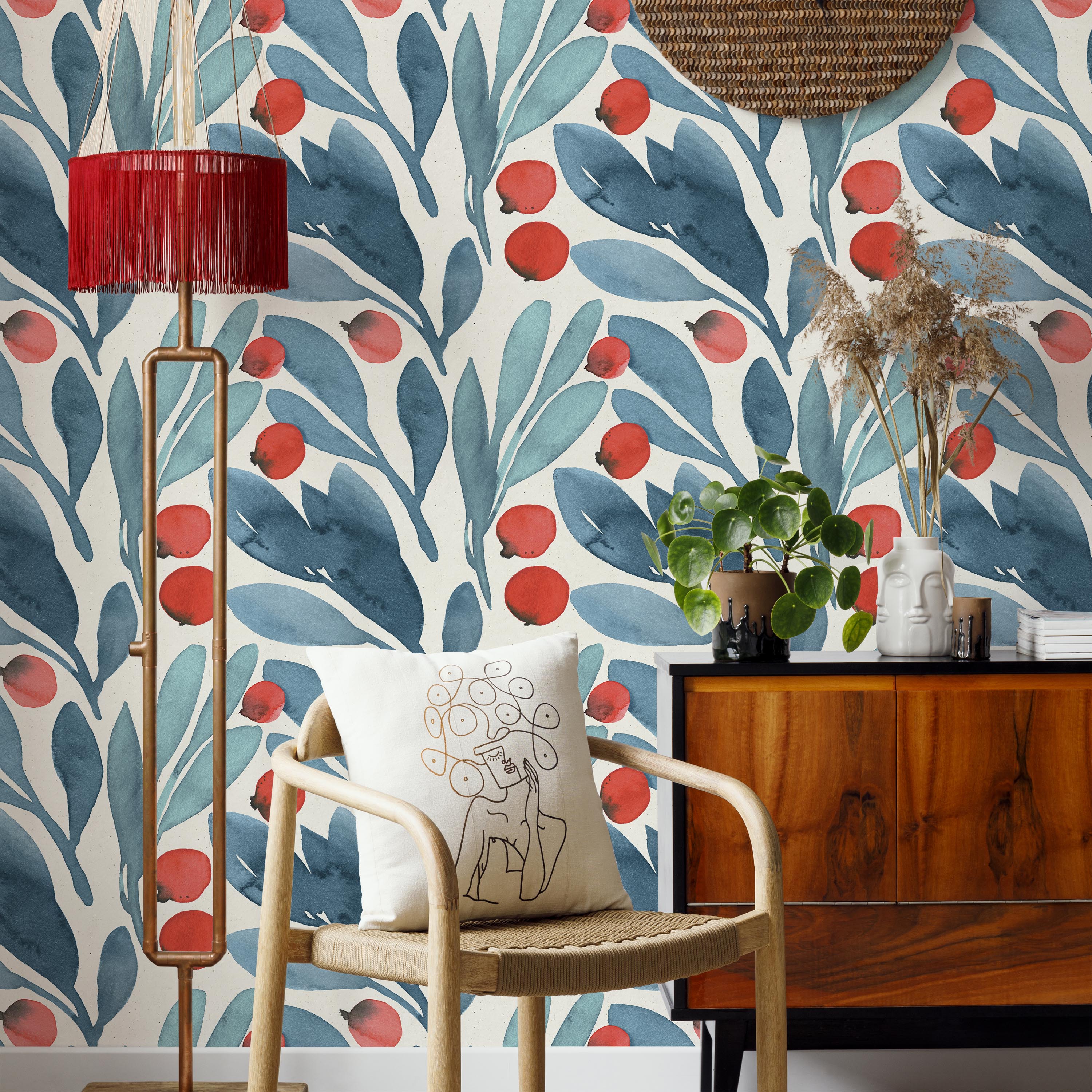 Elegant botanical wallpaper featuring a sophisticated pattern of azure foliage interspersed with crimson berries against a soft, neutral backdrop. This timeless design brings natural beauty and refined charm to any interior space.