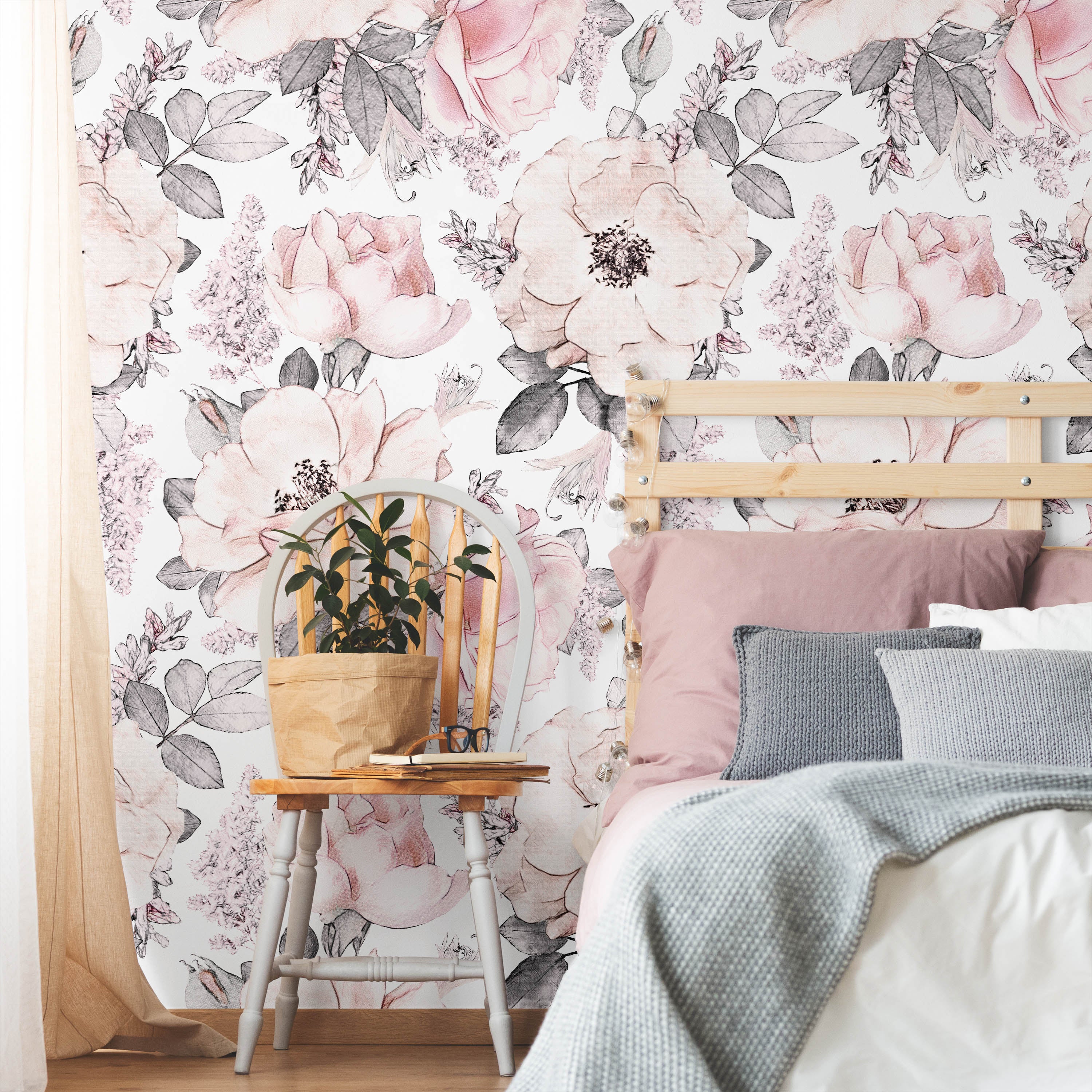Timeless floral design featuring delicate pink roses and verdant foliage against a pristine white backdrop. This sophisticated pattern brings botanical elegance to any interior space, offering a classic aesthetic that complements both traditional and contemporary décor schemes.