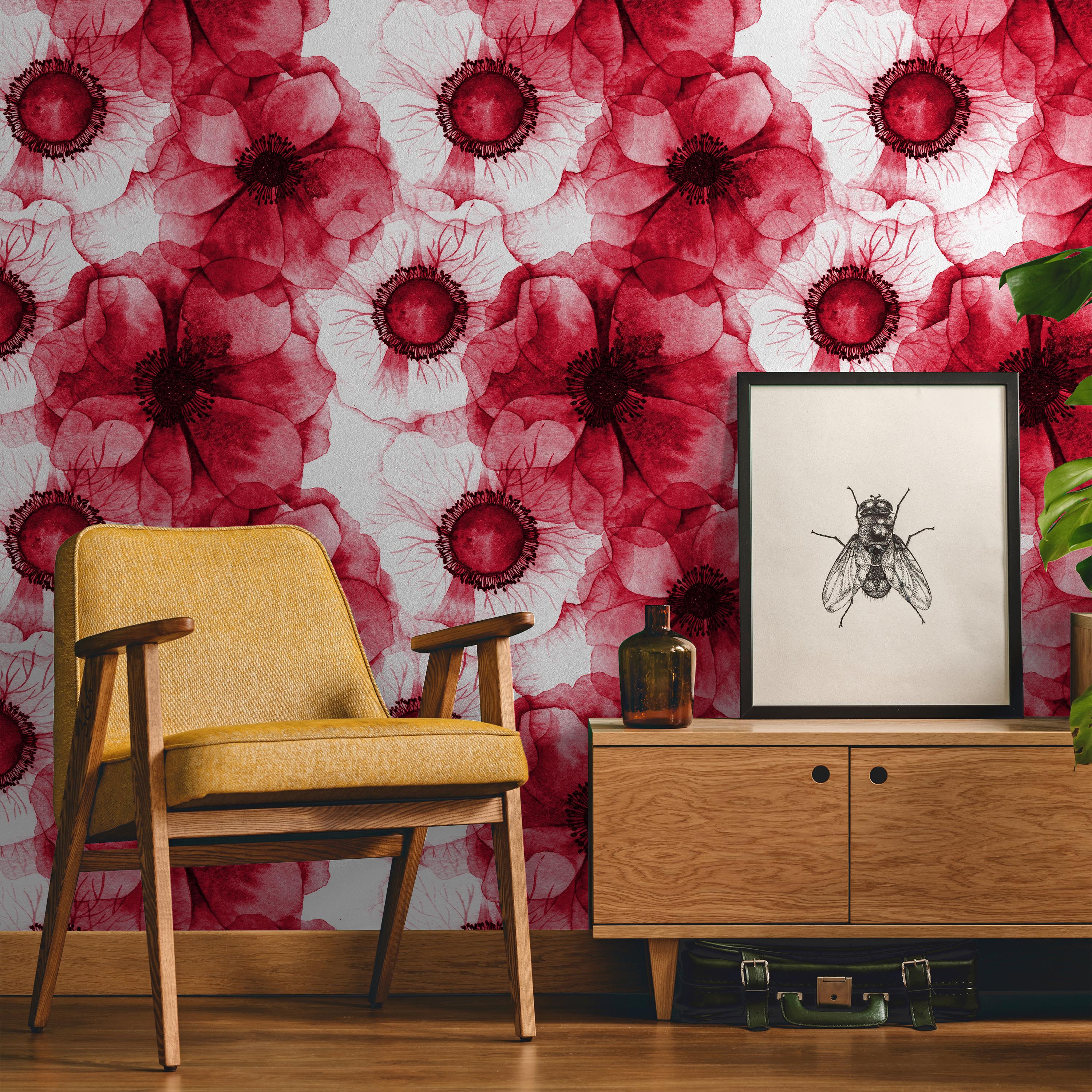 Striking botanical wallpaper featuring vibrant red and white poppies rendered with meticulous attention to texture and chromatic depth. The close-up composition captures delicate petals and natural variations, bringing sophisticated botanical artistry to any interior space.
