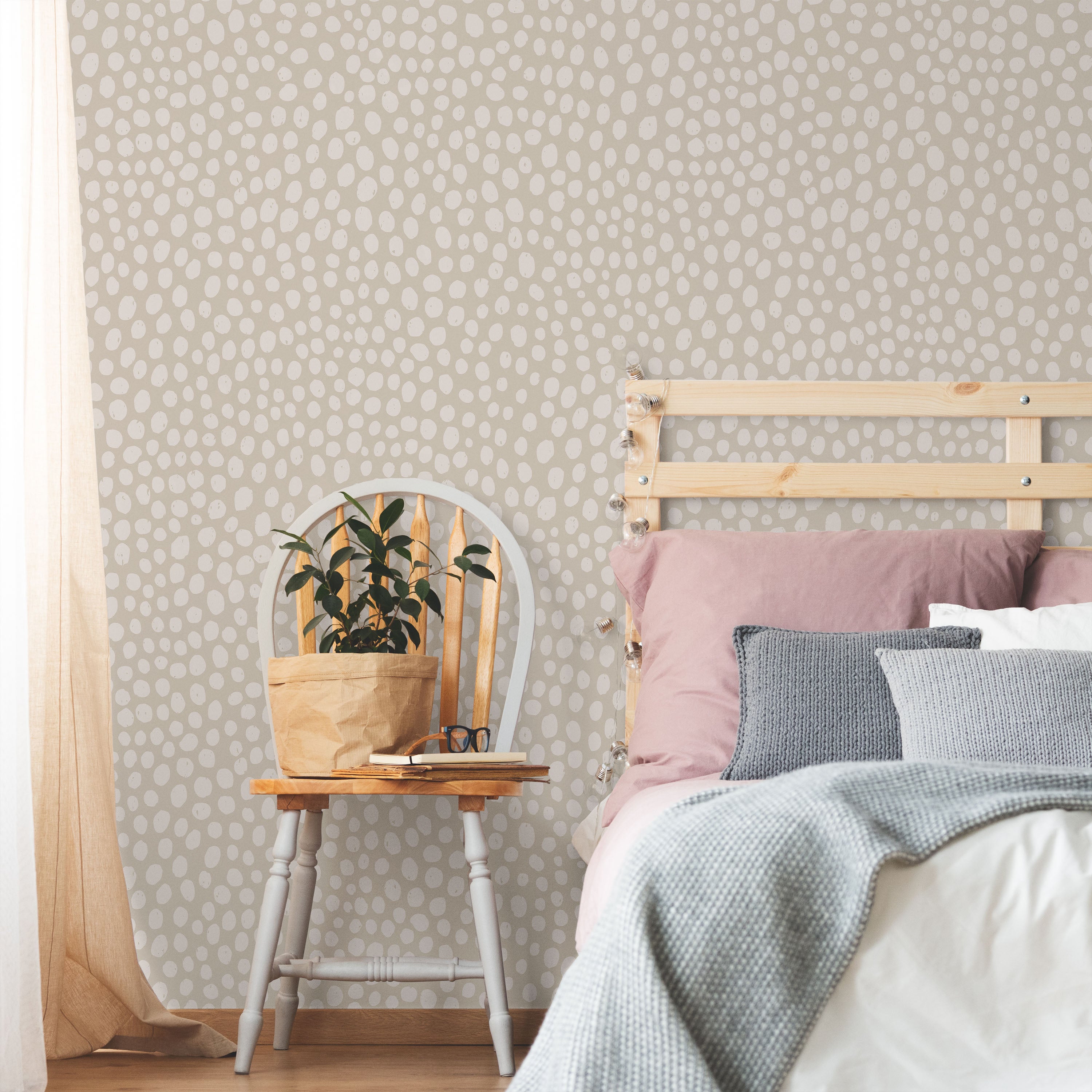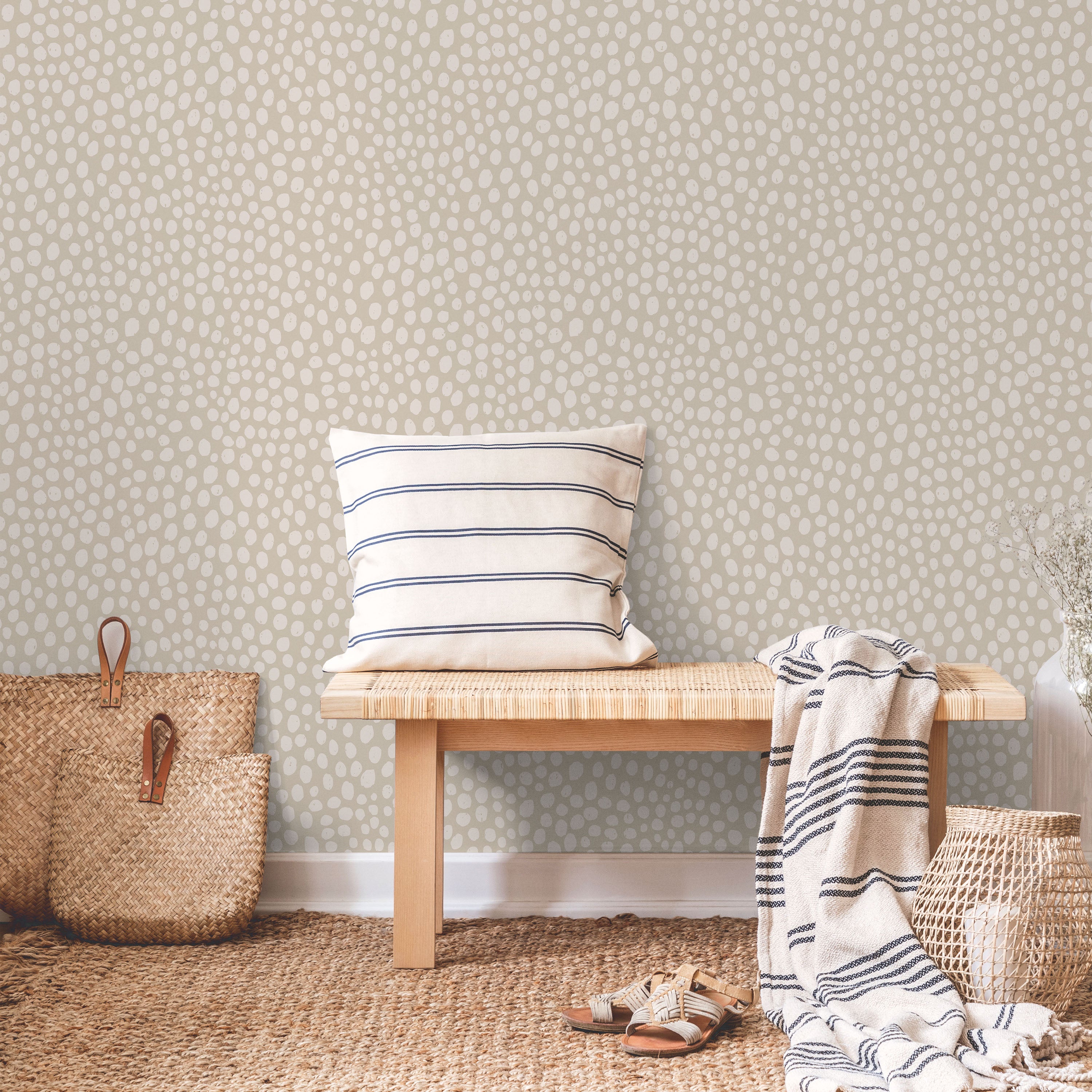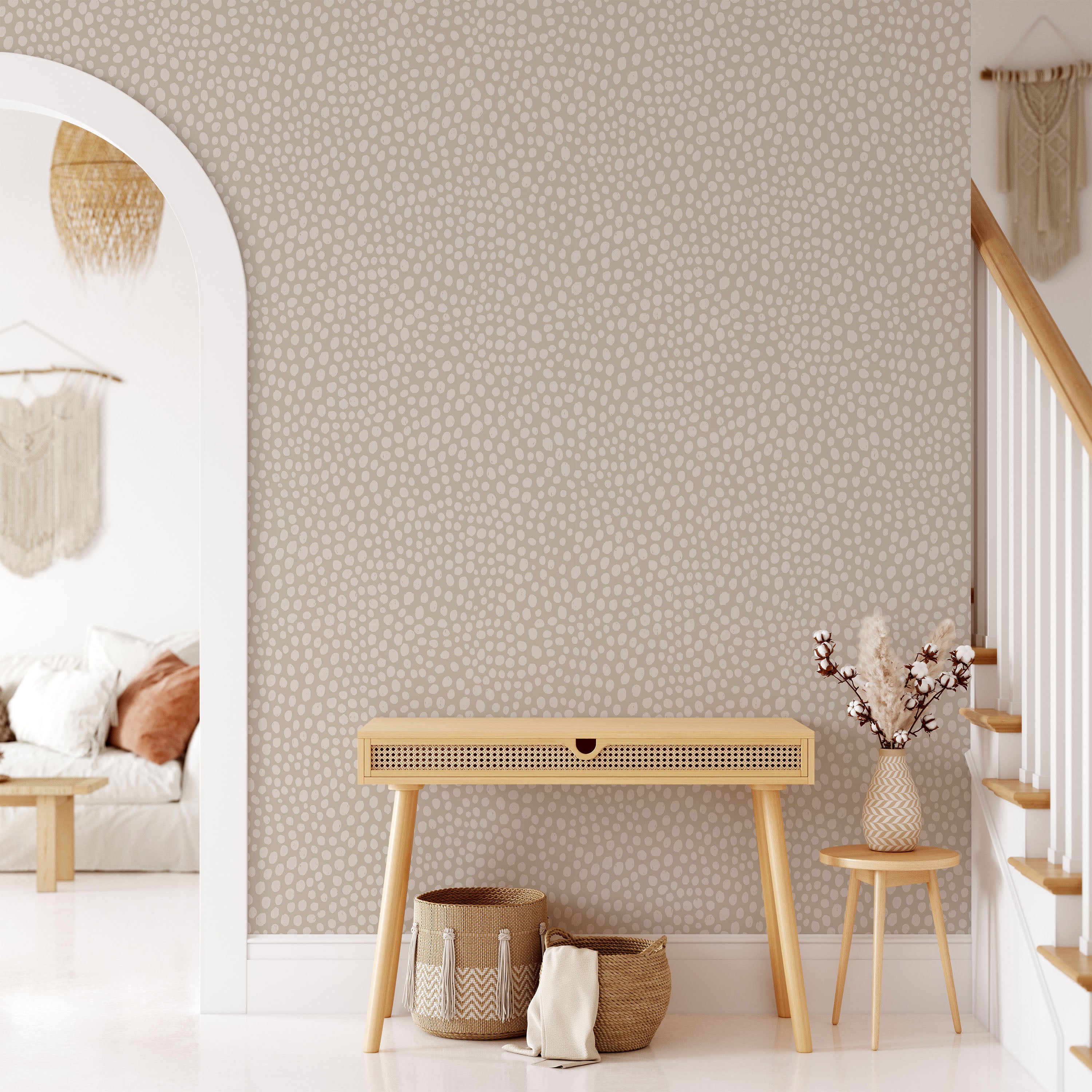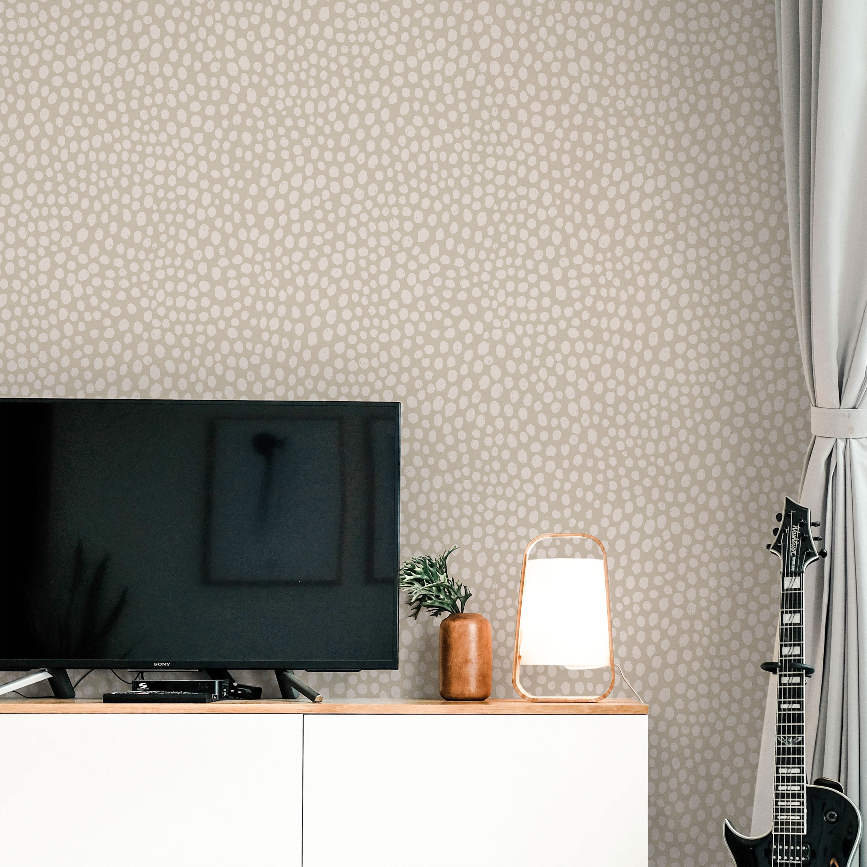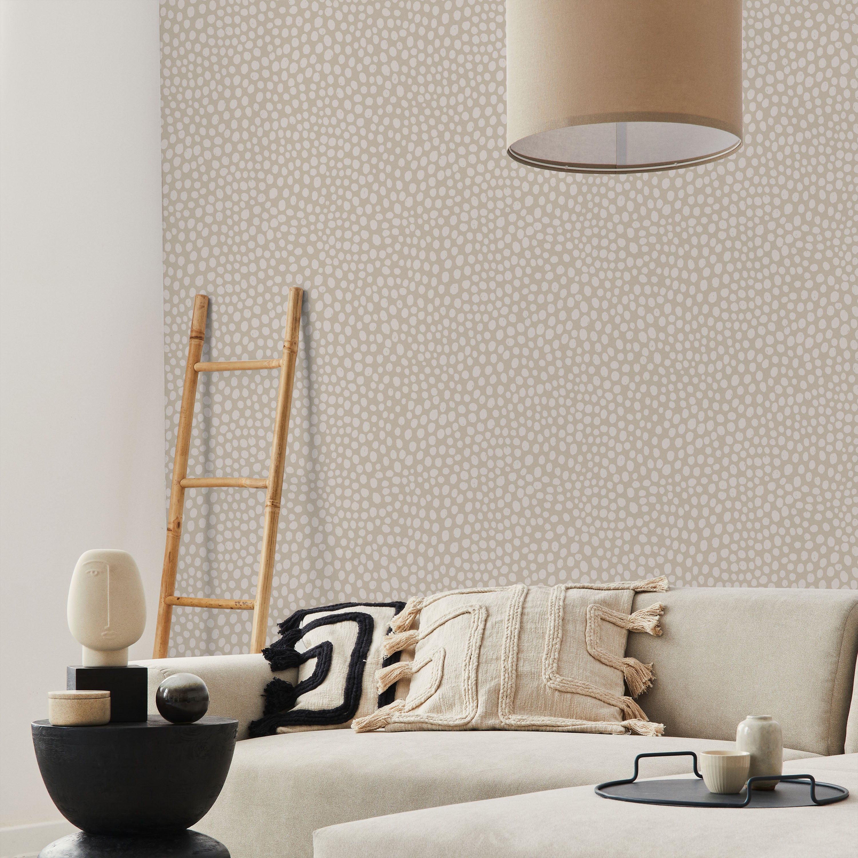 Delicate white spots mimic cheetah markings on soft sand-beige base. Understated animal print brings texture and warmth without dominance. Complements neutral palettes and works across residential and commercial settings seeking organic visual interest.