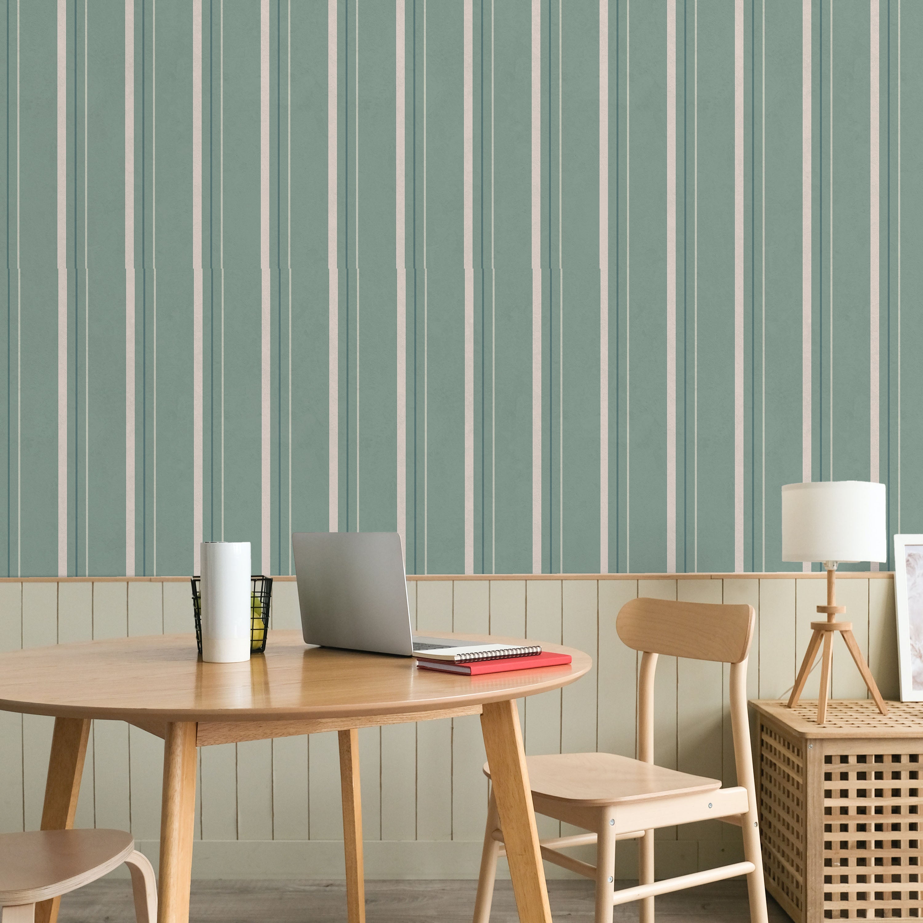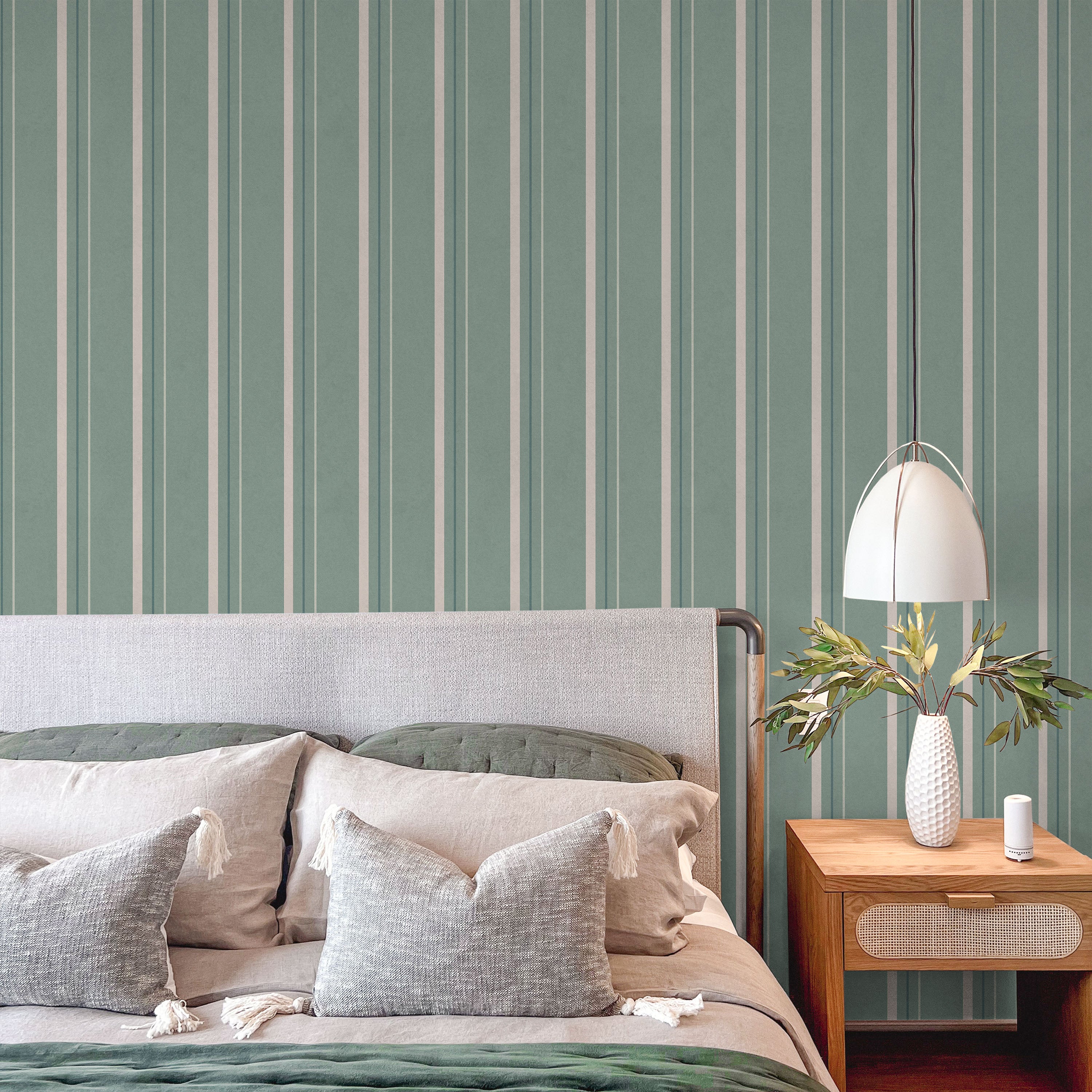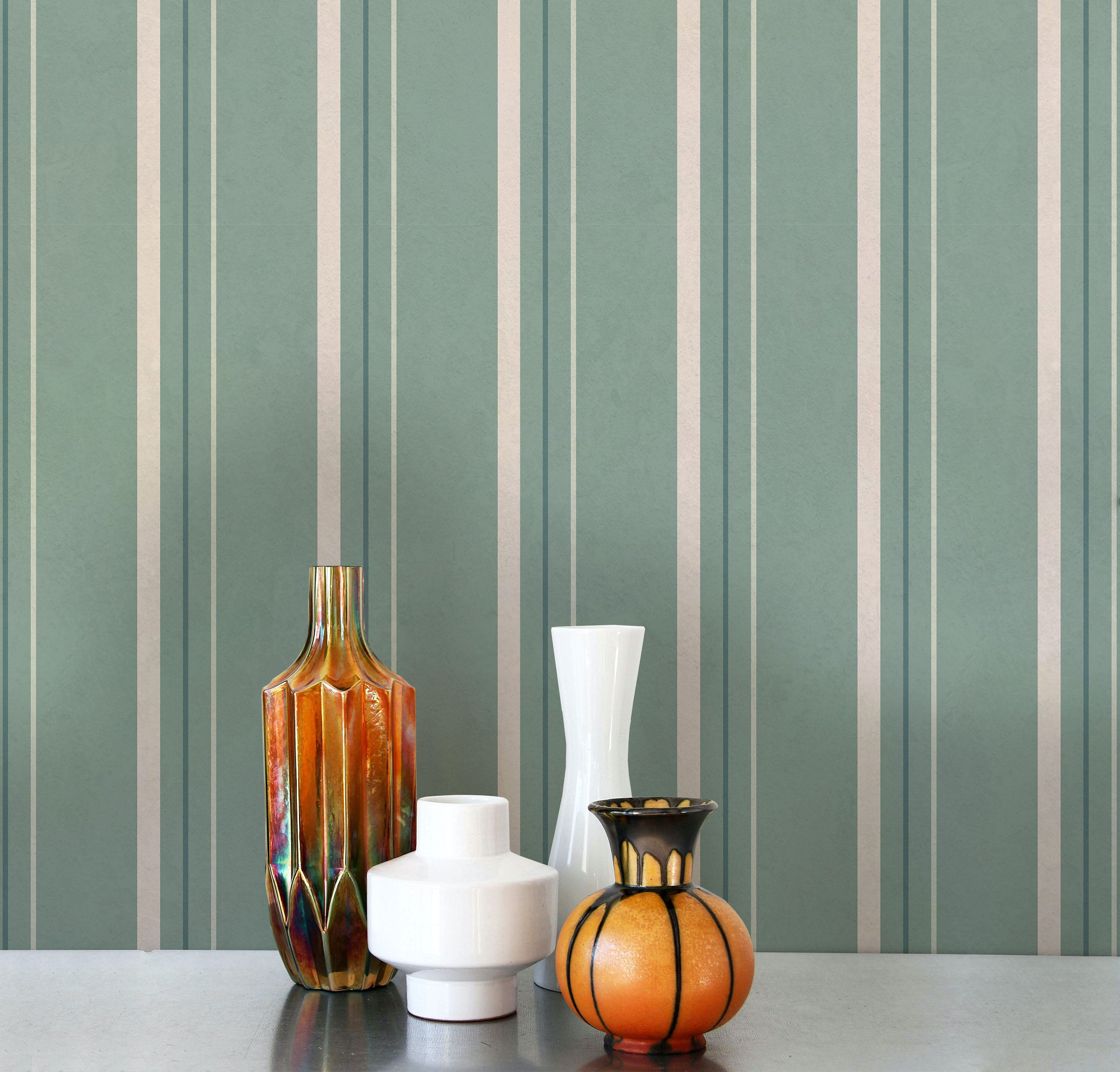 Vertical lines traverse a misty green field, introducing rhythm and depth to wall surfaces. The tonal striping adds visual structure while the muted teal base grounds spaces with calm, understated presence. Perfect for contemporary and transitional rooms.
