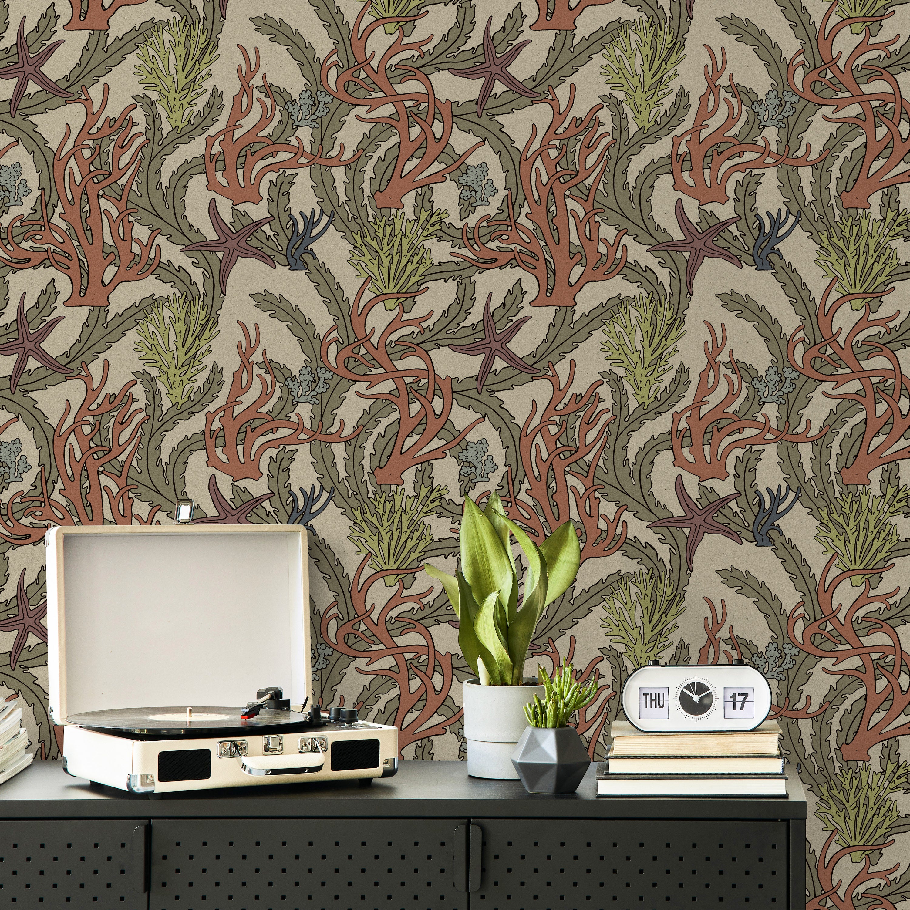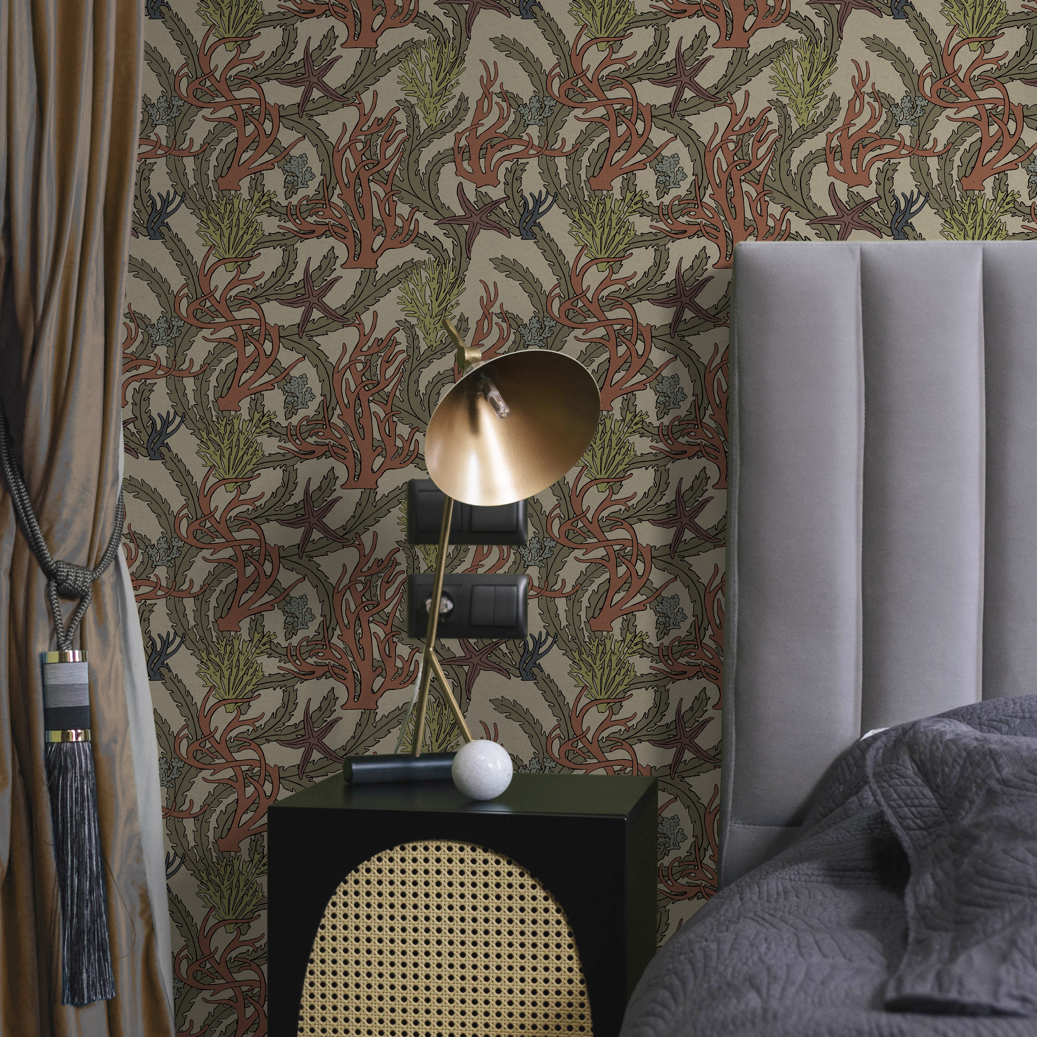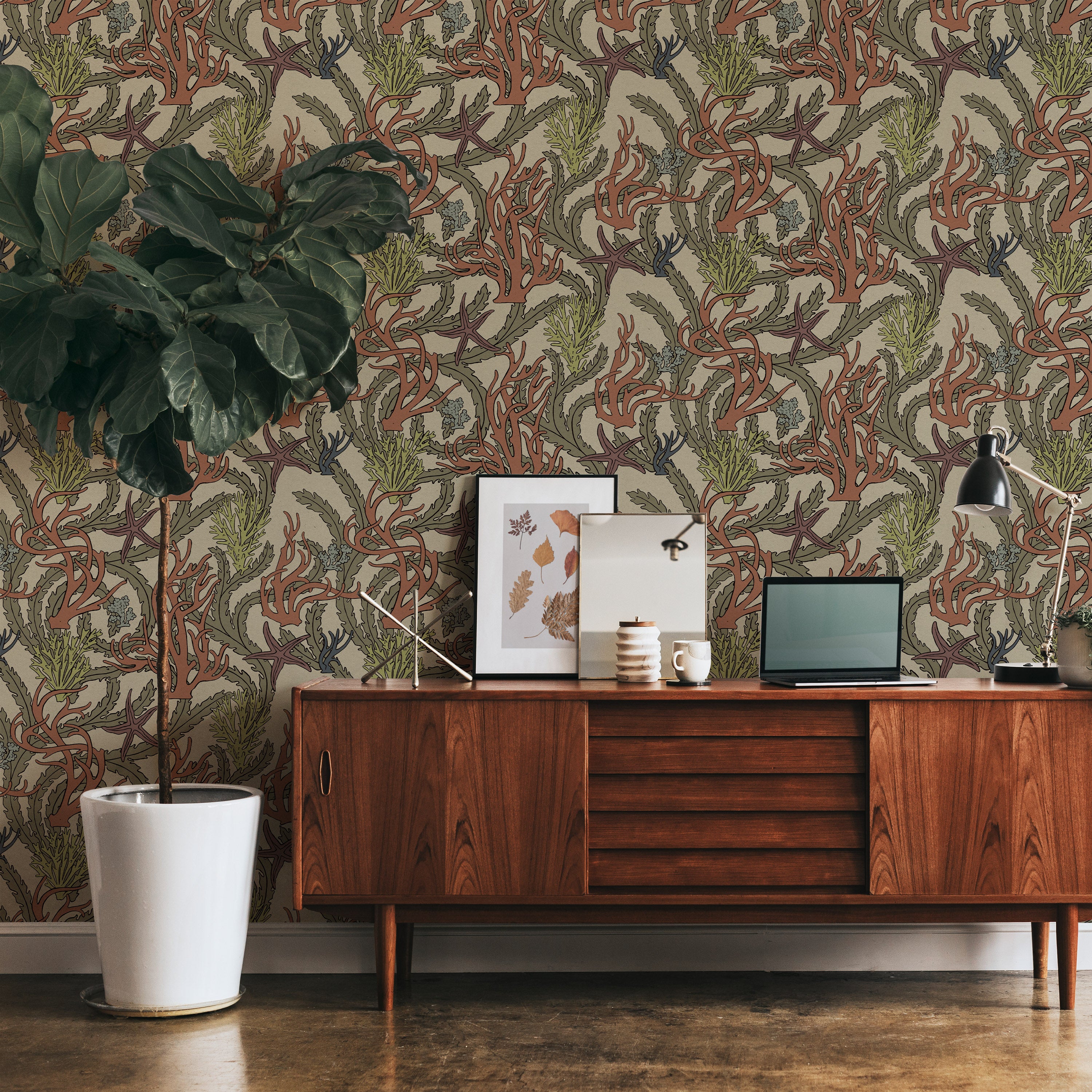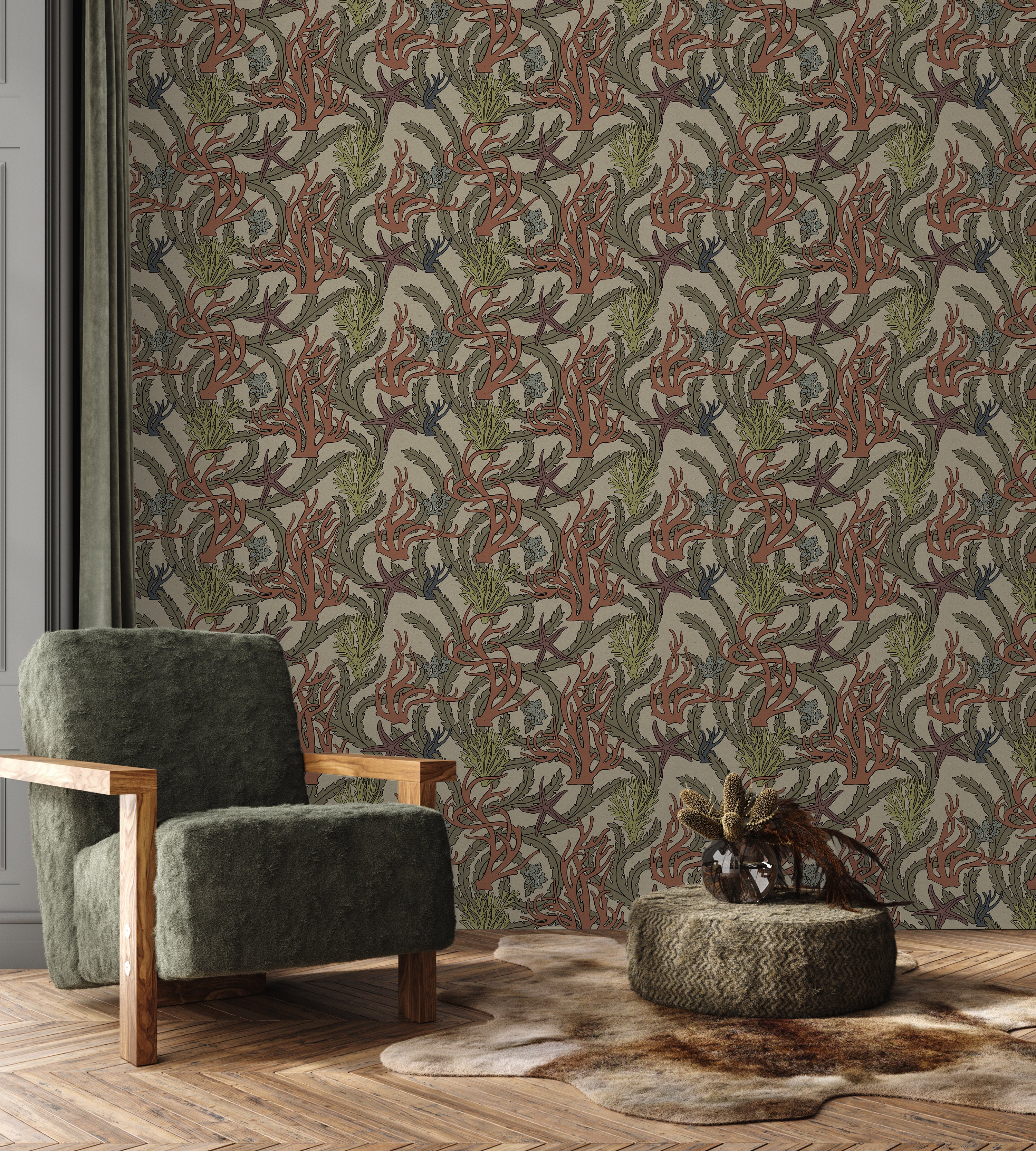 Seaweed and starfish forms unfold across warm driftwood beige, capturing coastal botanical character. The detailed marine composition brings narrative richness and organic movement to walls. Perfect for interiors seeking nature-inspired depth and visual storytelling.