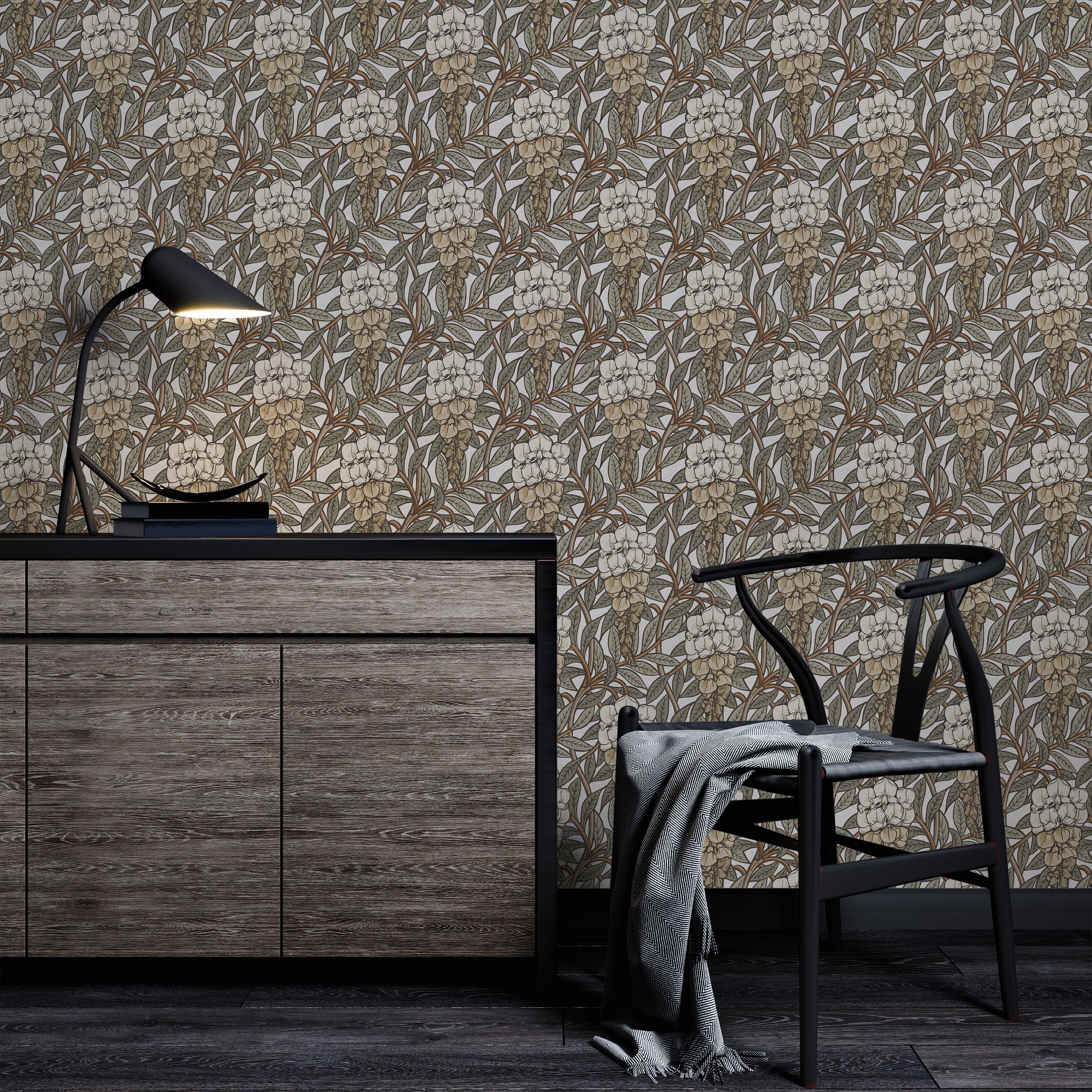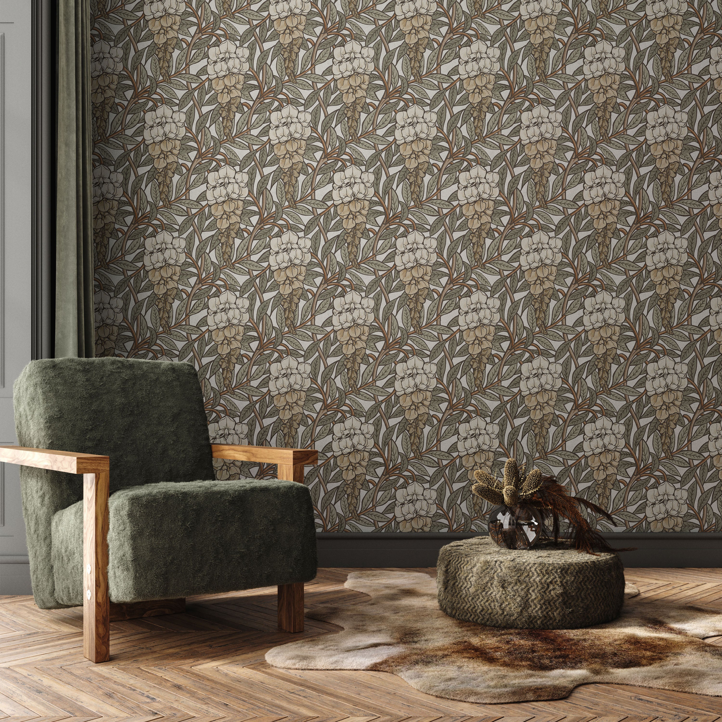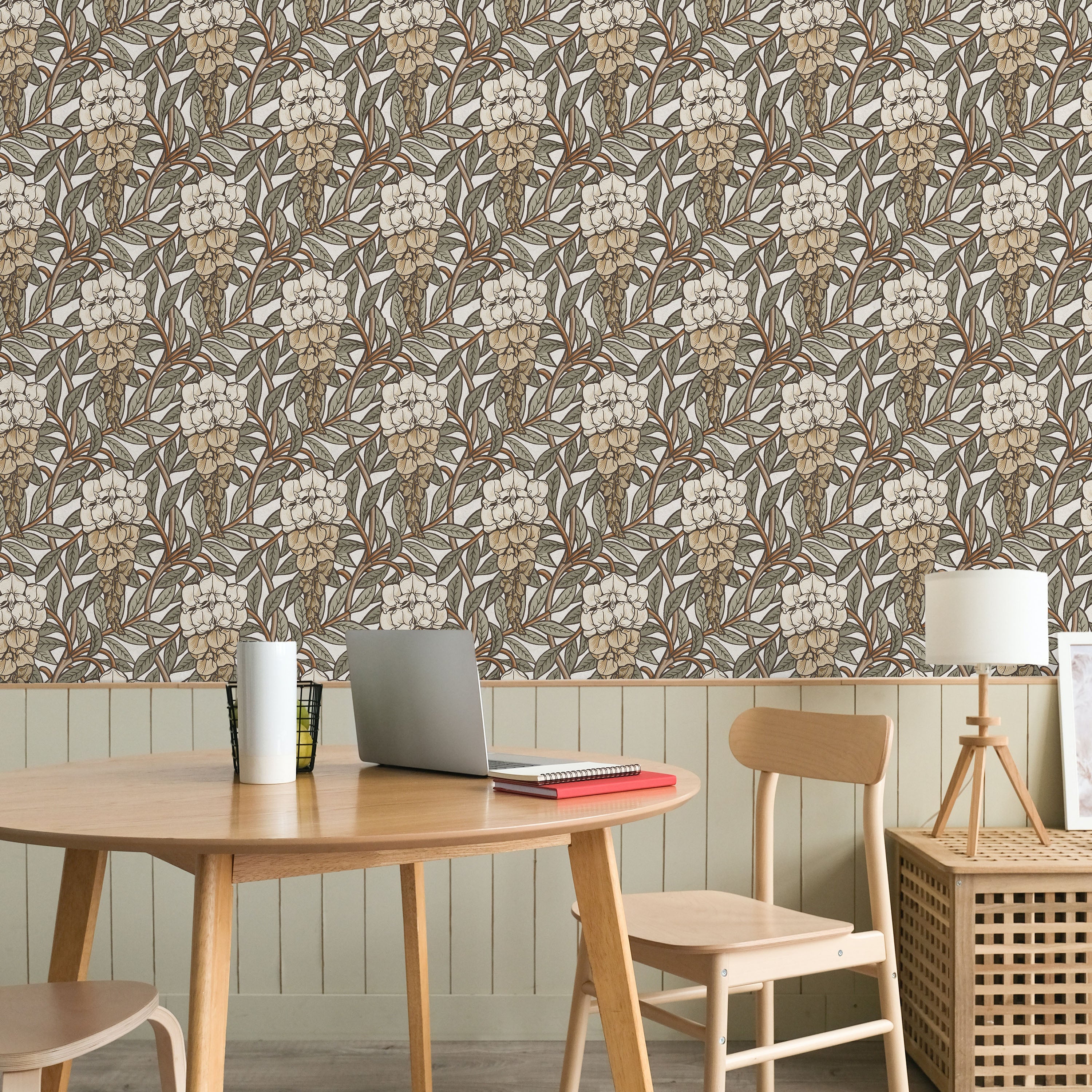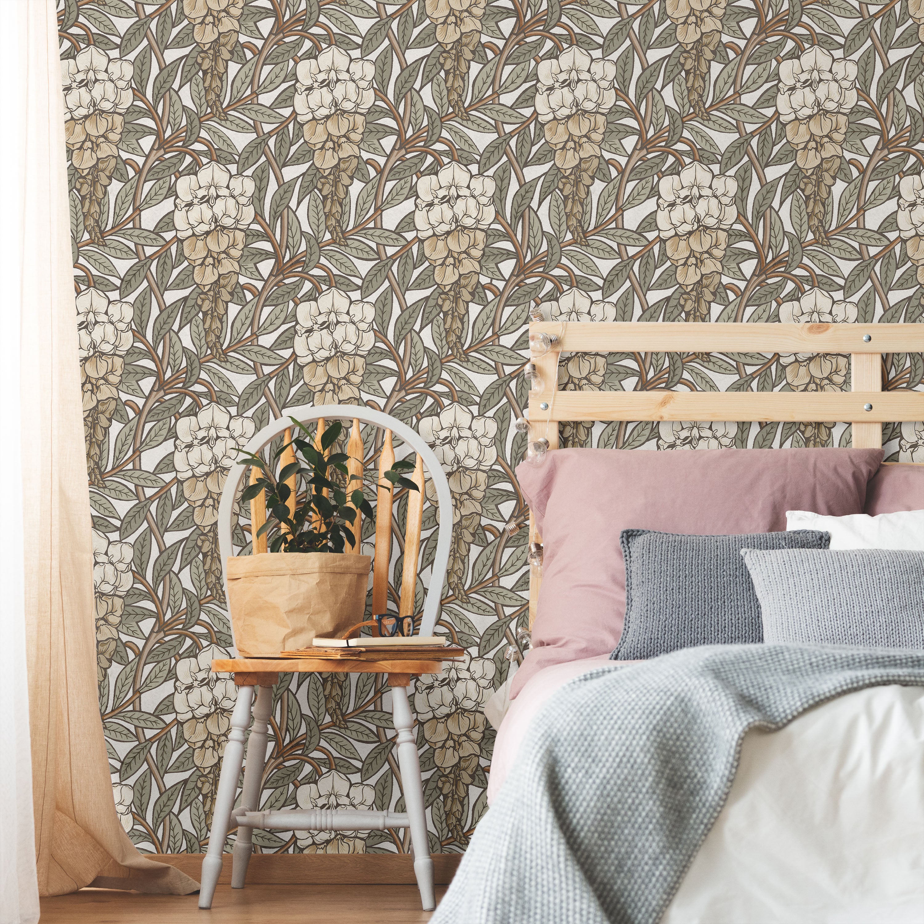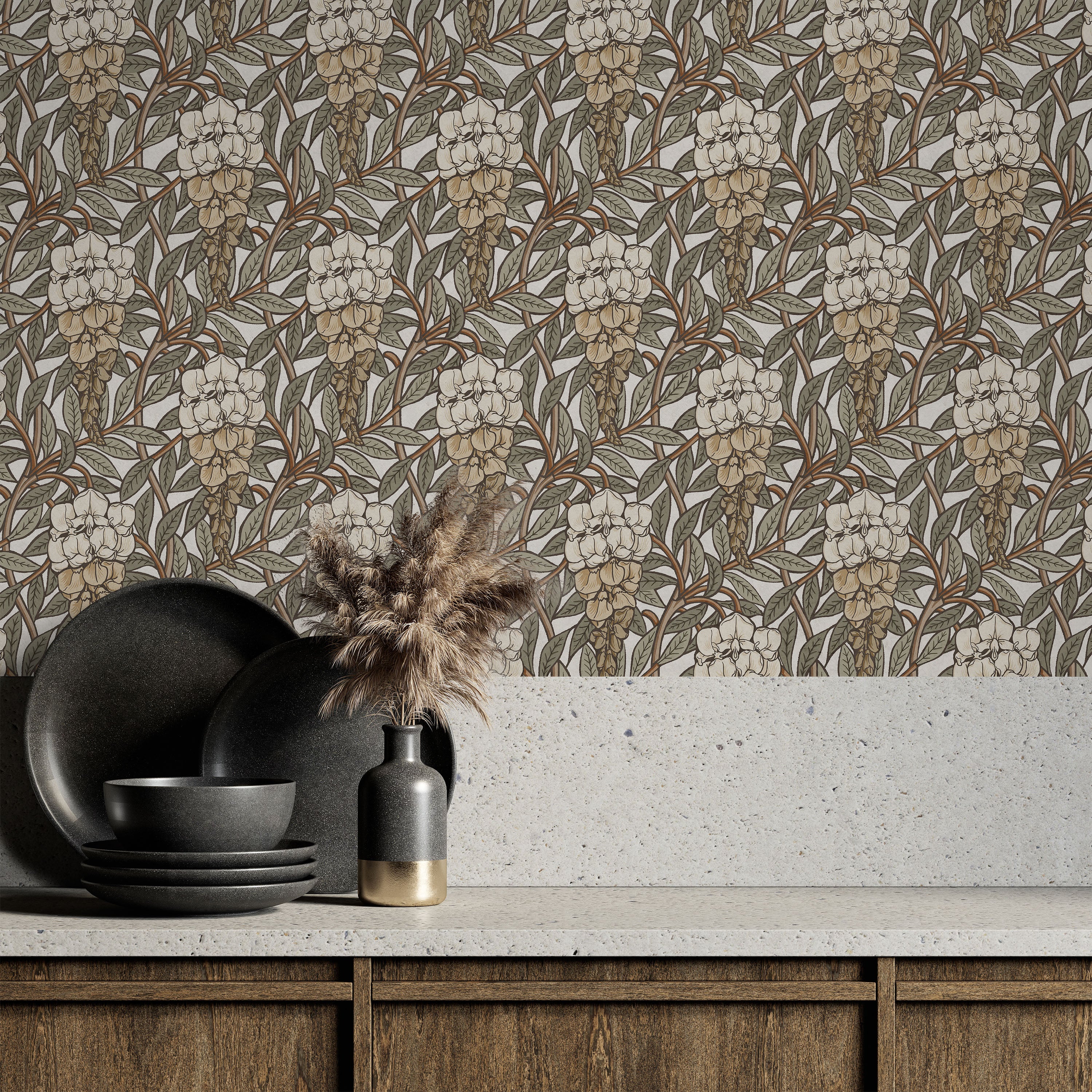 Delicate white-green florals with muted amber-green foliage on crisp white ground. Botanical pattern brings gentle movement and natural warmth without visual weight. Works across residential interiors as a calming backdrop or layered accent in transitional and contemporary spaces.
