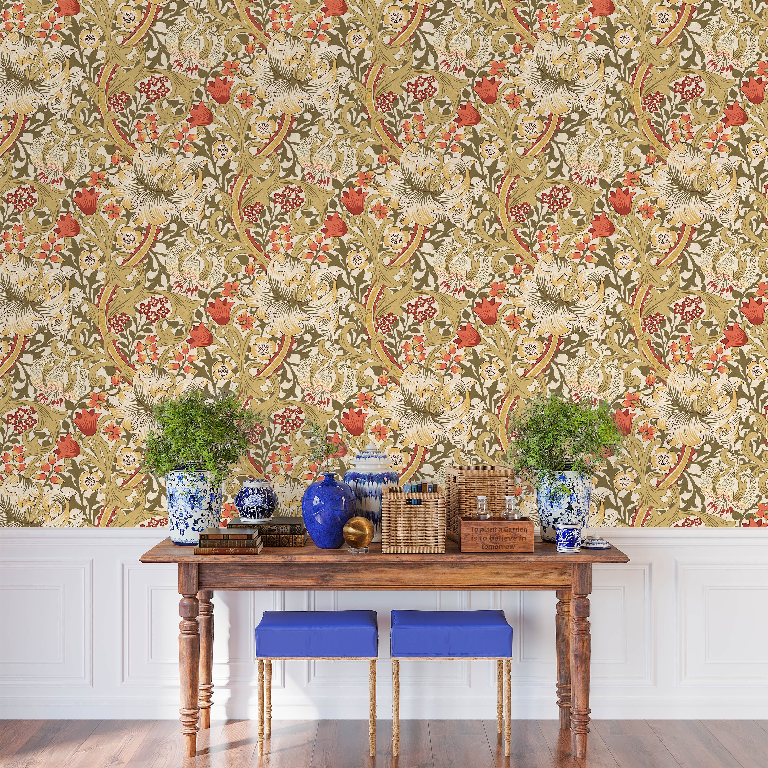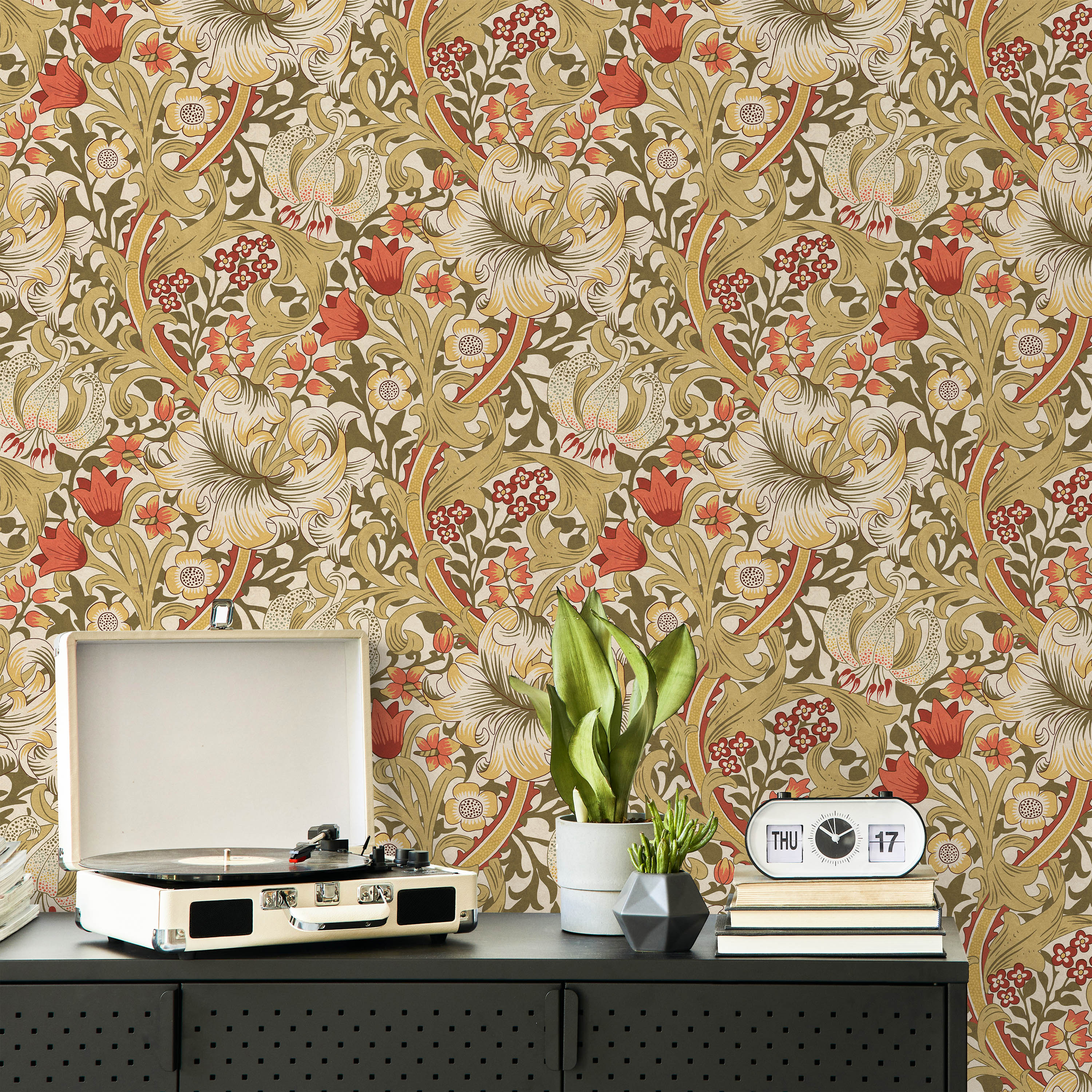 Inspired by William Morris design principles, this wallpaper features an elegant floral pattern in rich red, gold, and beige tones set against a textured backdrop. Perfect for creating sophisticated, timeless interiors with classic botanical charm.