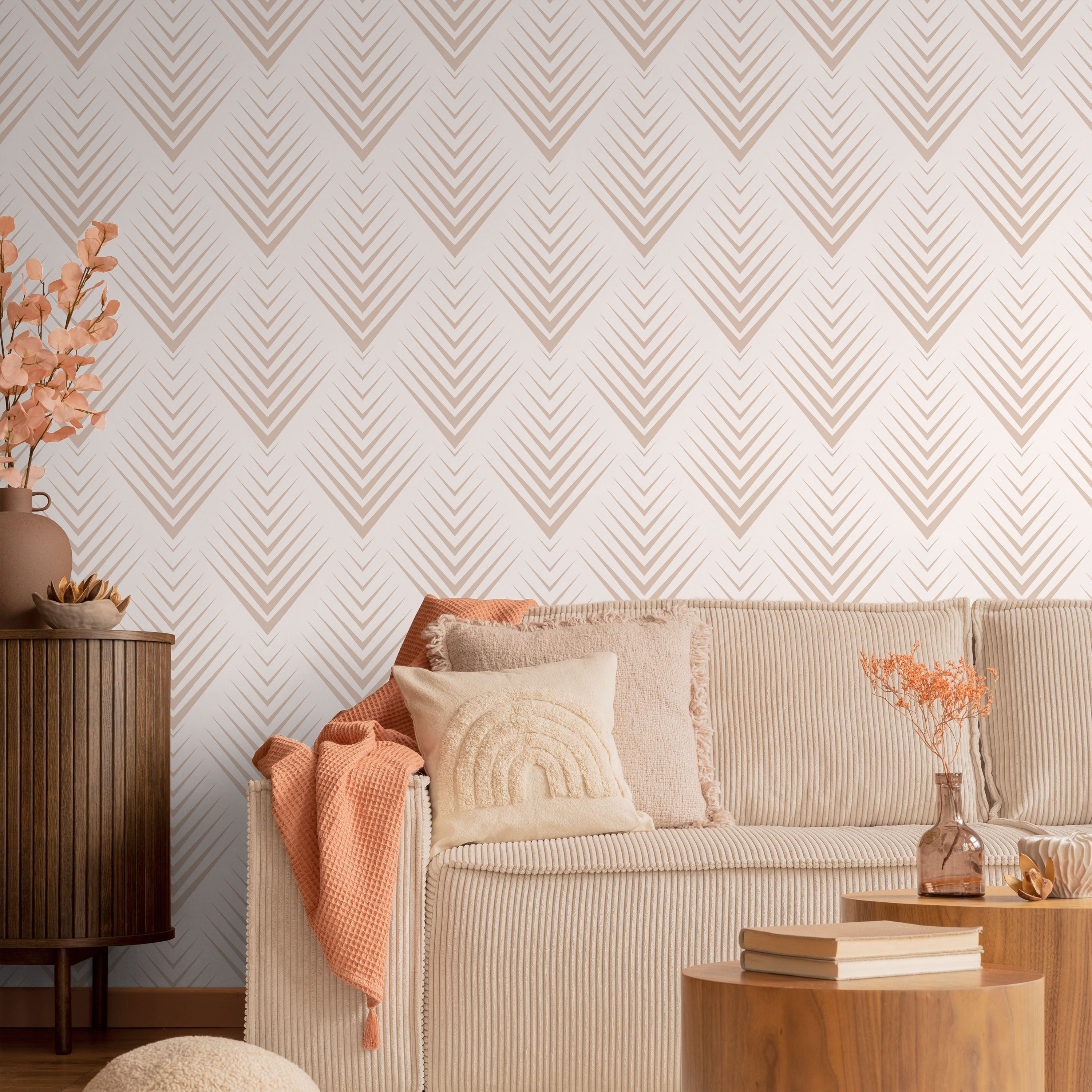 Timeless beige chevrons create dynamic movement across a pristine white surface. This geometric wallpaper delivers architectural sophistication with minimal aesthetic, ideal for discerning spaces that prioritize refined simplicity and contemporary design sensibility.