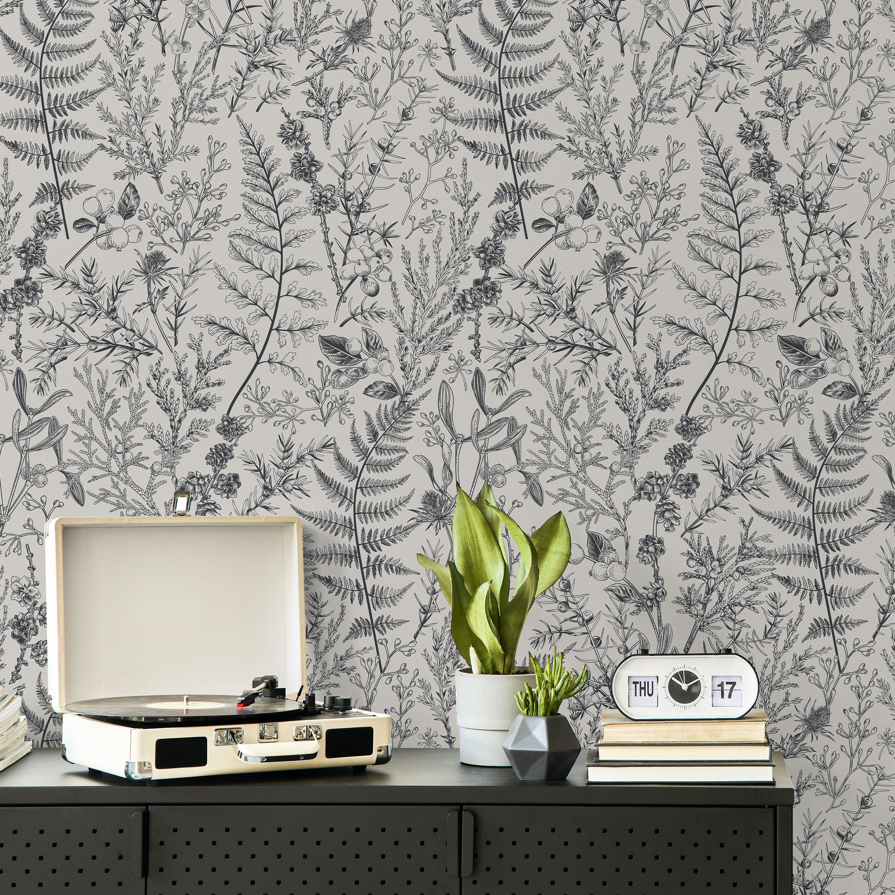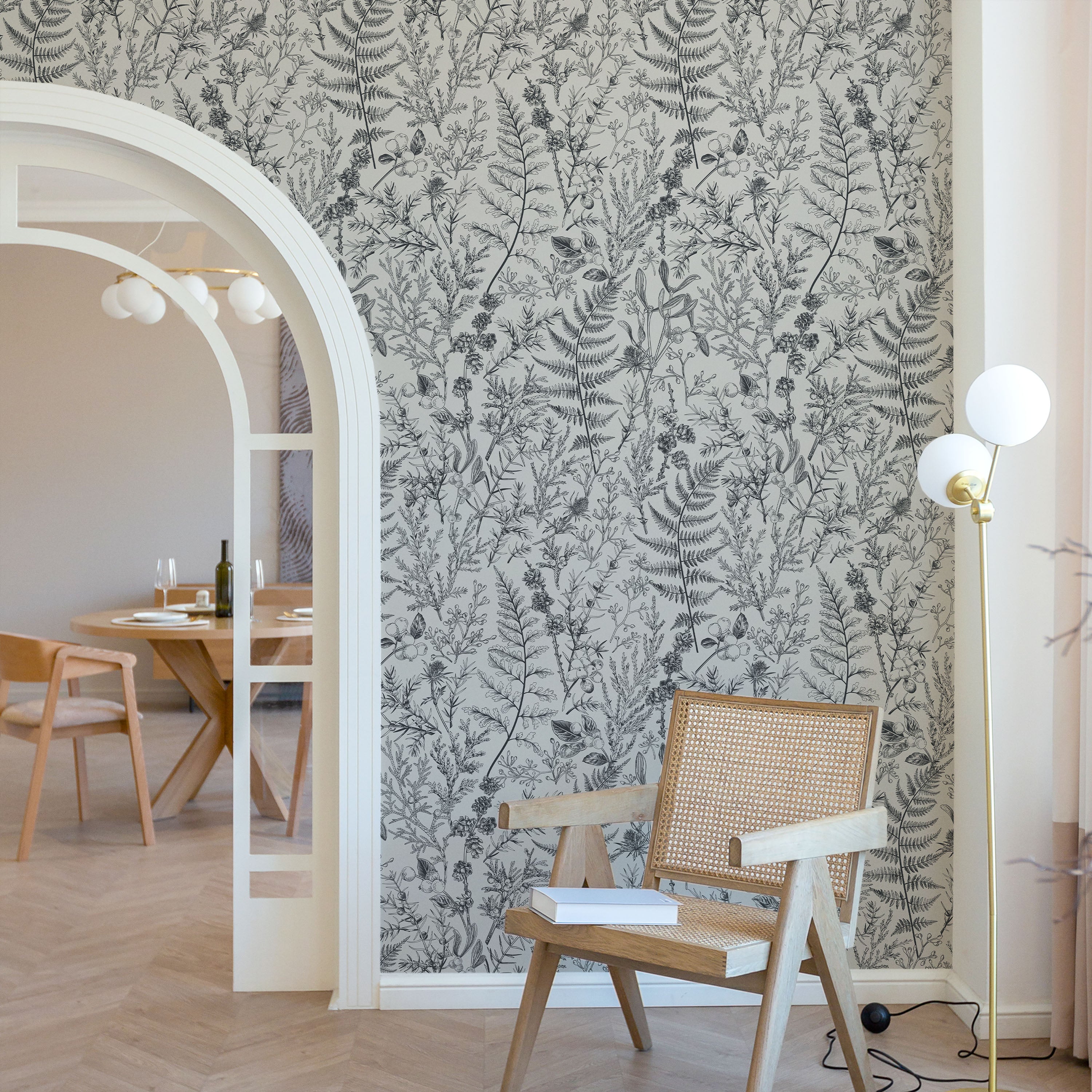 Refined wallcovering presenting intricate black botanical line work against a muted powder gray field. The naturalistic pattern delivers timeless elegance, ideal for creating sophisticated, botanically-inspired interiors with contemporary restraint.