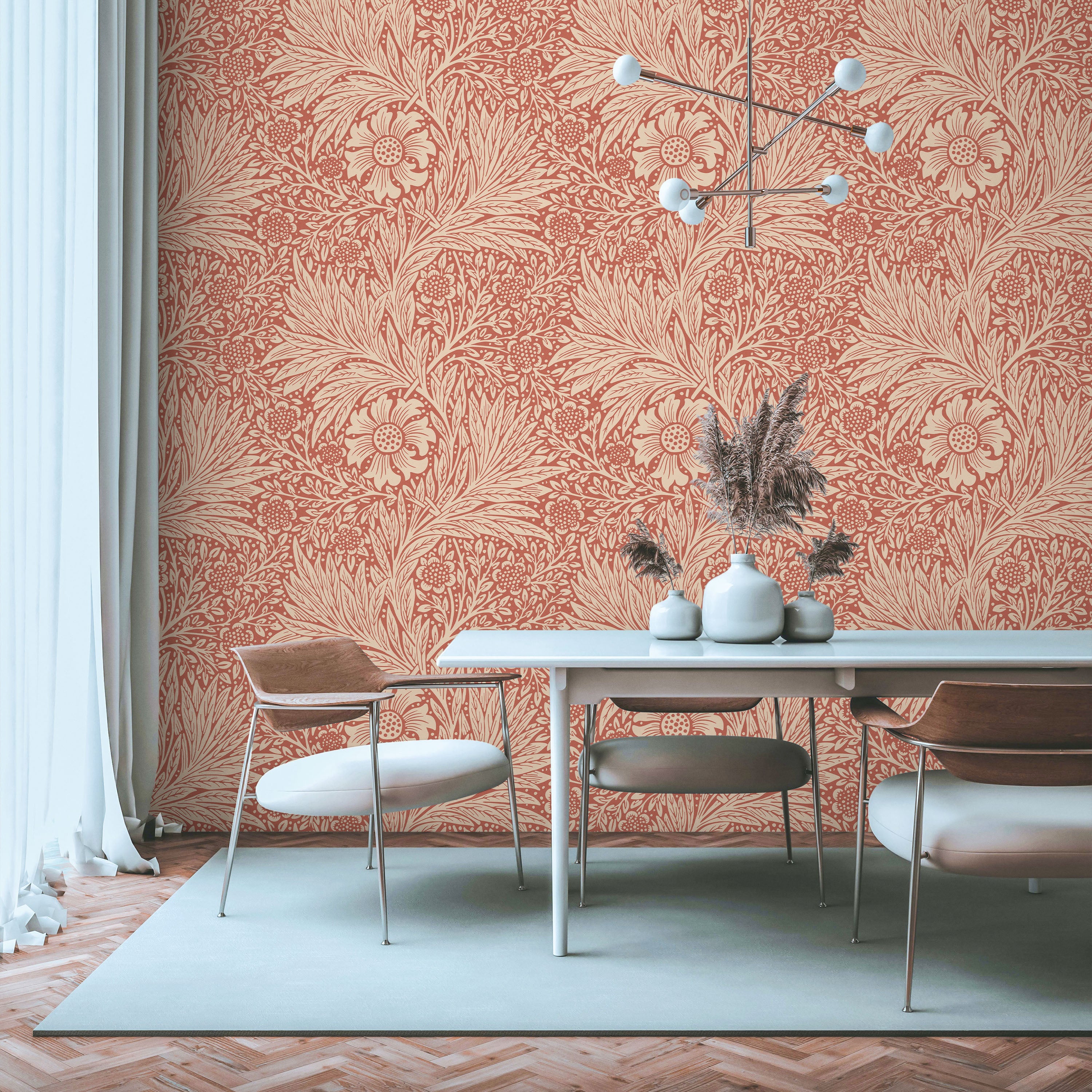Timeless William Morris design featuring intricate marigold florals and foliage in soft beige tones against a rich red ground. This classic pattern brings sophisticated botanical elegance to any interior space.