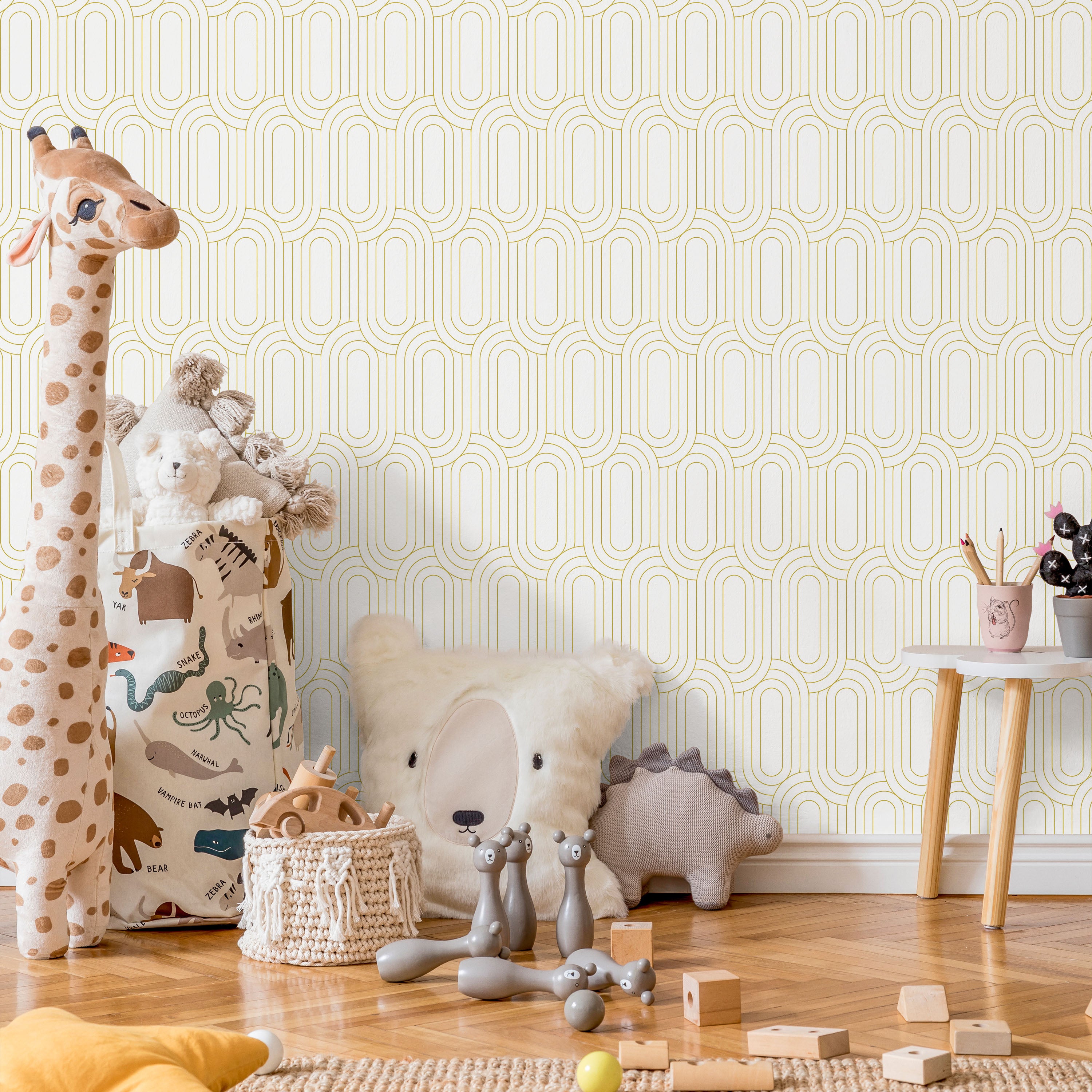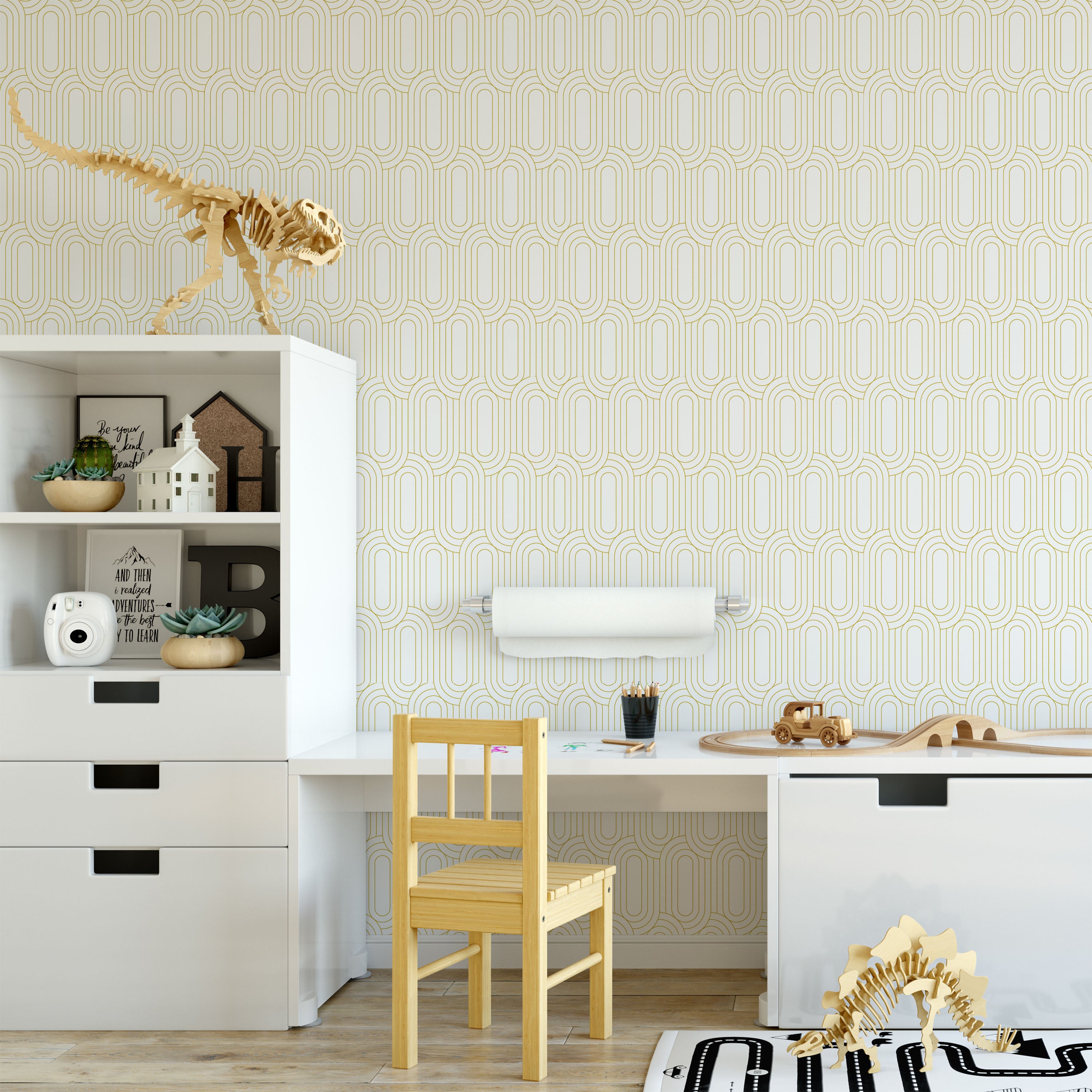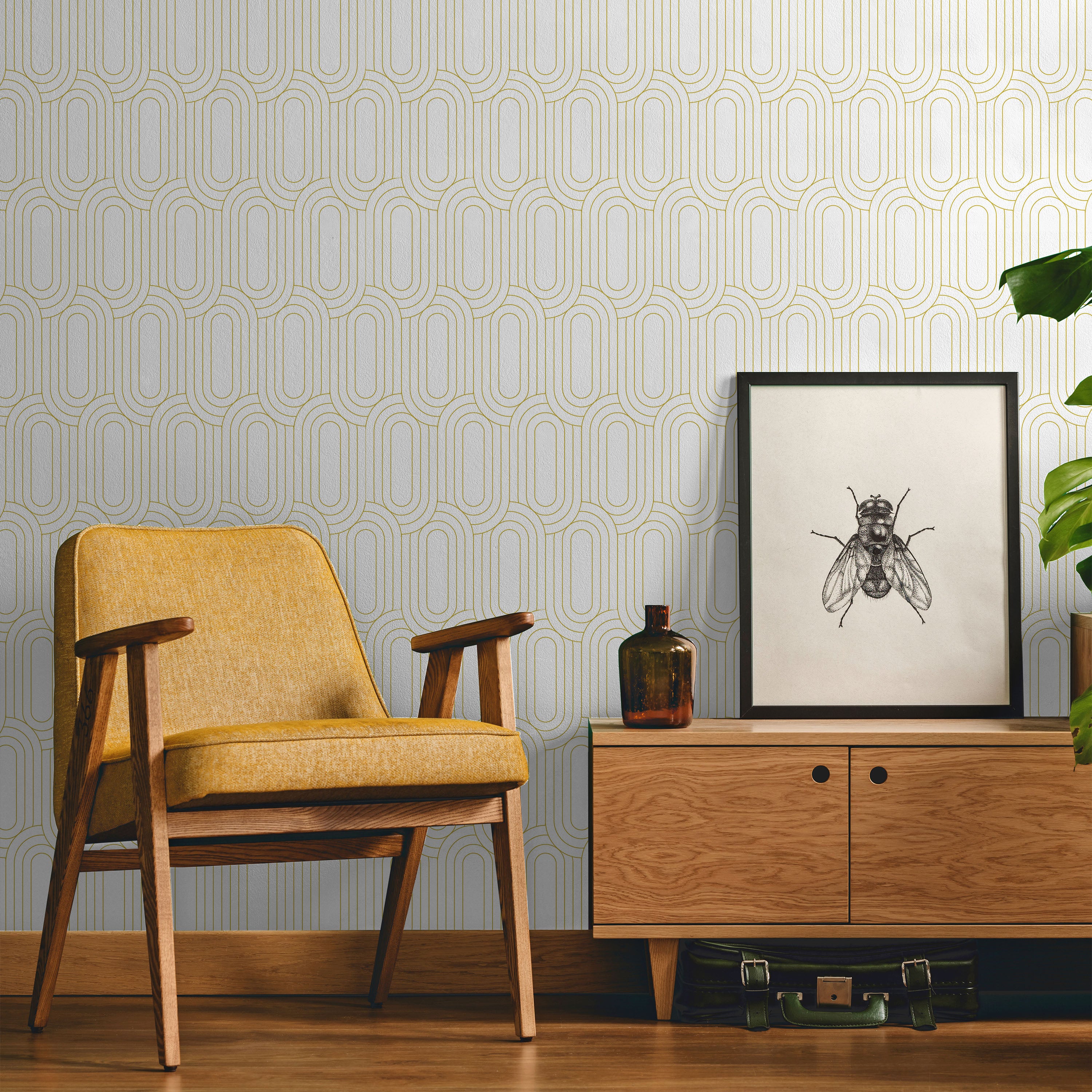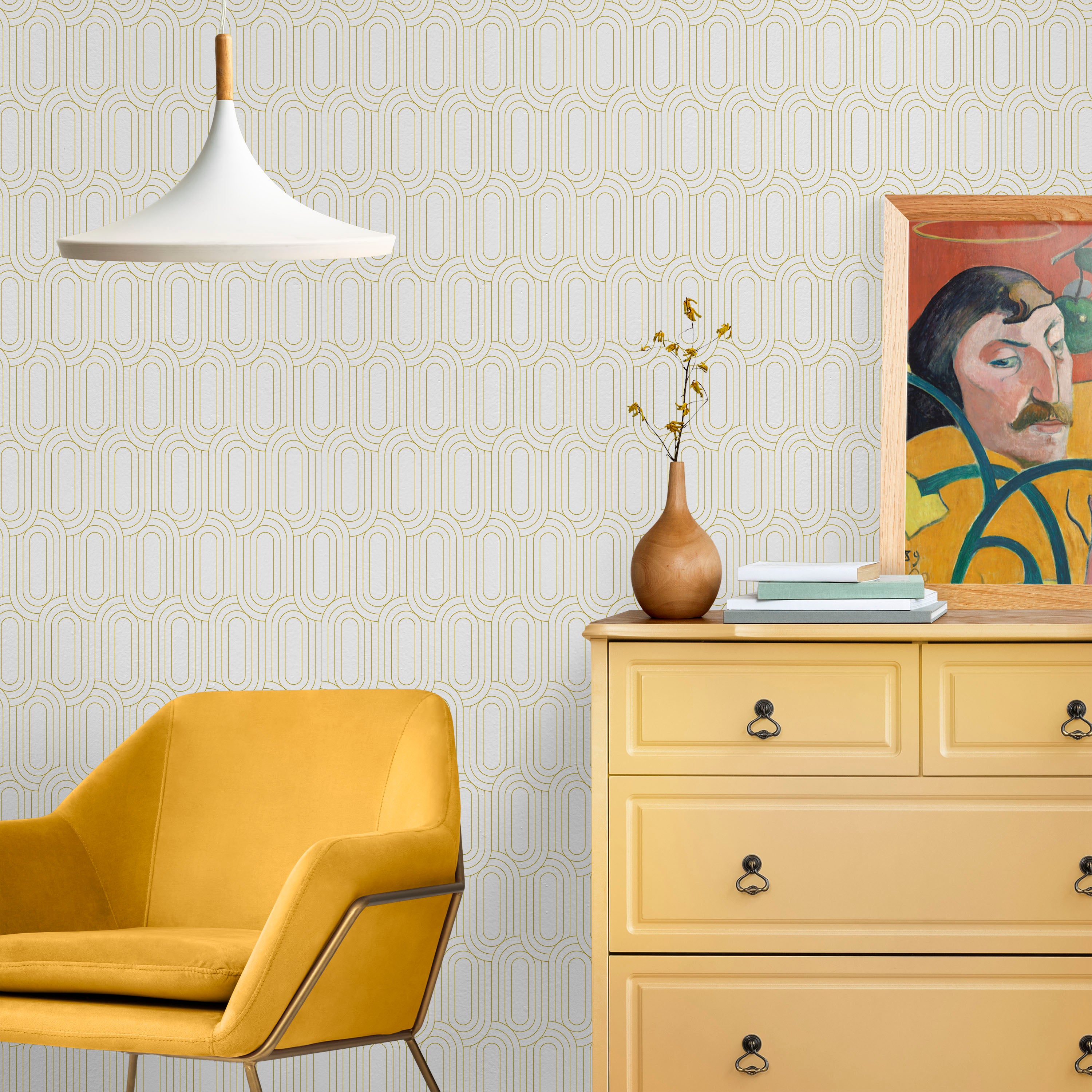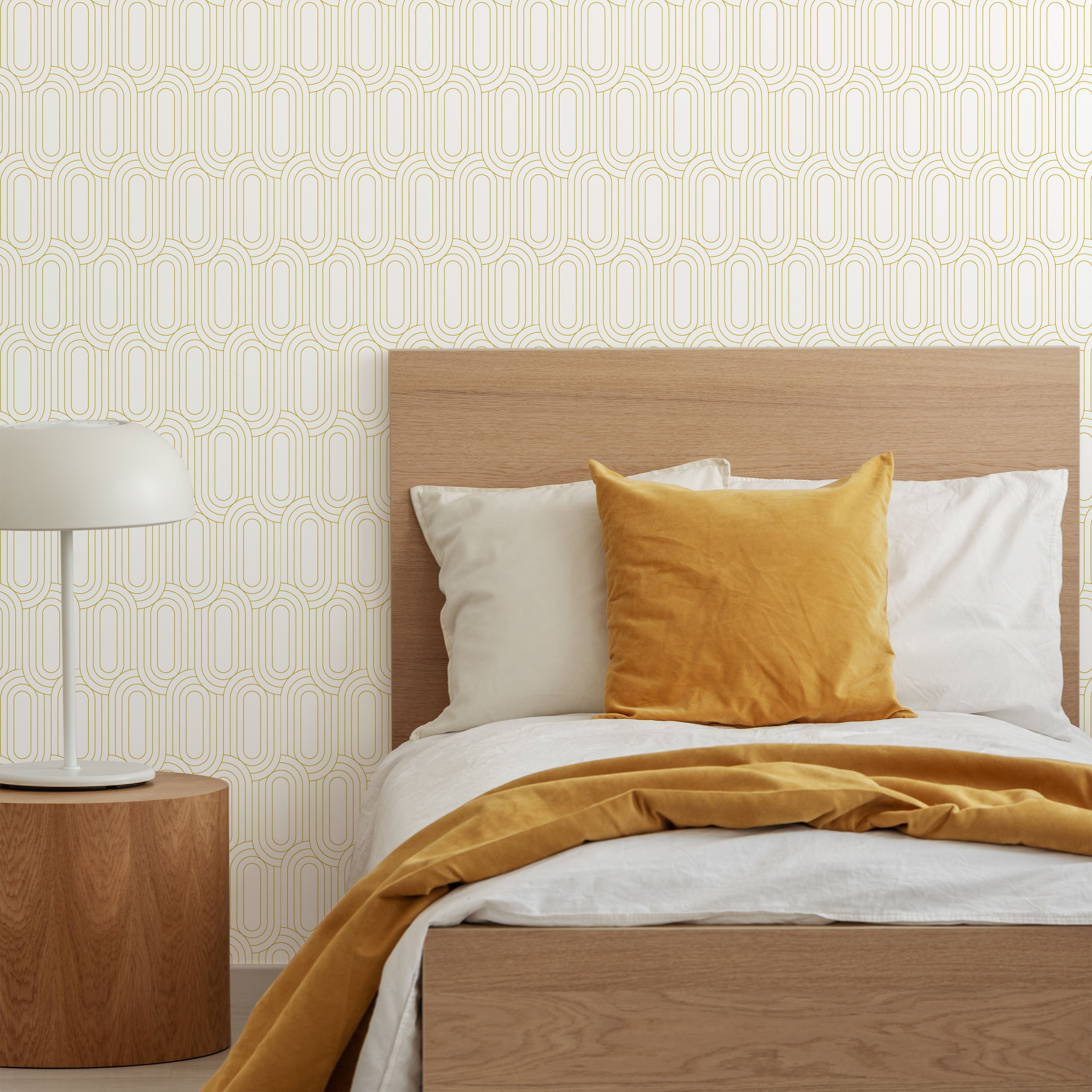 Royal Facade Wallpaper features interlocking geometric arcs in warm yellow against crisp white, creating dynamic visual rhythm. This contemporary pattern adds sophisticated depth to any room while maintaining clean, modern aesthetics. Perfect for accent walls or complete transformations.