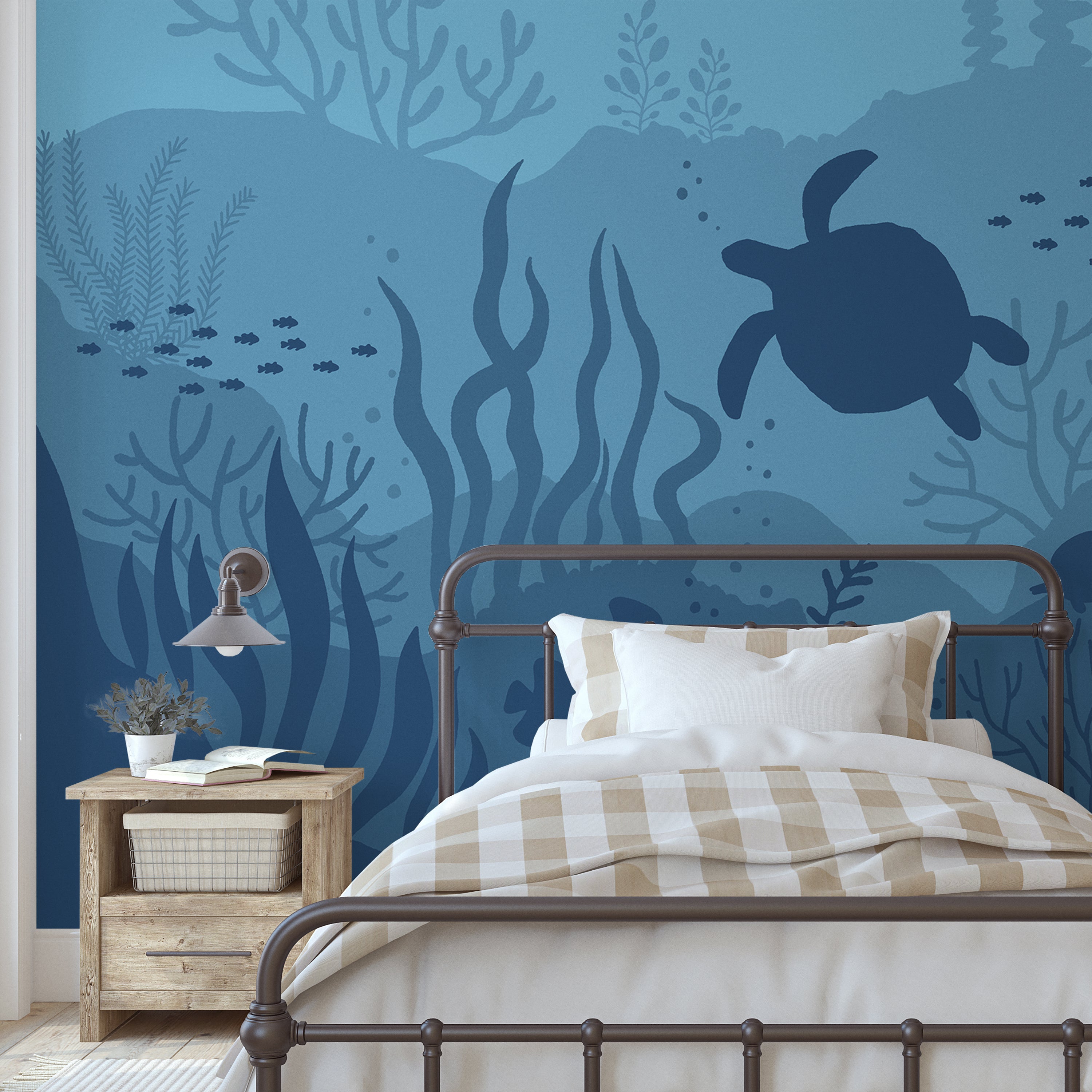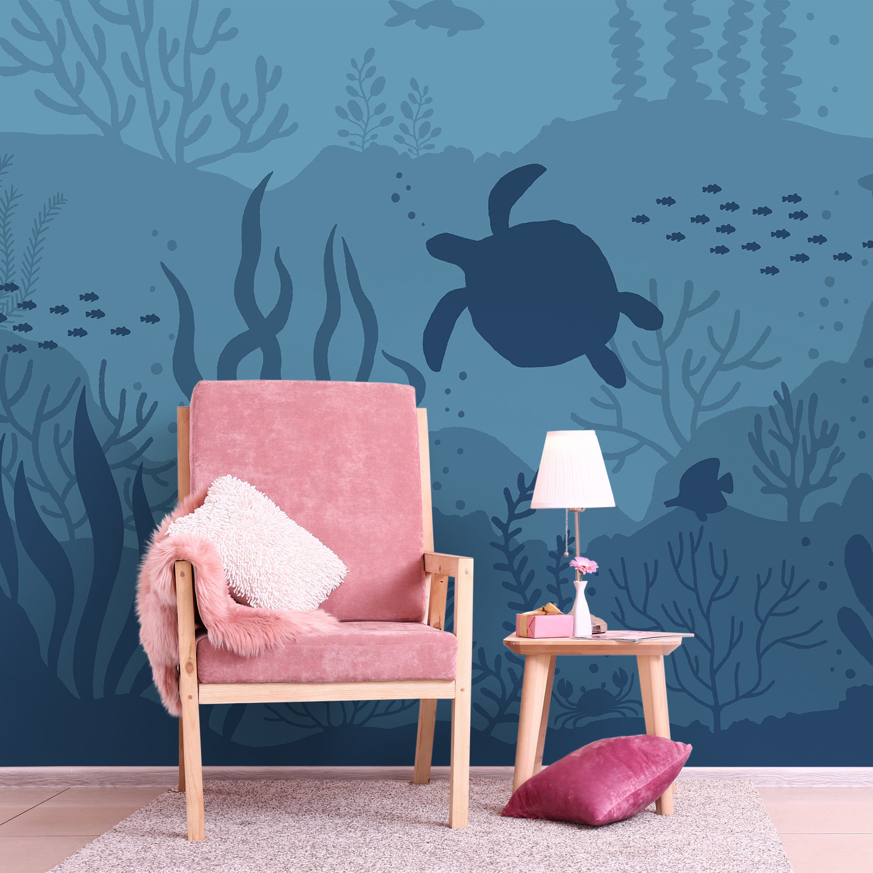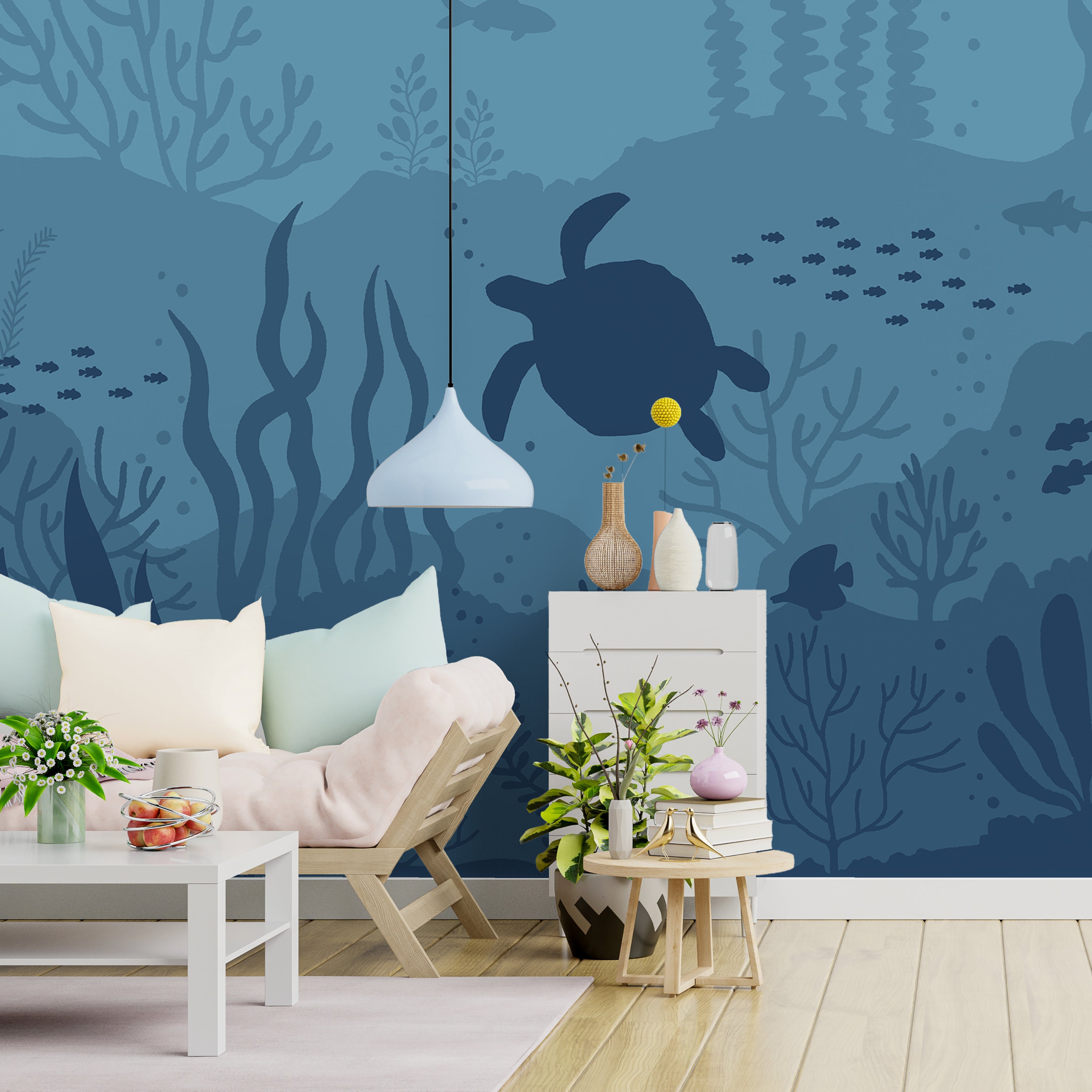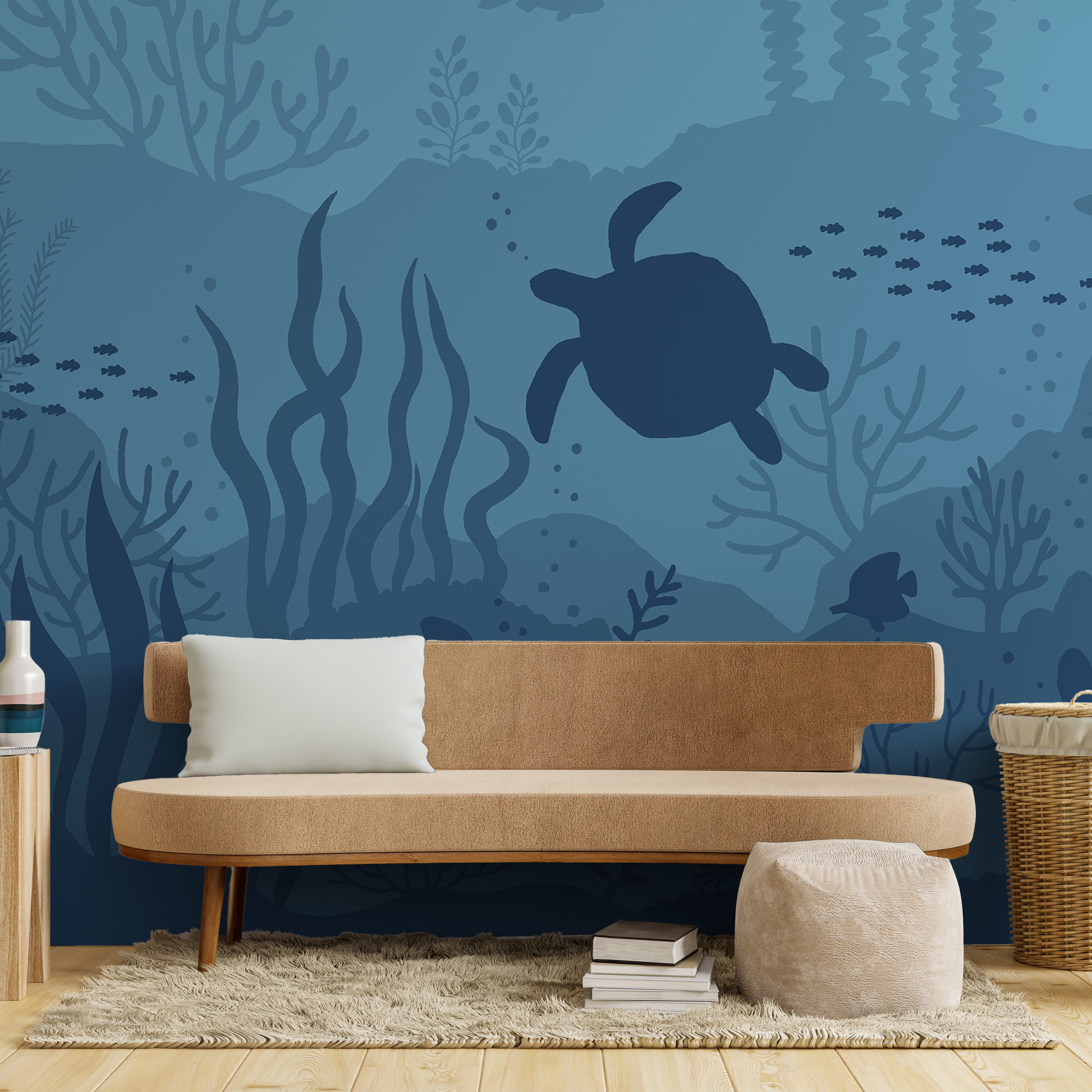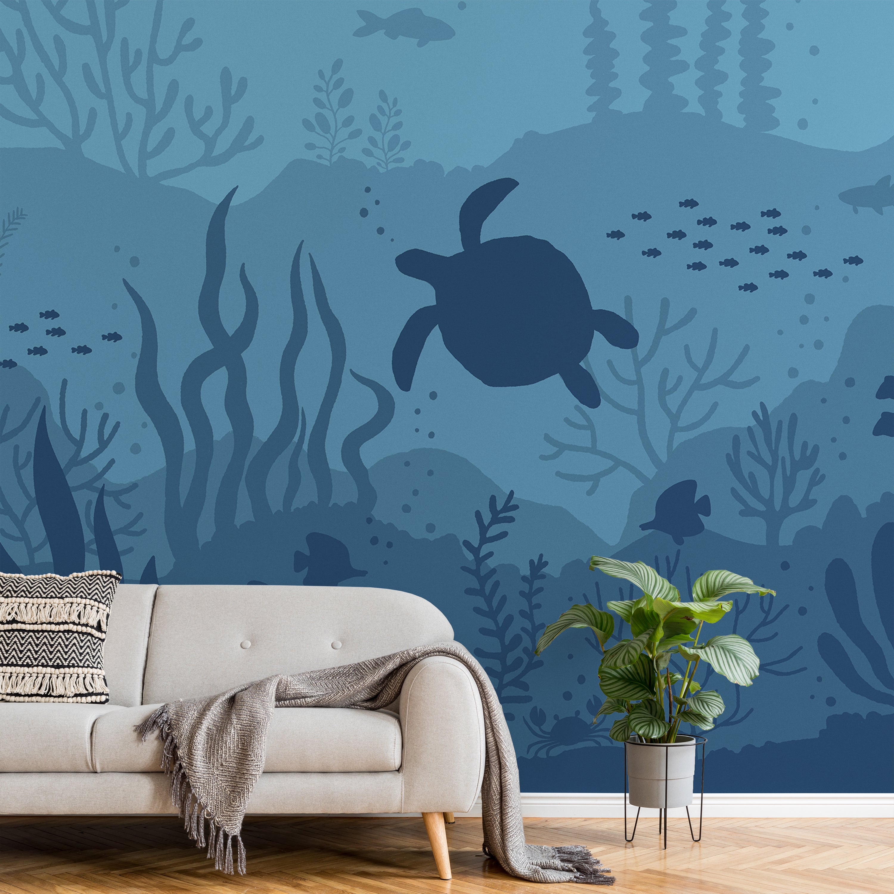 Transform your space into a serene underwater sanctuary with this captivating mural wallpaper. Featuring a graceful turtle gliding through vibrant blue coral and aquatic plants, accompanied by colorful fish, this design brings the tranquility of the ocean depths to your walls. Perfect for creating a calming, immersive atmosphere.