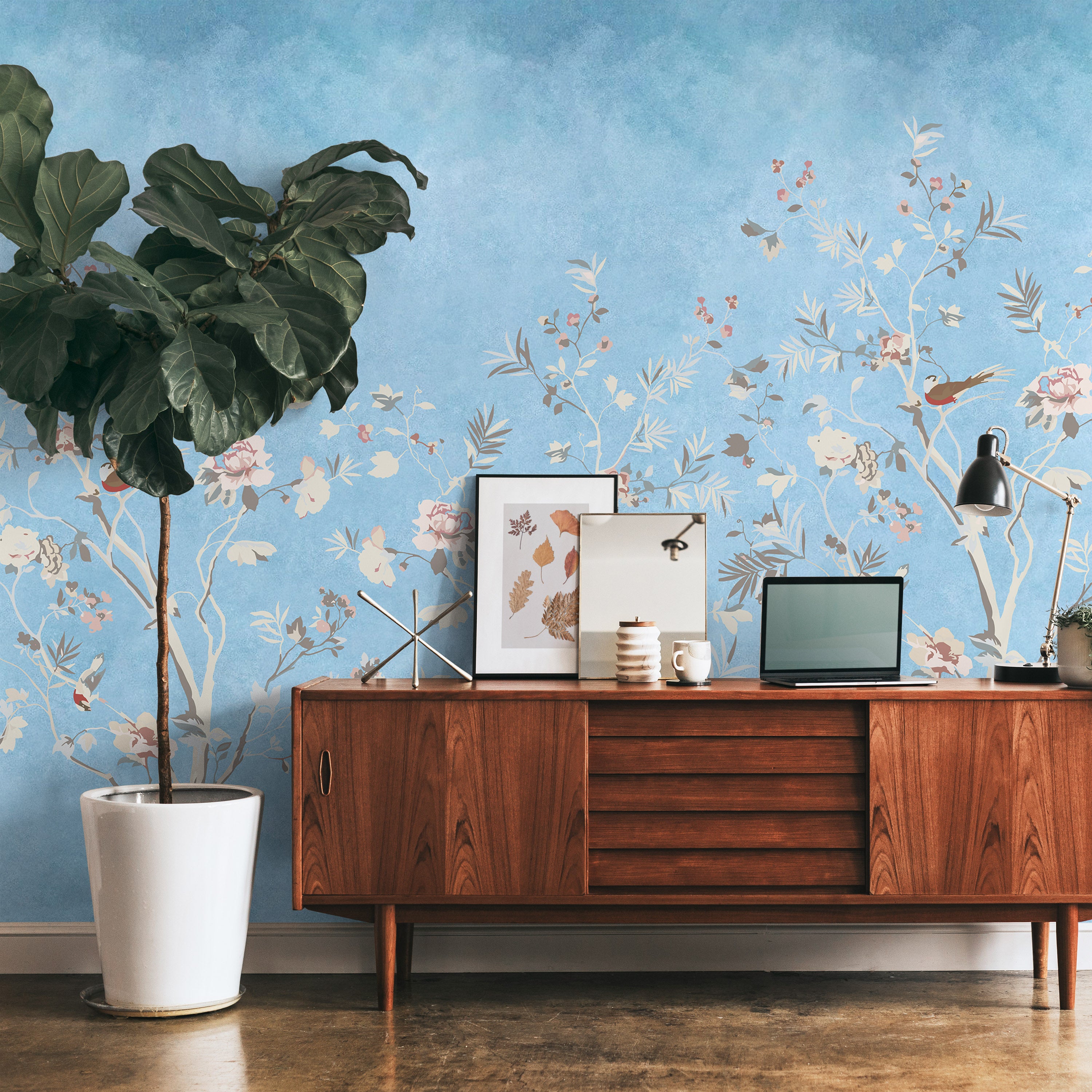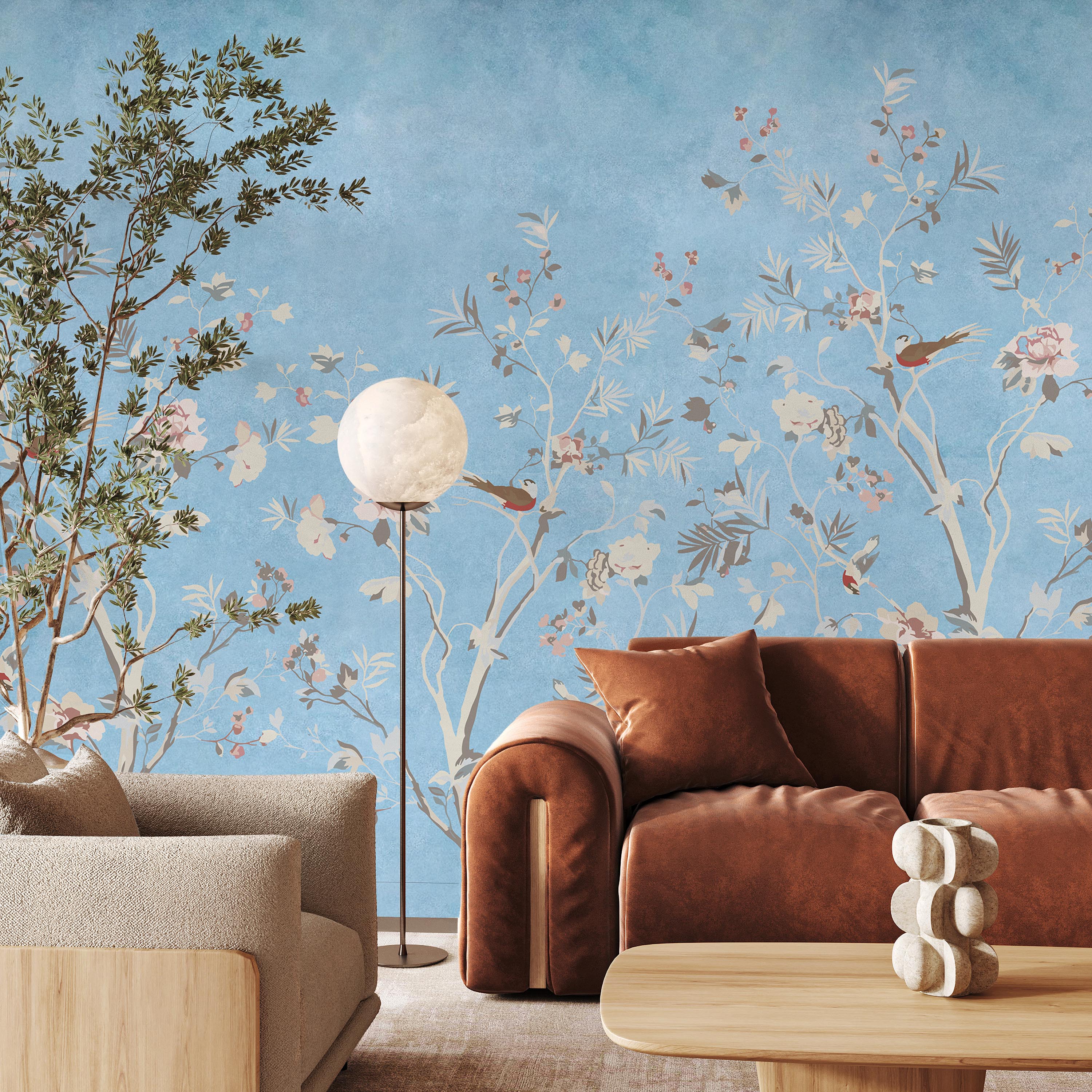 Spring Whisper Mural Wallpaper transforms any room with its sophisticated floral and bird motif set against a serene blue backdrop. This expertly designed mural combines botanical elegance with wildlife charm, creating a tranquil focal point that elevates interior spaces with refined artistry and timeless appeal.
