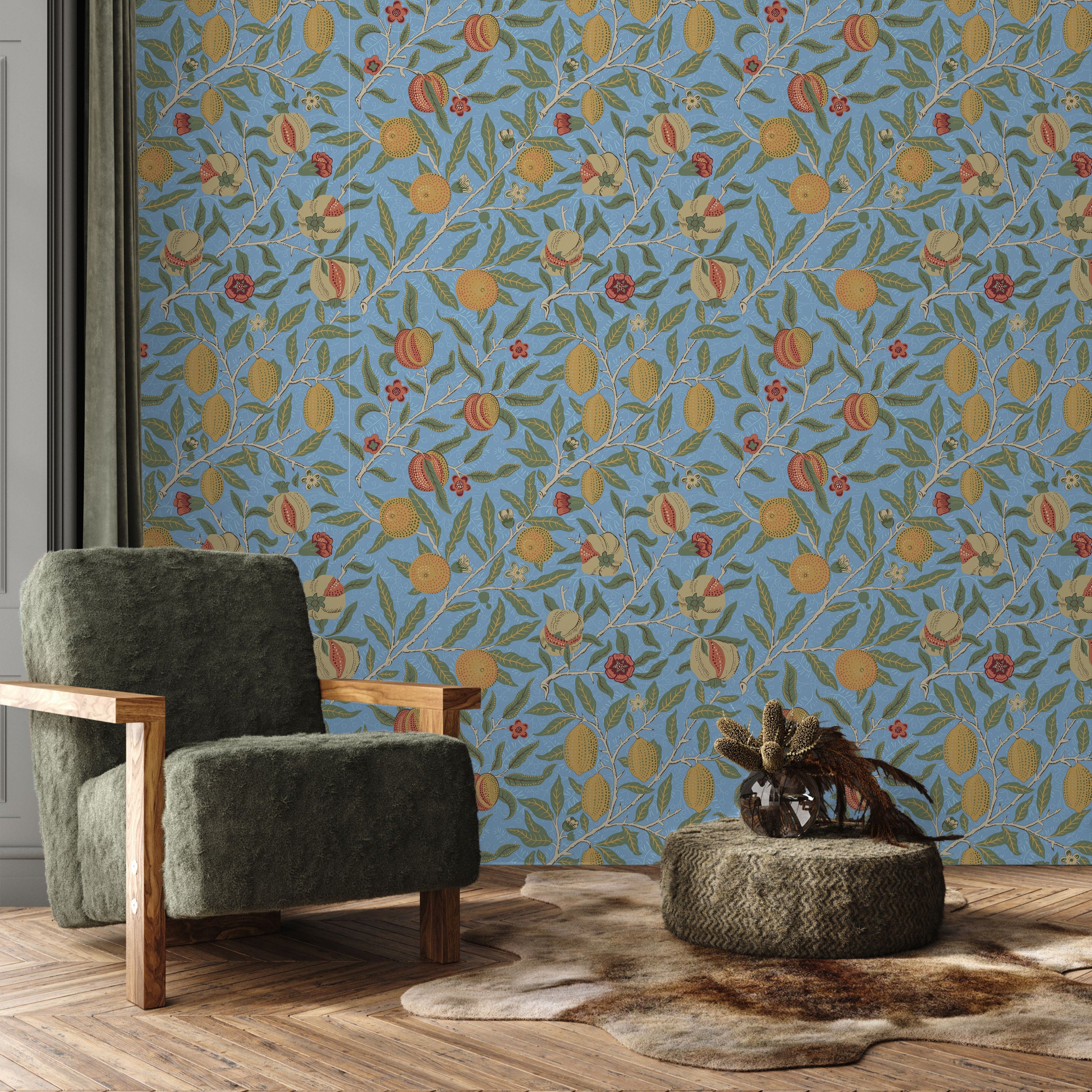 William Morris X Citrus Groove Wallpaper features an elegant botanical design with vibrant fruits and foliage set against a serene light blue backdrop. This timeless pattern combines classic Arts and Crafts aesthetics with contemporary appeal, perfect for creating sophisticated interiors with natural charm.