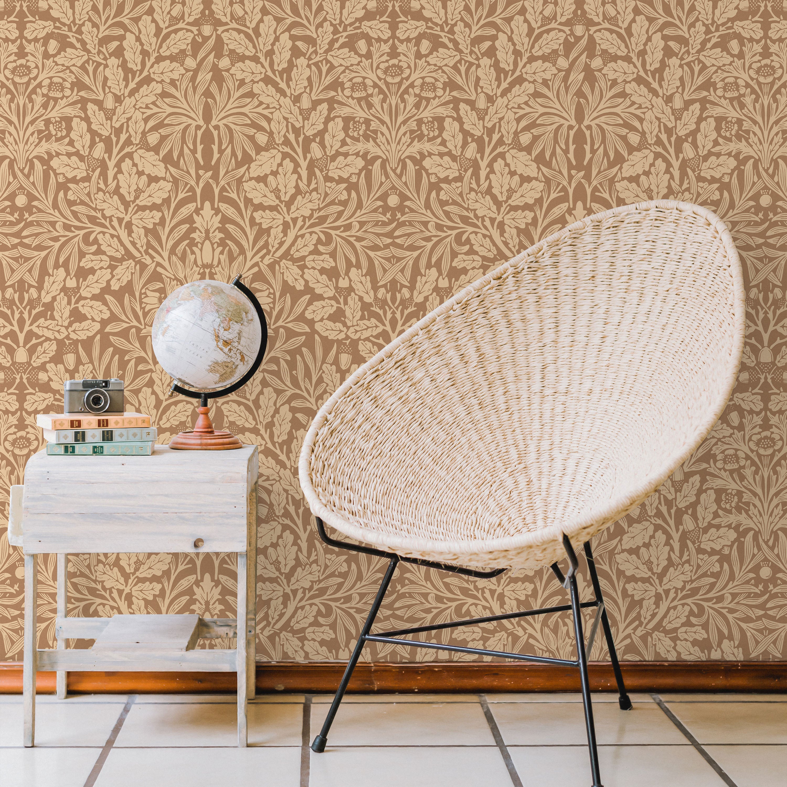 Inspired by William Morris design principles, this wallpaper features an intricate arrangement of leaves and acorns rendered in warm, earthy tones against a rich brown backdrop. Perfect for creating sophisticated, nature-inspired interiors with timeless appeal.