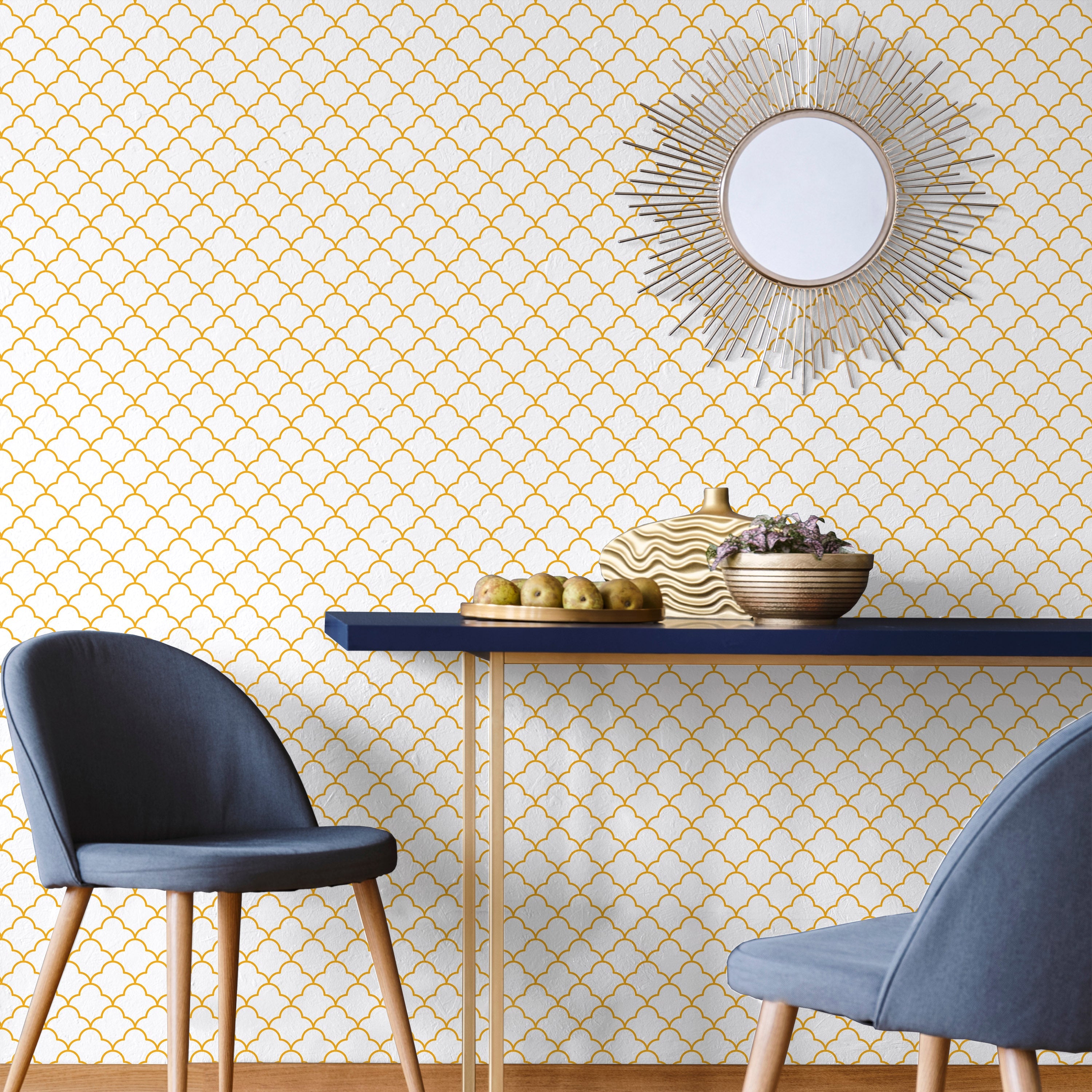 Elevate your interiors with this refined wallpaper showcasing a luminous yellow fish scale motif on pristine white. The geometric pattern delivers architectural sophistication while maintaining versatile design compatibility across contemporary and transitional spaces.