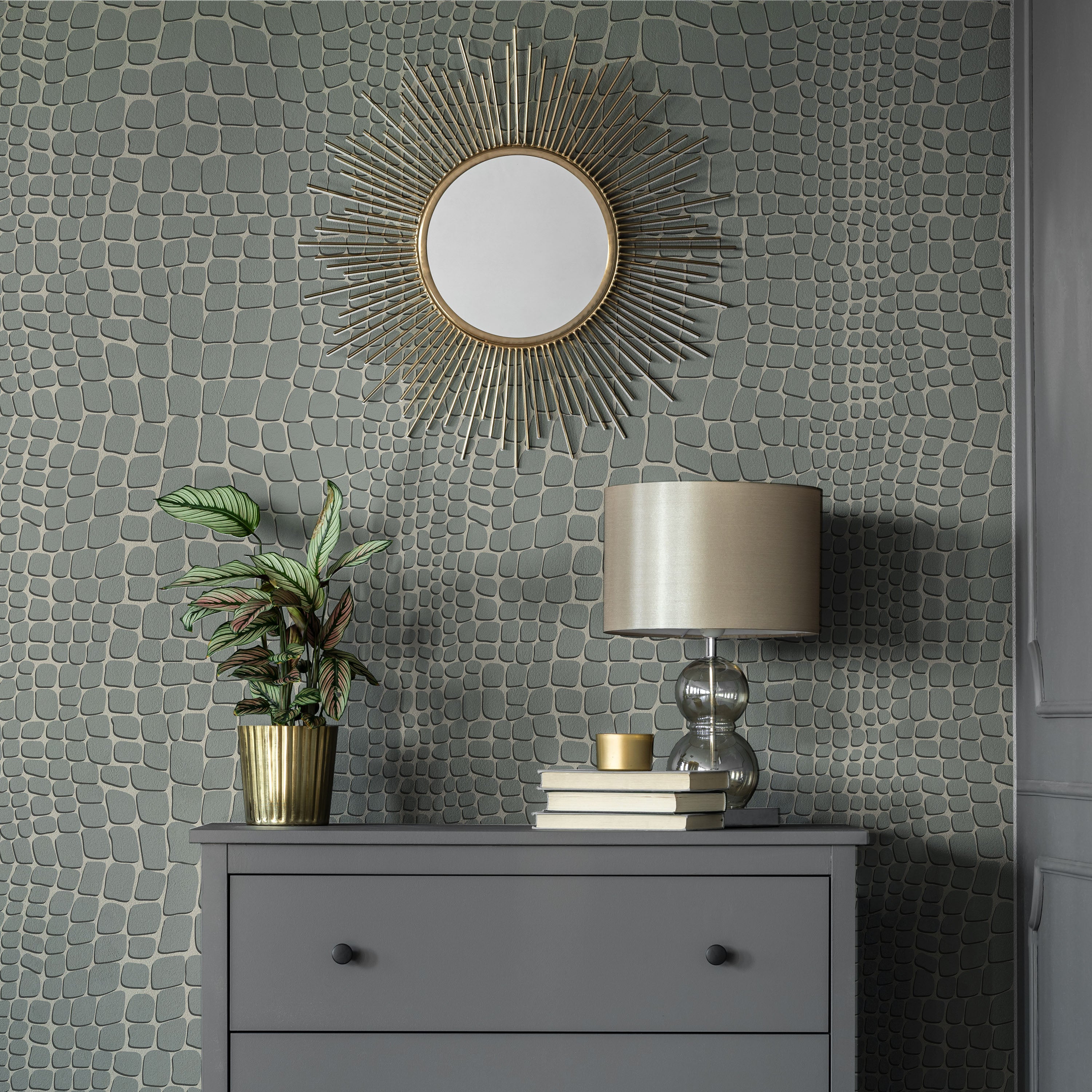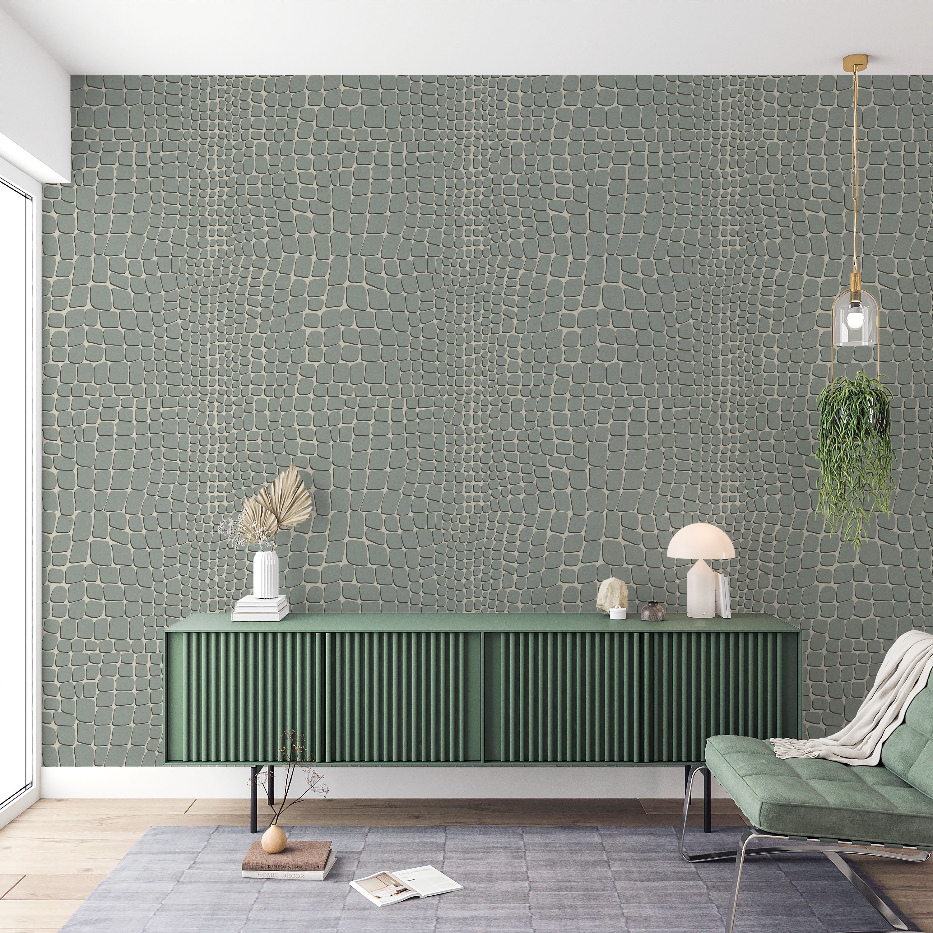 This sage green wallpaper captures the distinctive texture of crocodile skin with precision and artistry. The muted palette and dimensional pattern create understated luxury, making it an excellent choice for contemporary interiors that demand sophisticated, organic-inspired design elements.