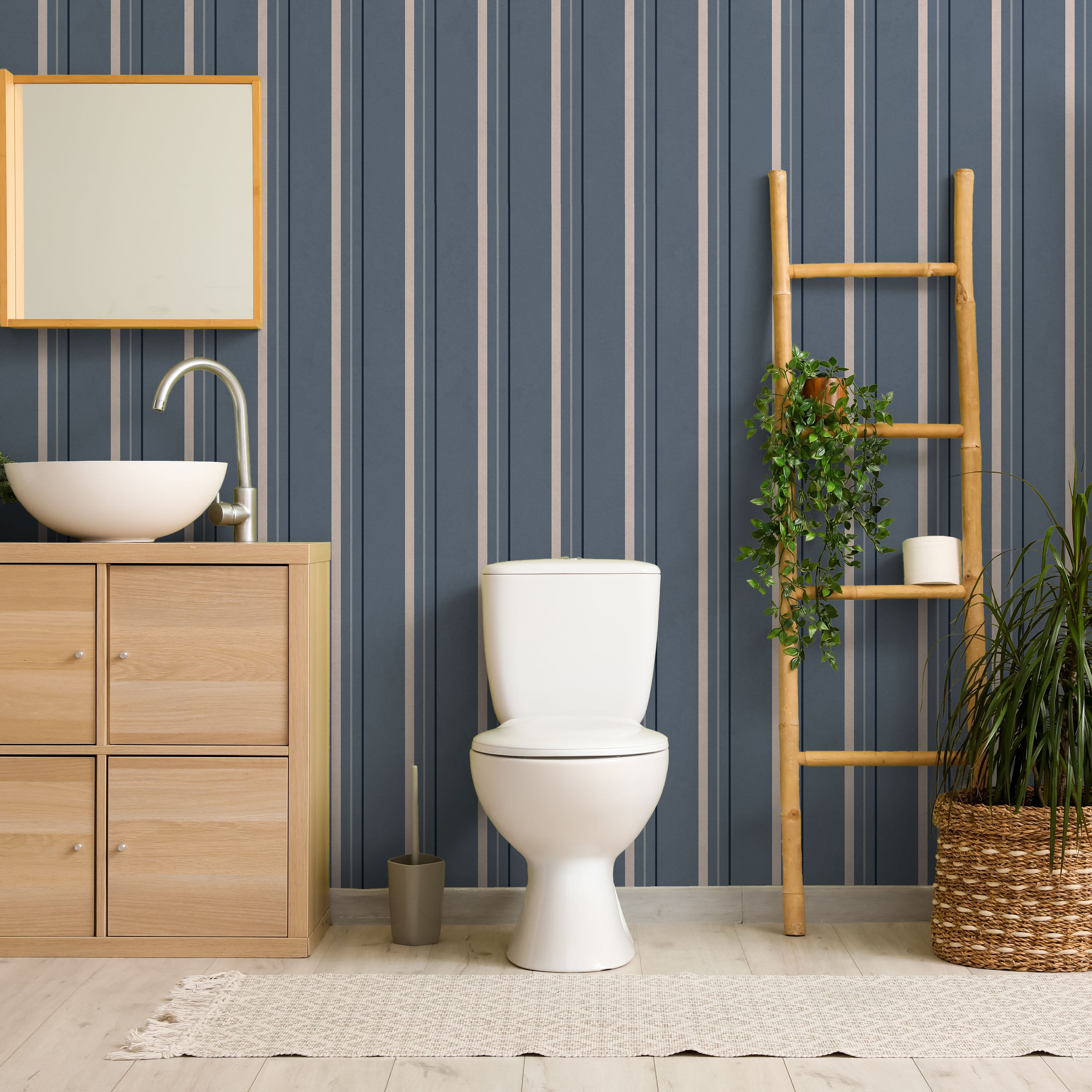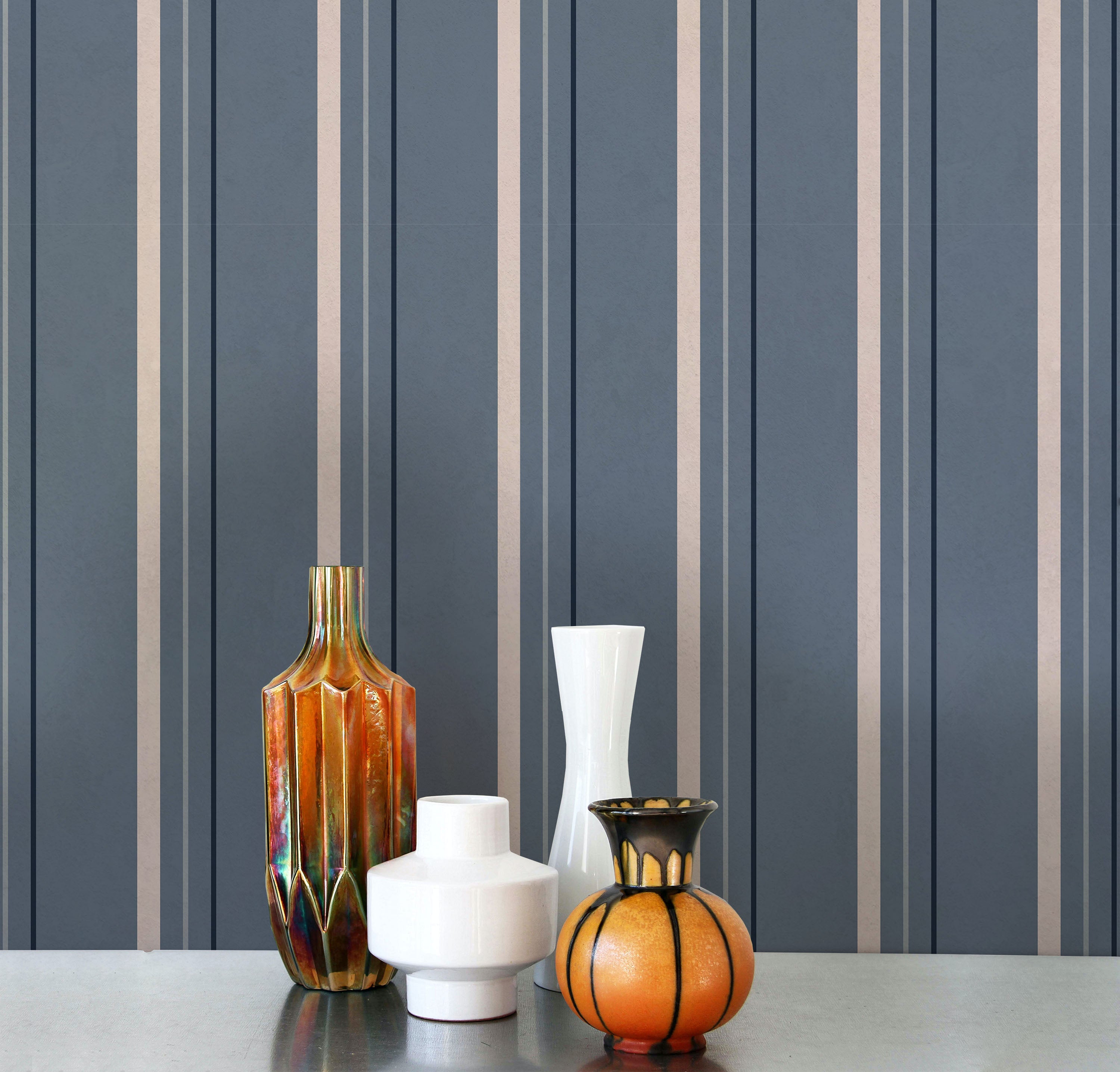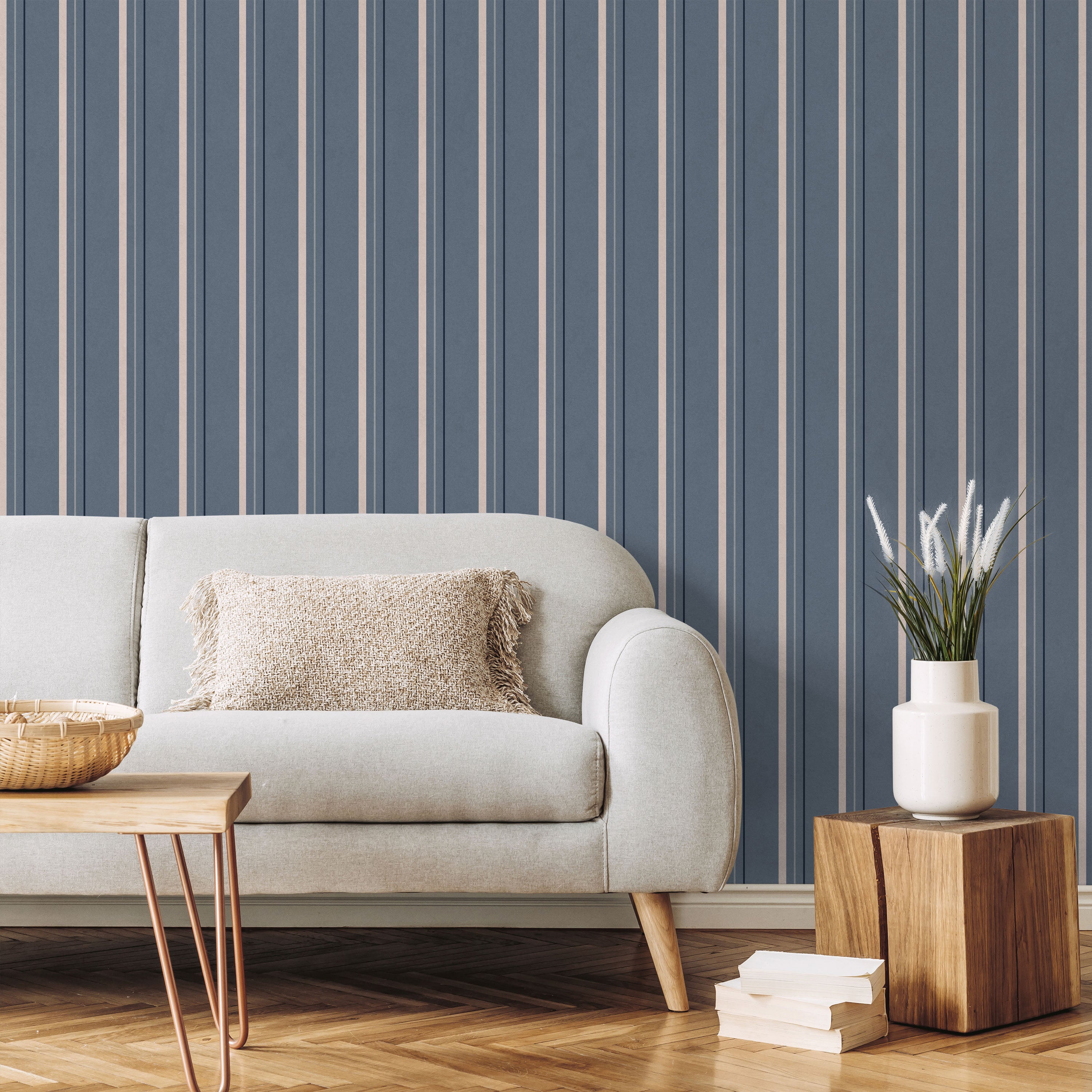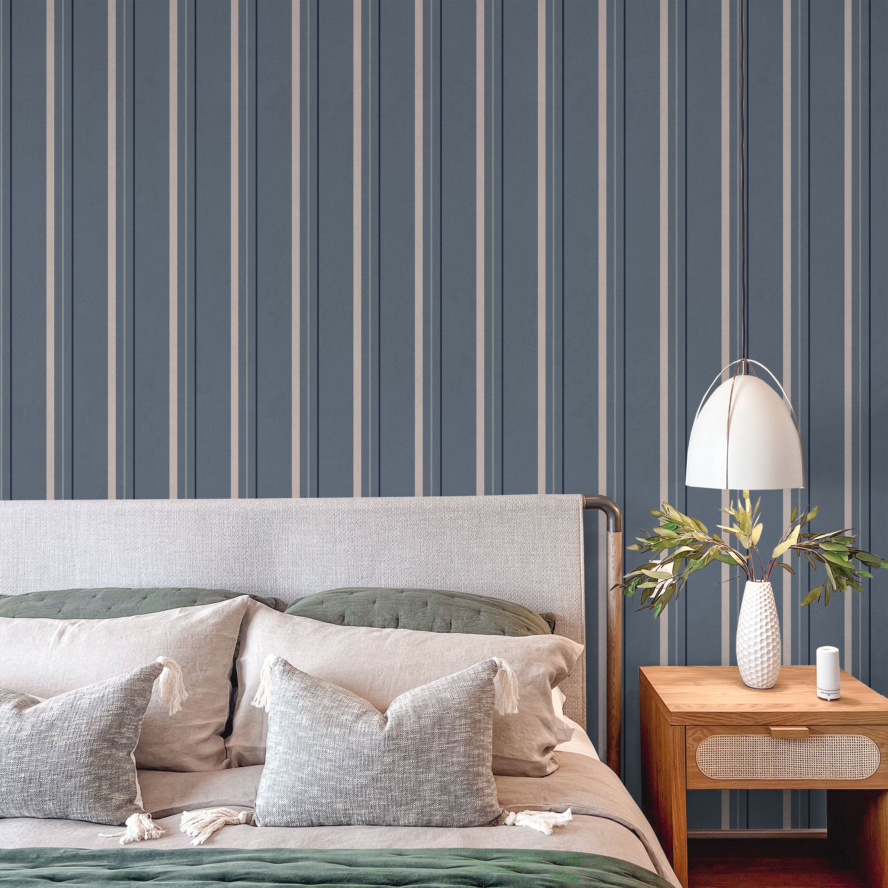 Vertical striping articulates a deep blue ground, establishing architectural presence and visual continuity. The linear pattern adds dimension without overwhelming, while the rich blue provides grounding warmth. Ideal for creating focused, composed spaces.