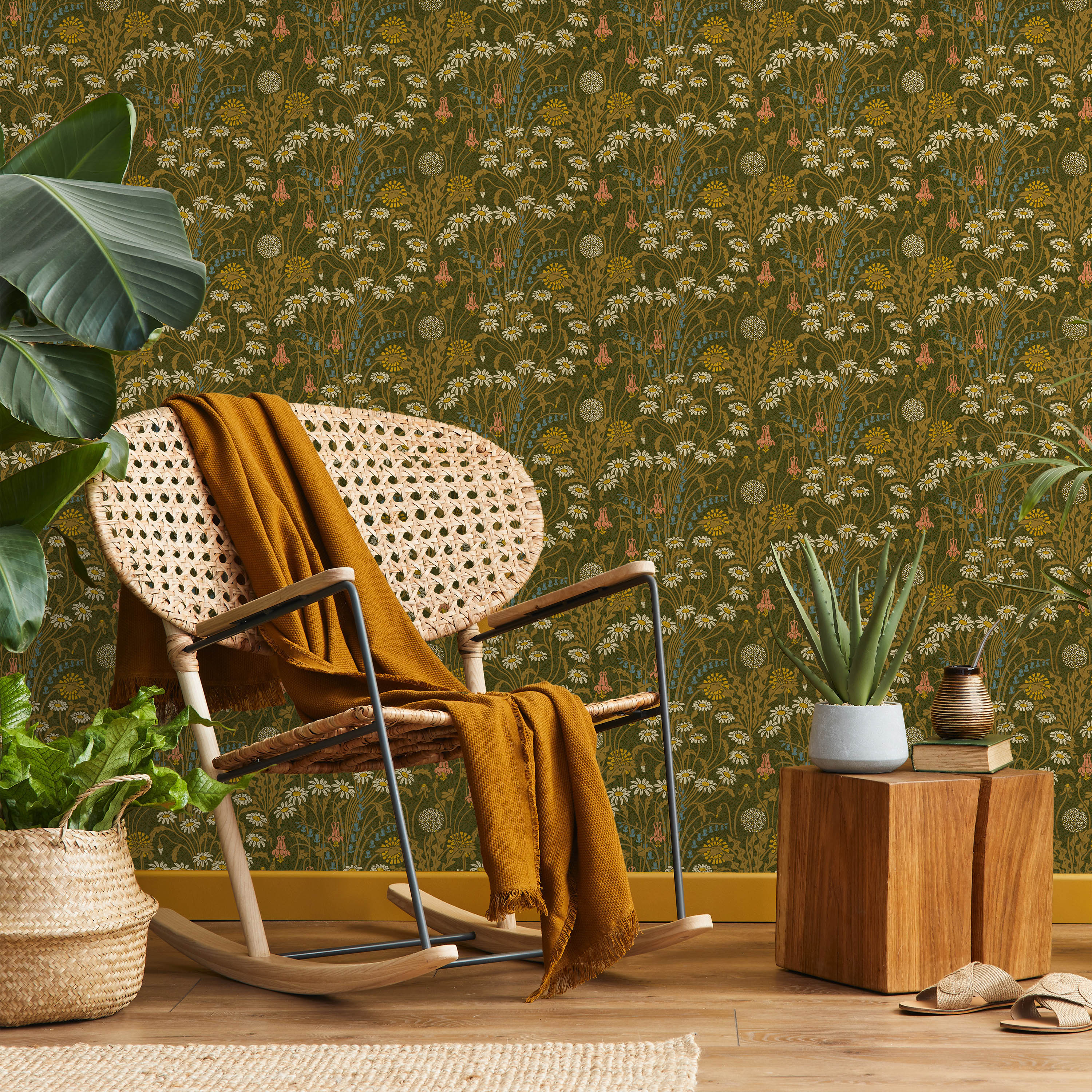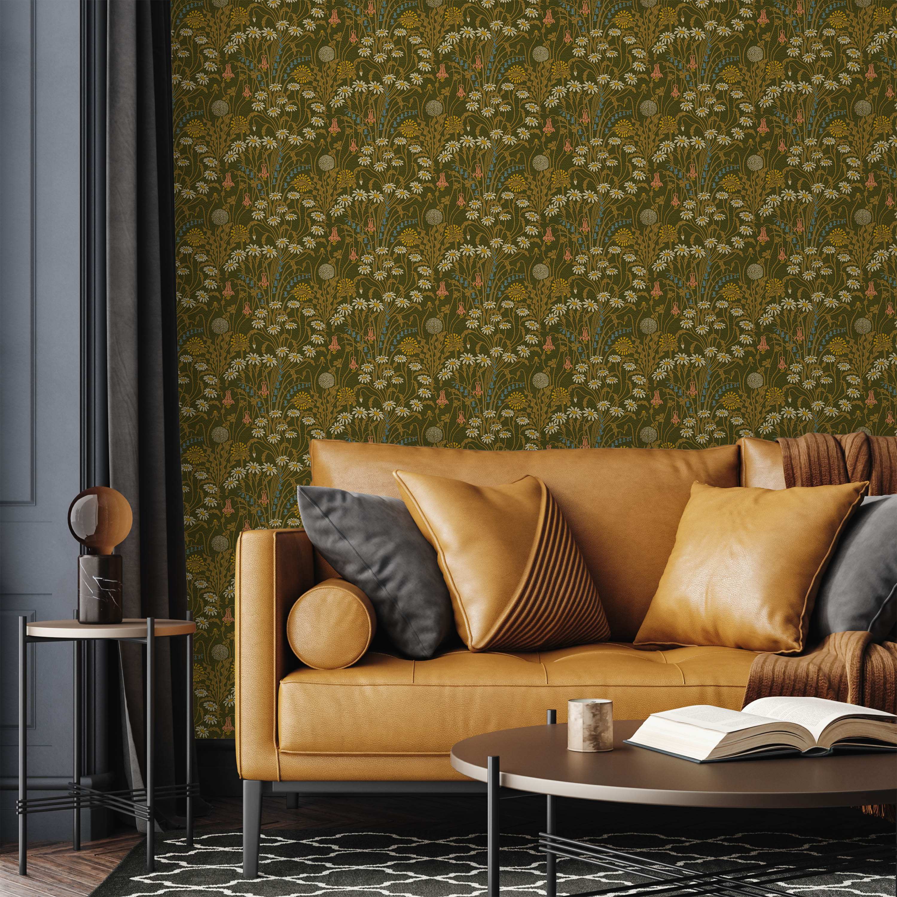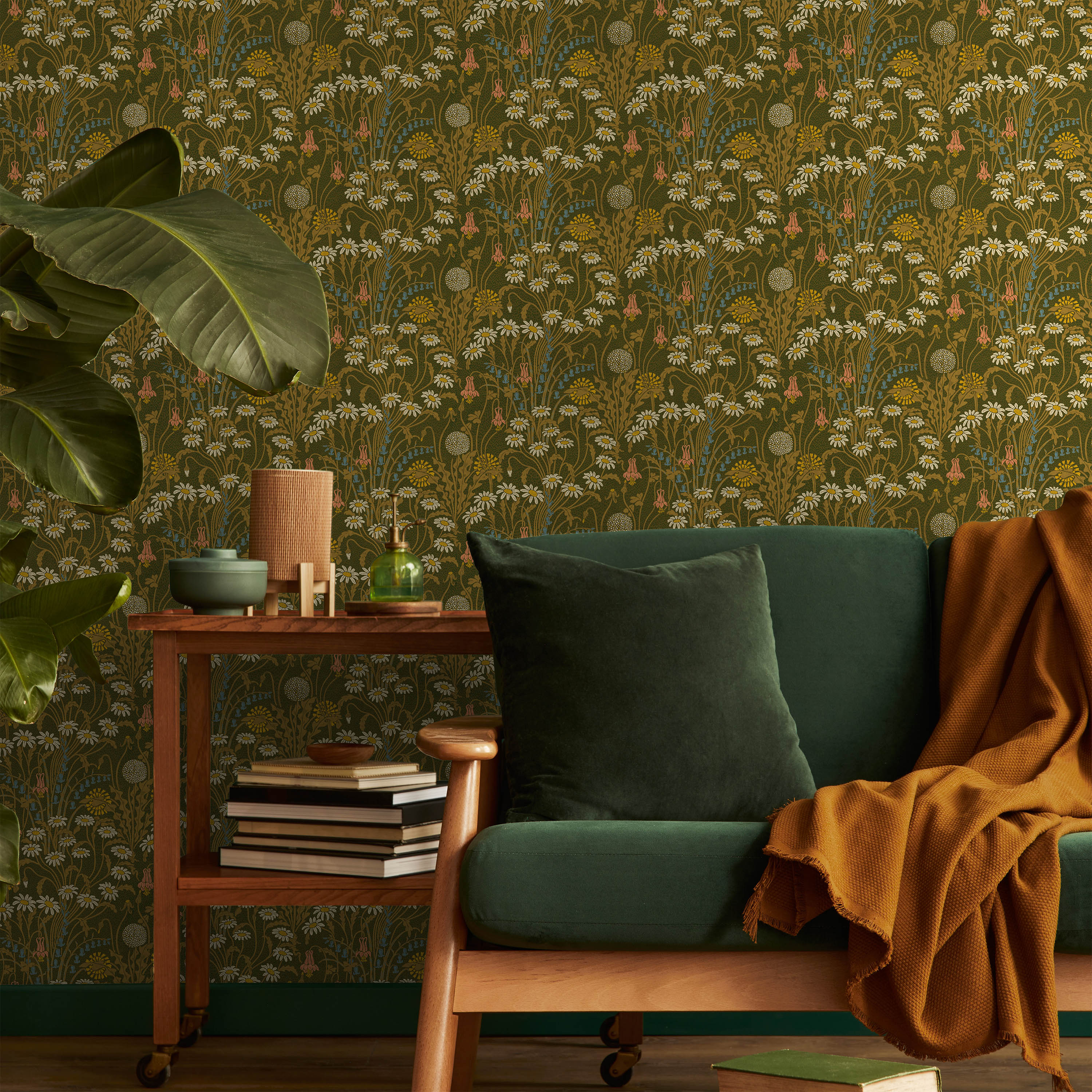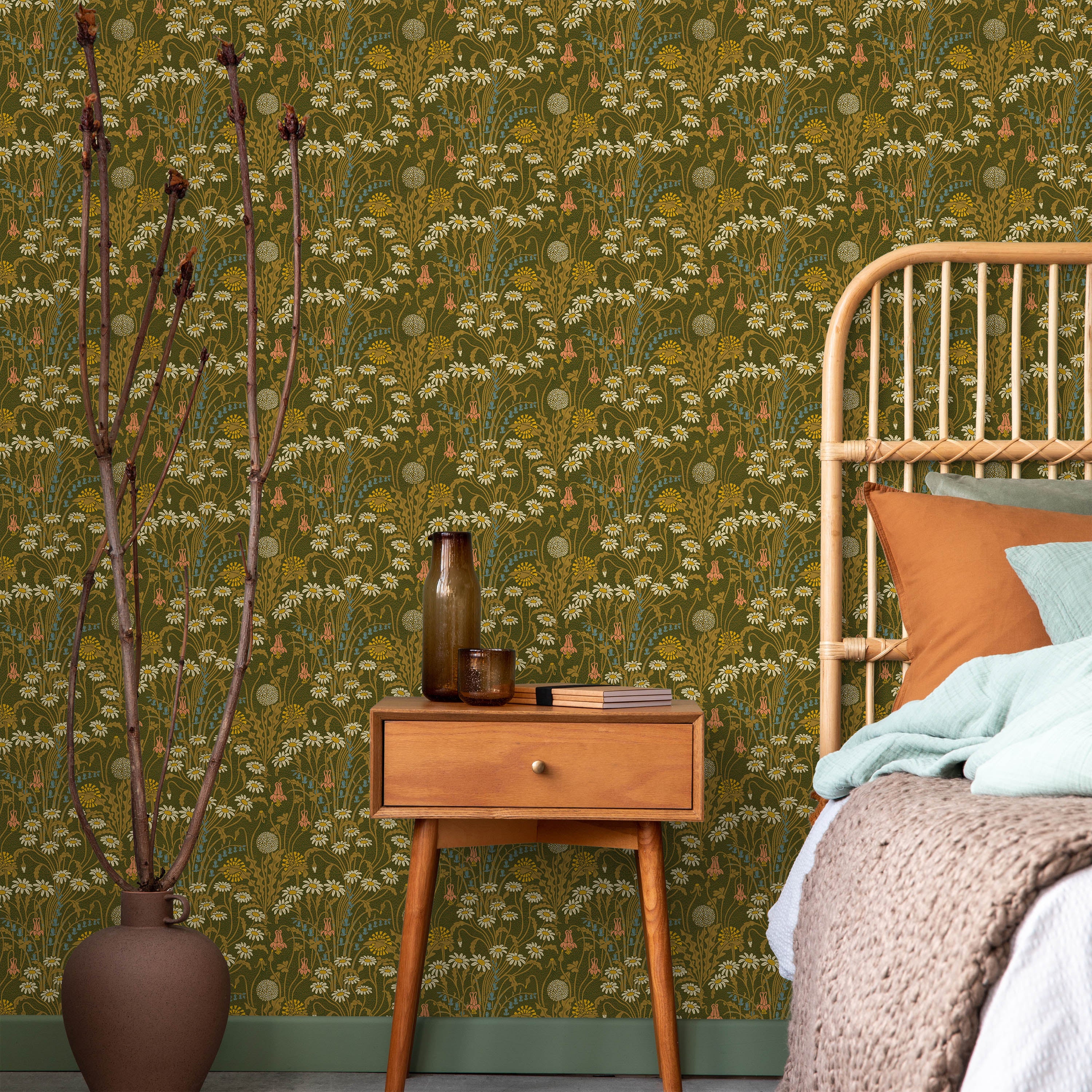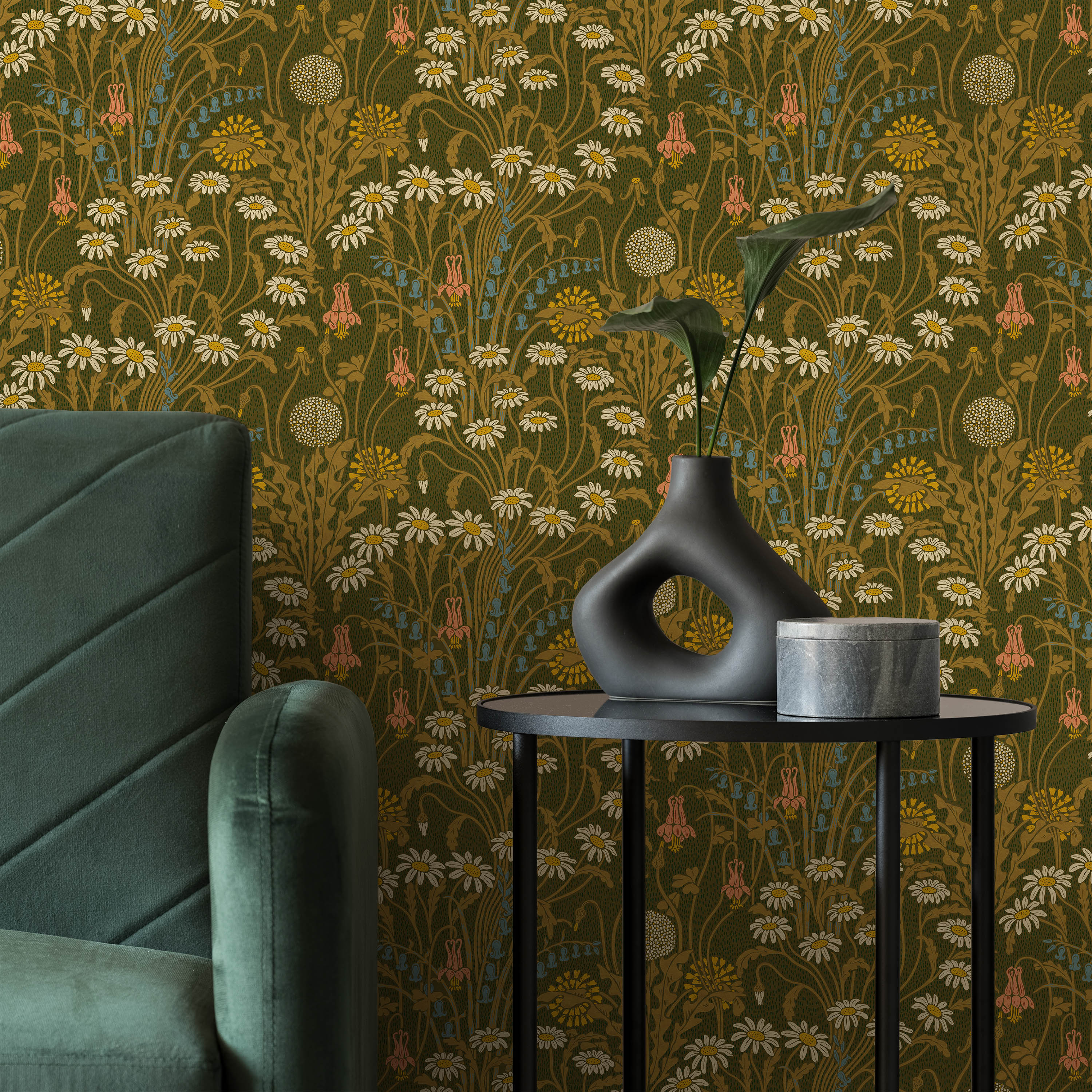 This botanical wallpaper showcases a refined composition of daisies and complementary wildflowers set against a verdant moss green ground. Drawing from classical design principles, it brings sophisticated natural beauty and period-authentic charm to interior spaces.