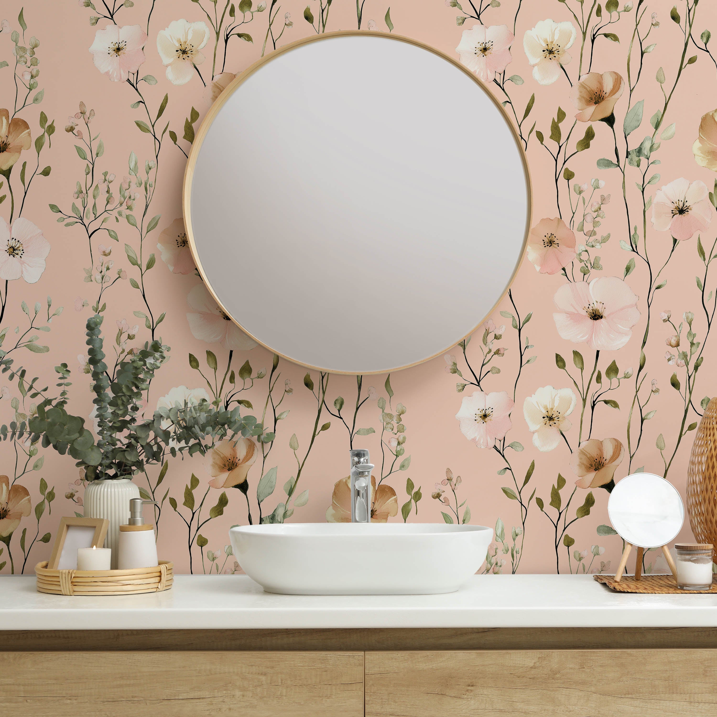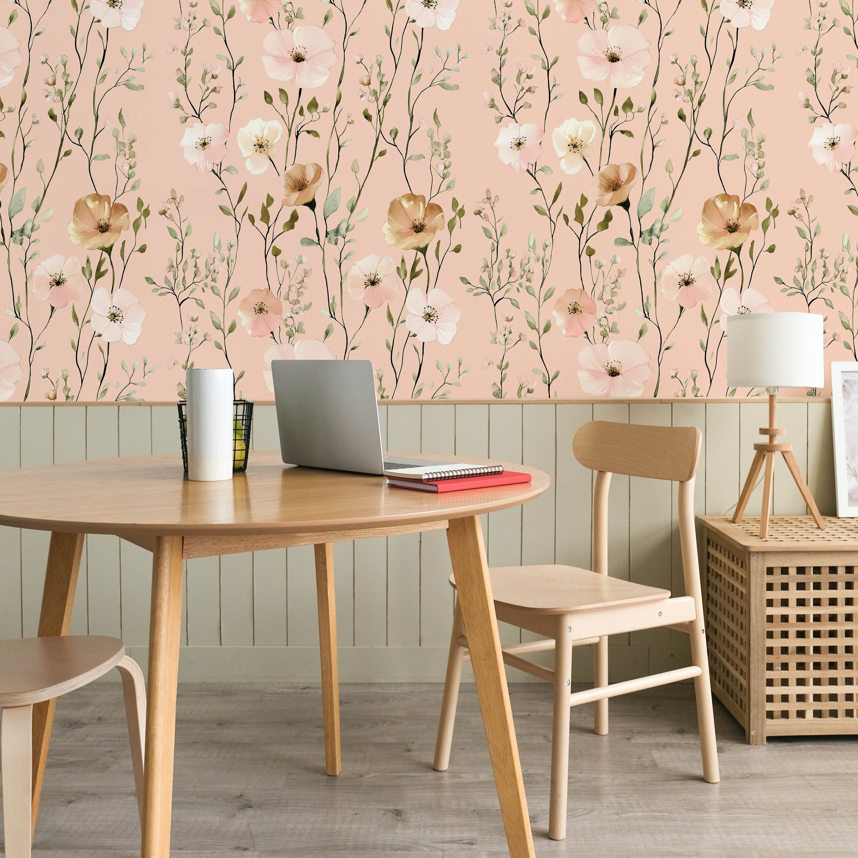 Delicate floral design featuring soft pink and white blooms against a serene light pink backdrop. This sophisticated wallpaper brings botanical elegance to any room, creating a calming atmosphere perfect for bedrooms, nurseries, or living spaces seeking refined, nature-inspired décor.